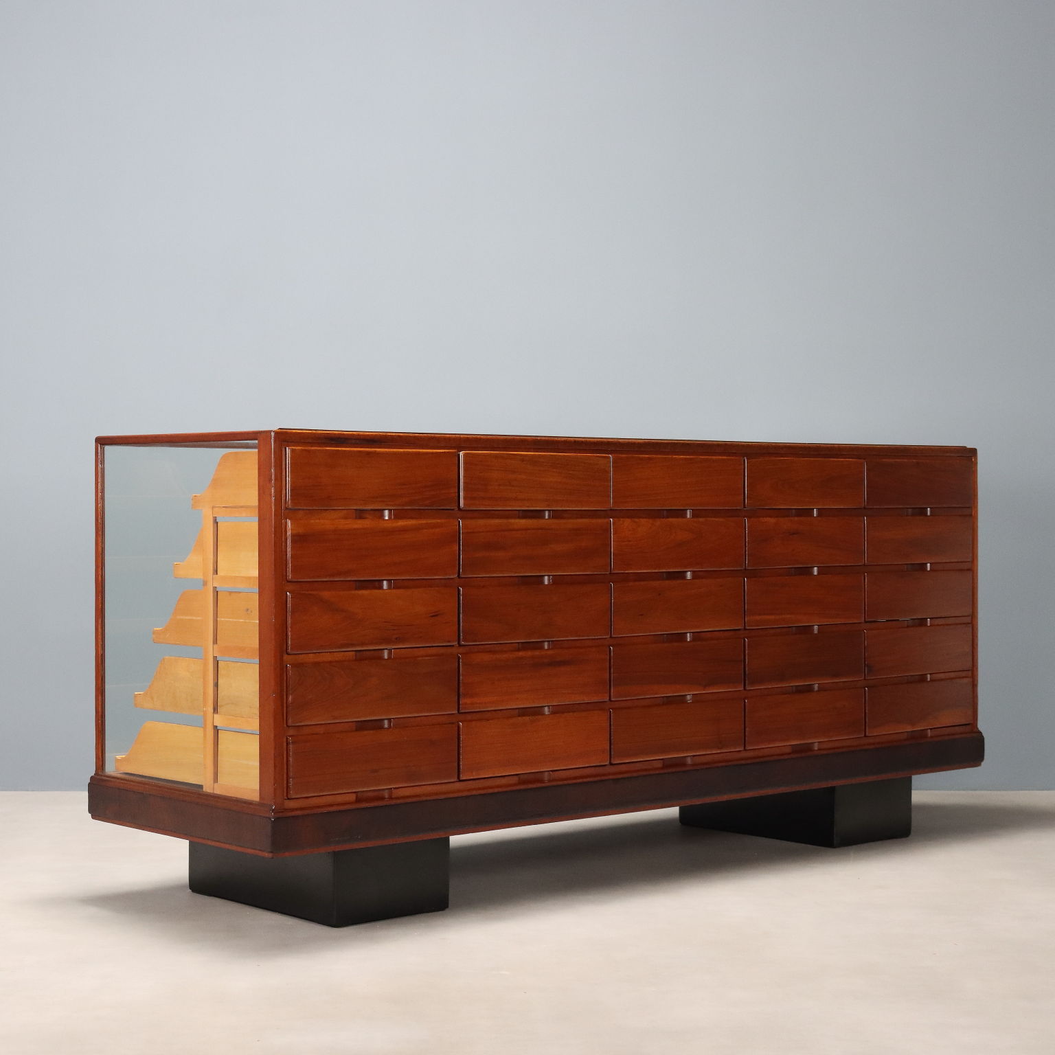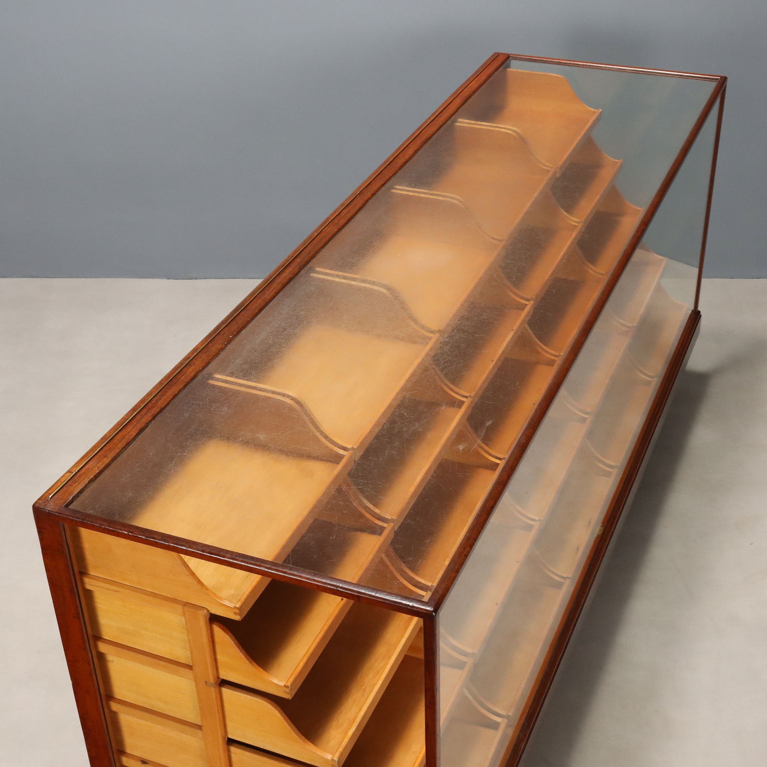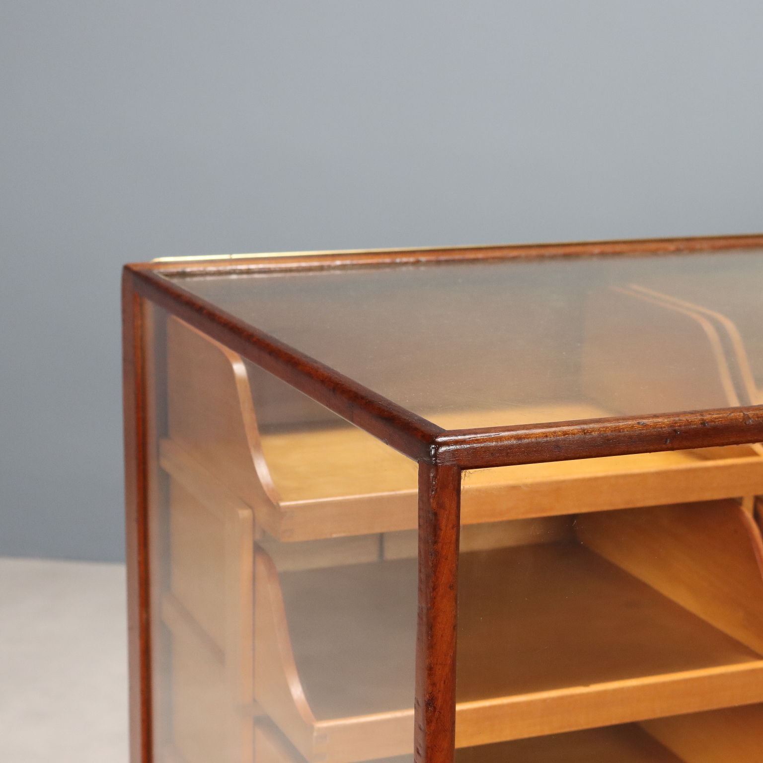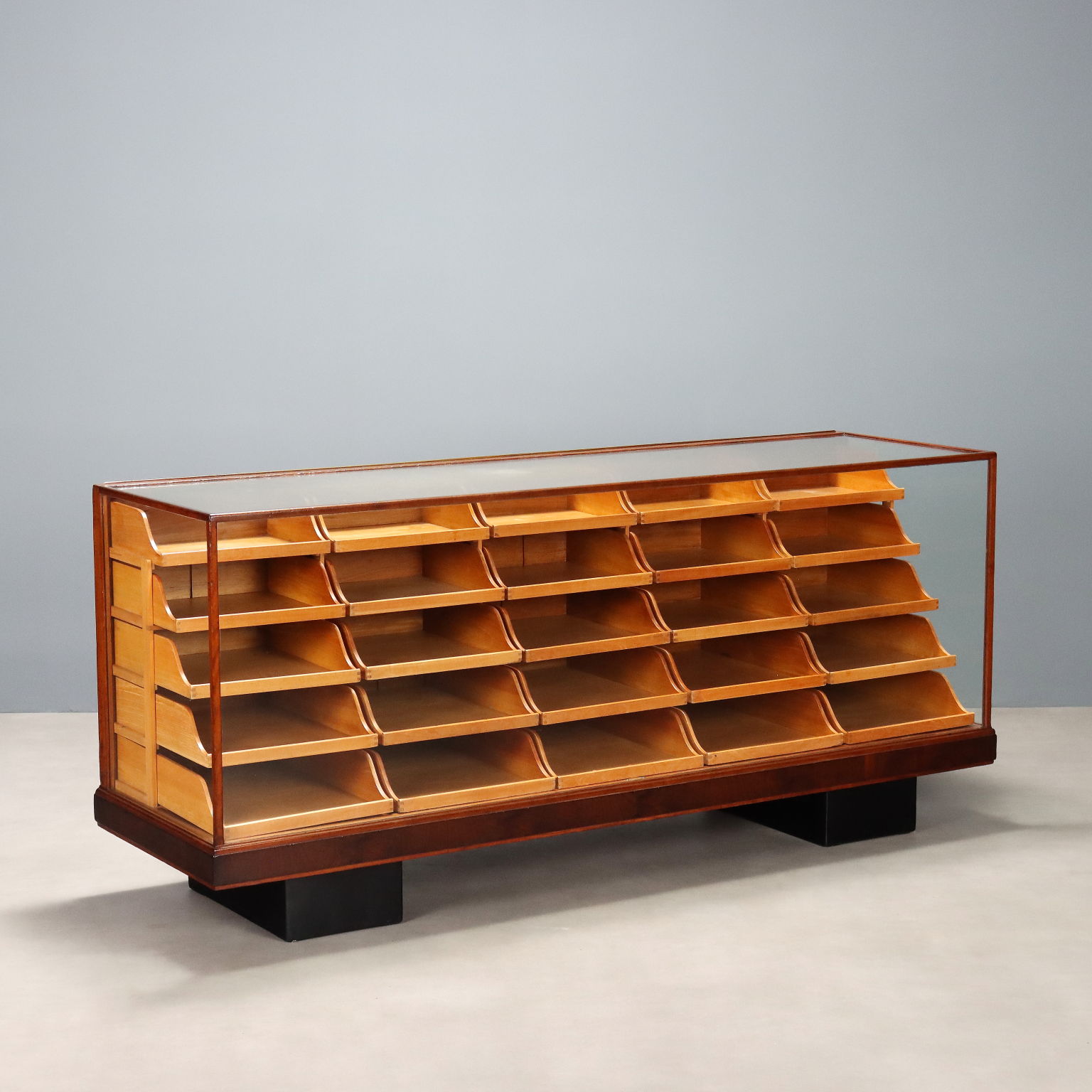 Elegante mobile espositore con struttura in legno, fronte, lati e piano in vetro, cinque file da cinque cassetti di differente profondità, gambe in legno tinto. Arredo restaurato nei nostri laboratori.