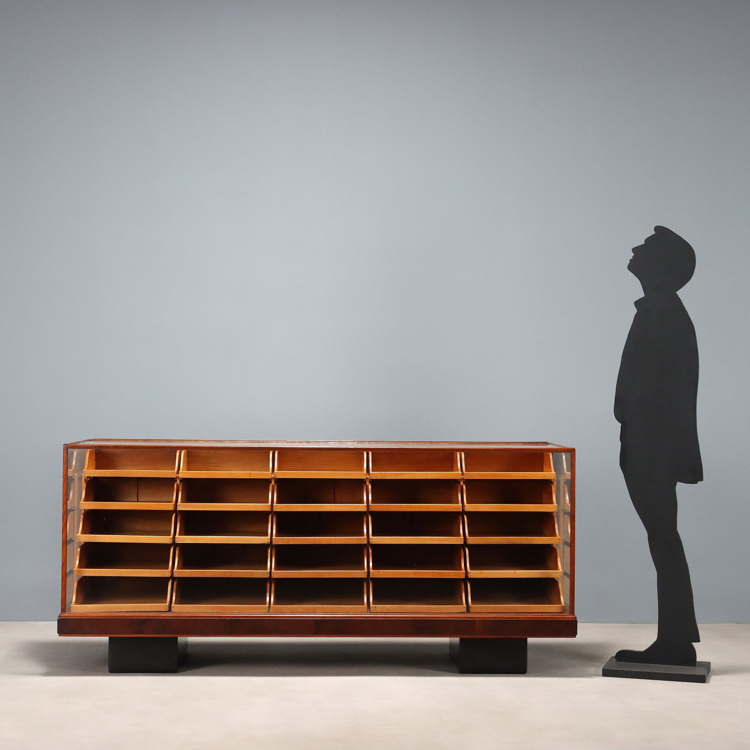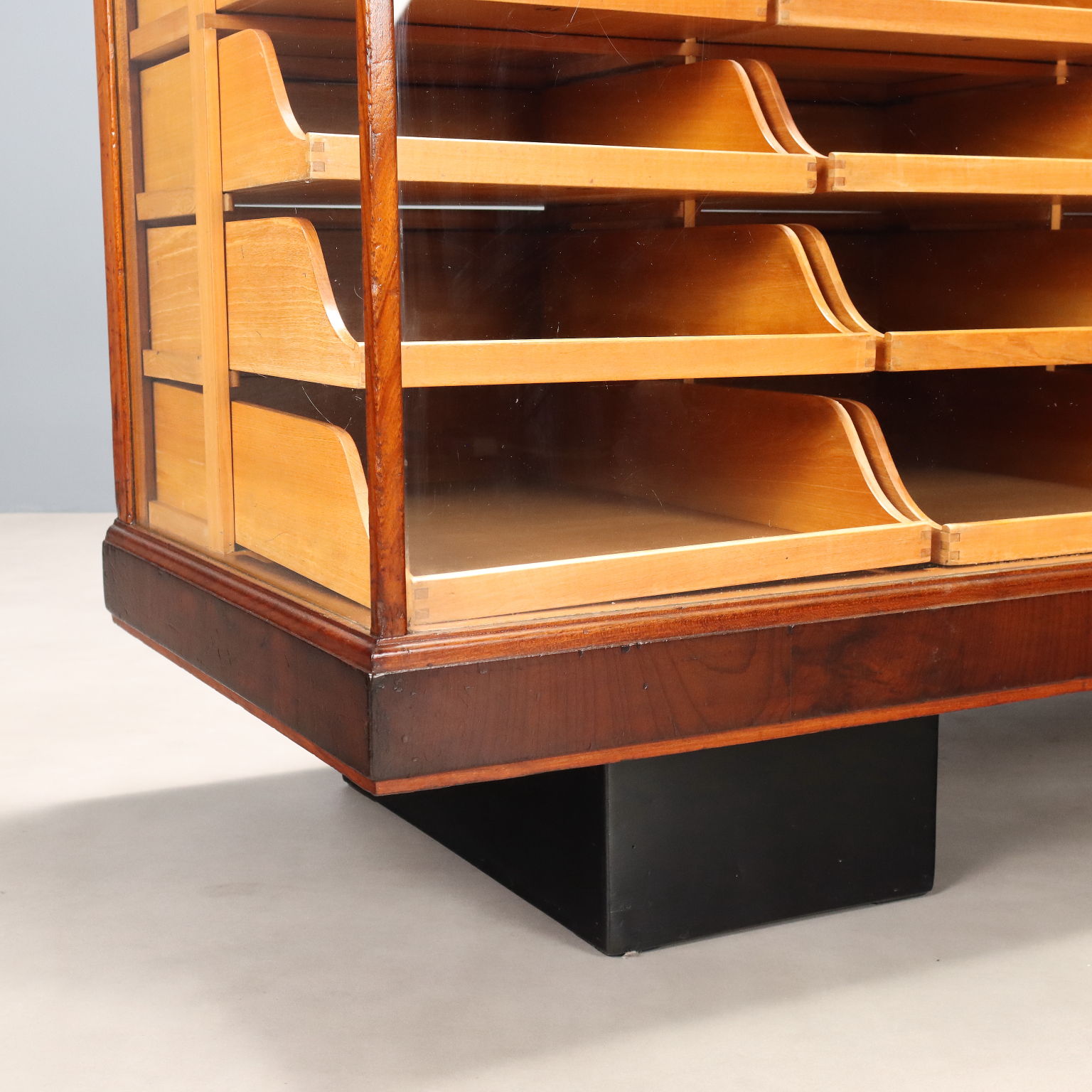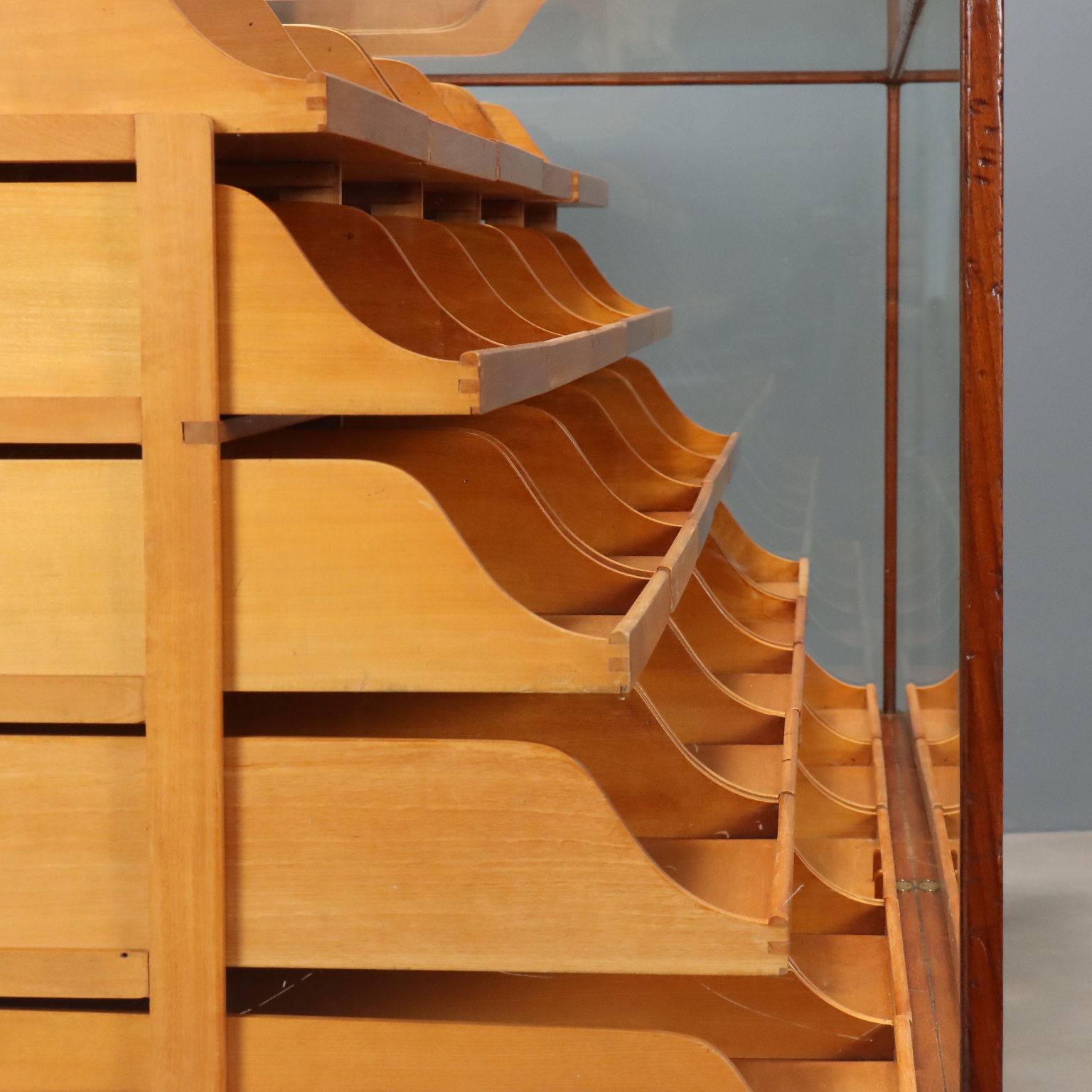 Elegante mobile espositore con struttura in legno, fronte, lati e piano in vetro, cinque file da cinque cassetti di differente profondità, gambe in legno tinto. Arredo restaurato nei nostri laboratori.