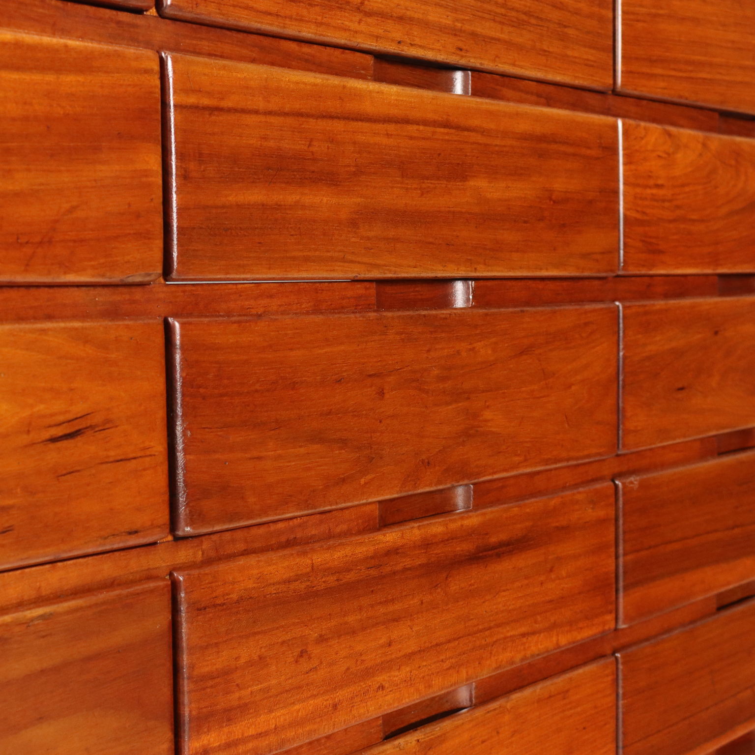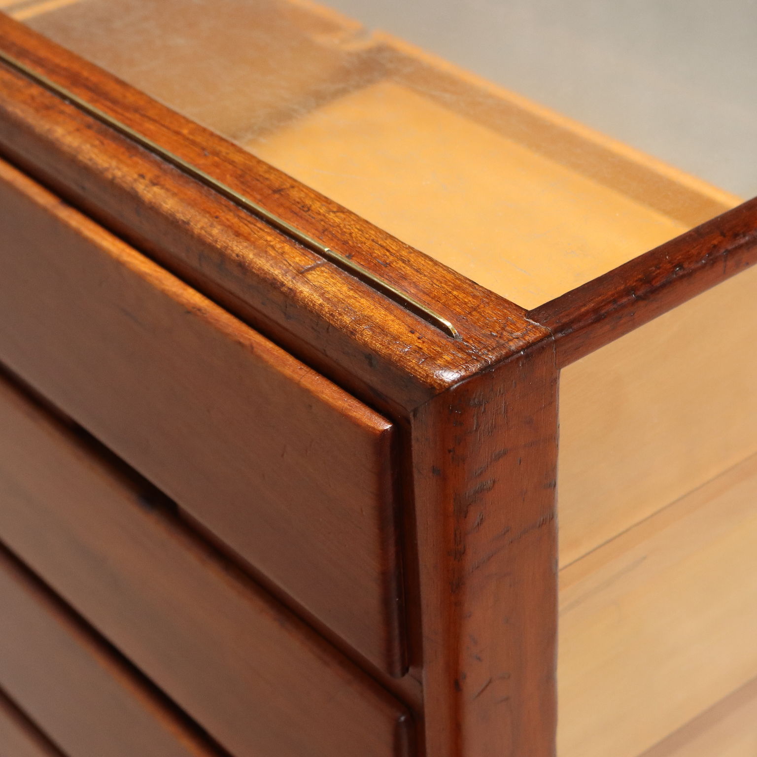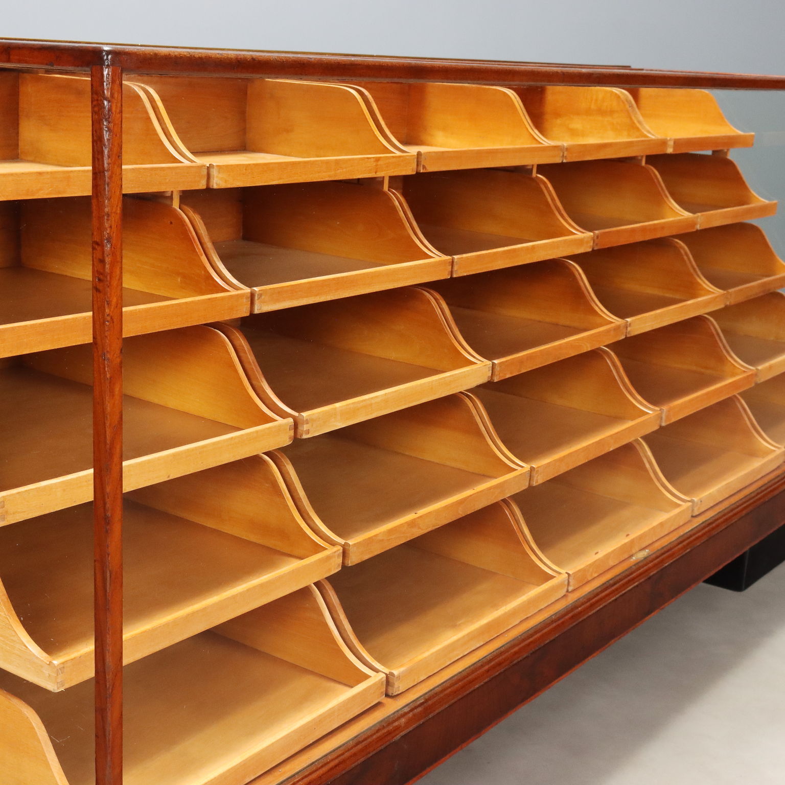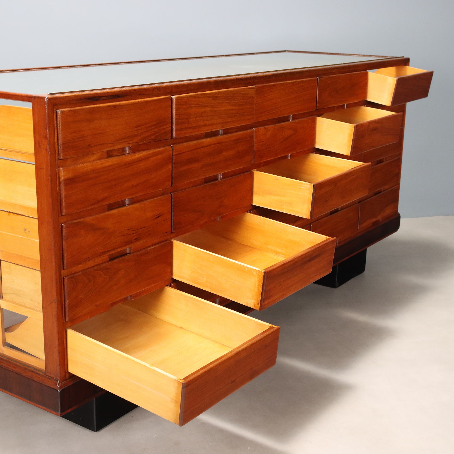 Elegante mobile espositore con struttura in legno, fronte, lati e piano in vetro, cinque file da cinque cassetti di differente profondità, gambe in legno tinto. Arredo restaurato nei nostri laboratori.