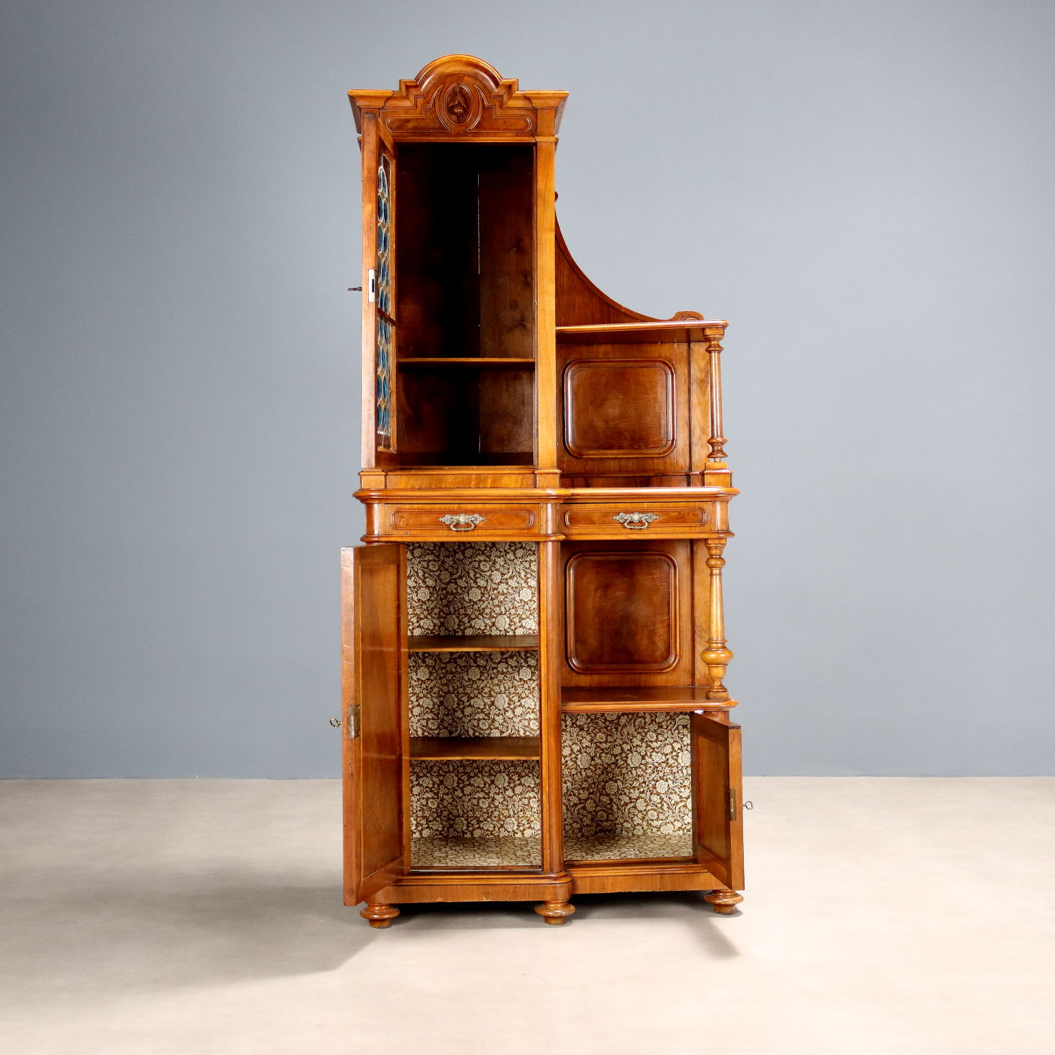 Credenzino Umbertino in noce. Alzata con anta a vetri colorati piombati e ripiano sorretto da colonna tornita. Base con cassetti sotto piano, ante e vano a giorno. Italia, fine XIX Secolo.
