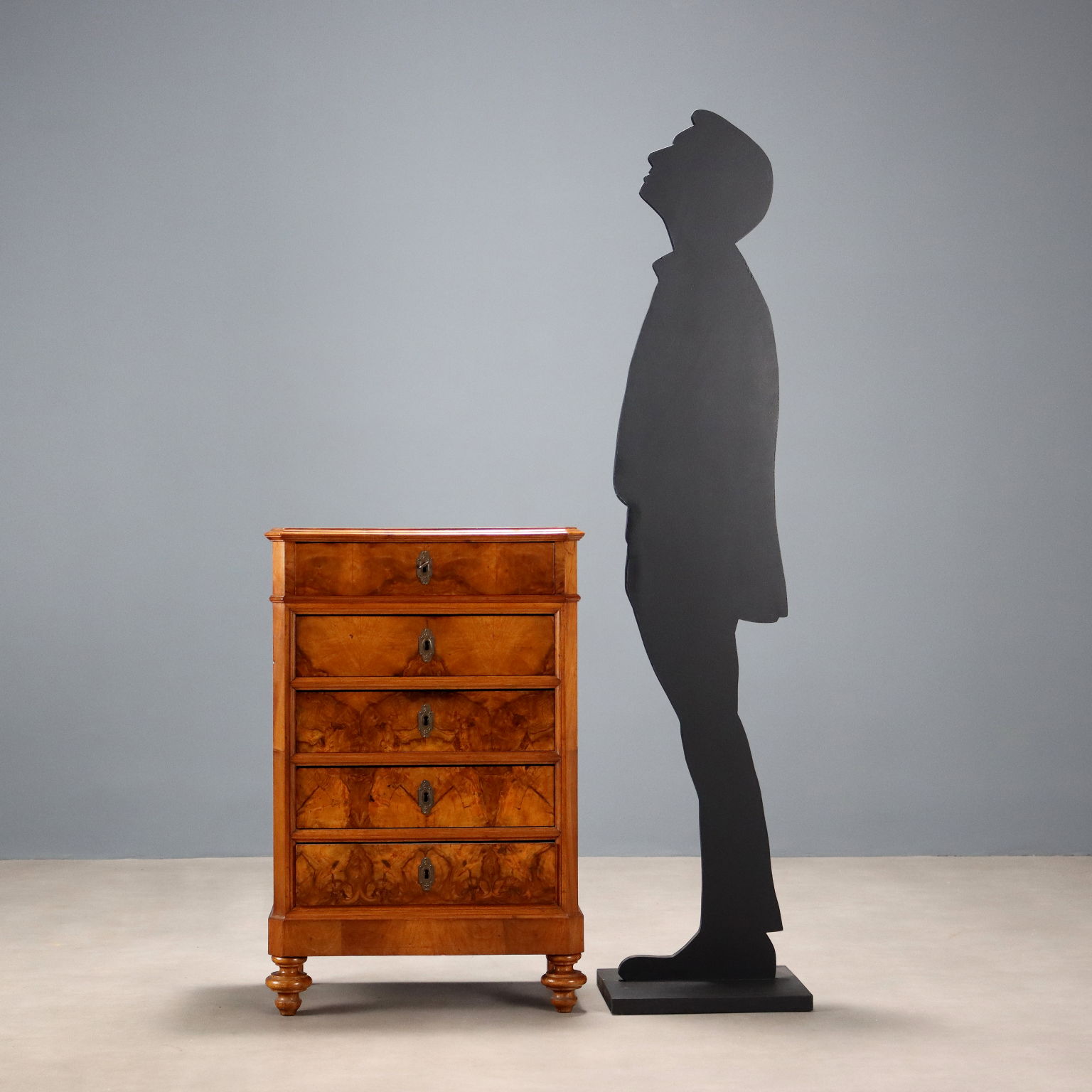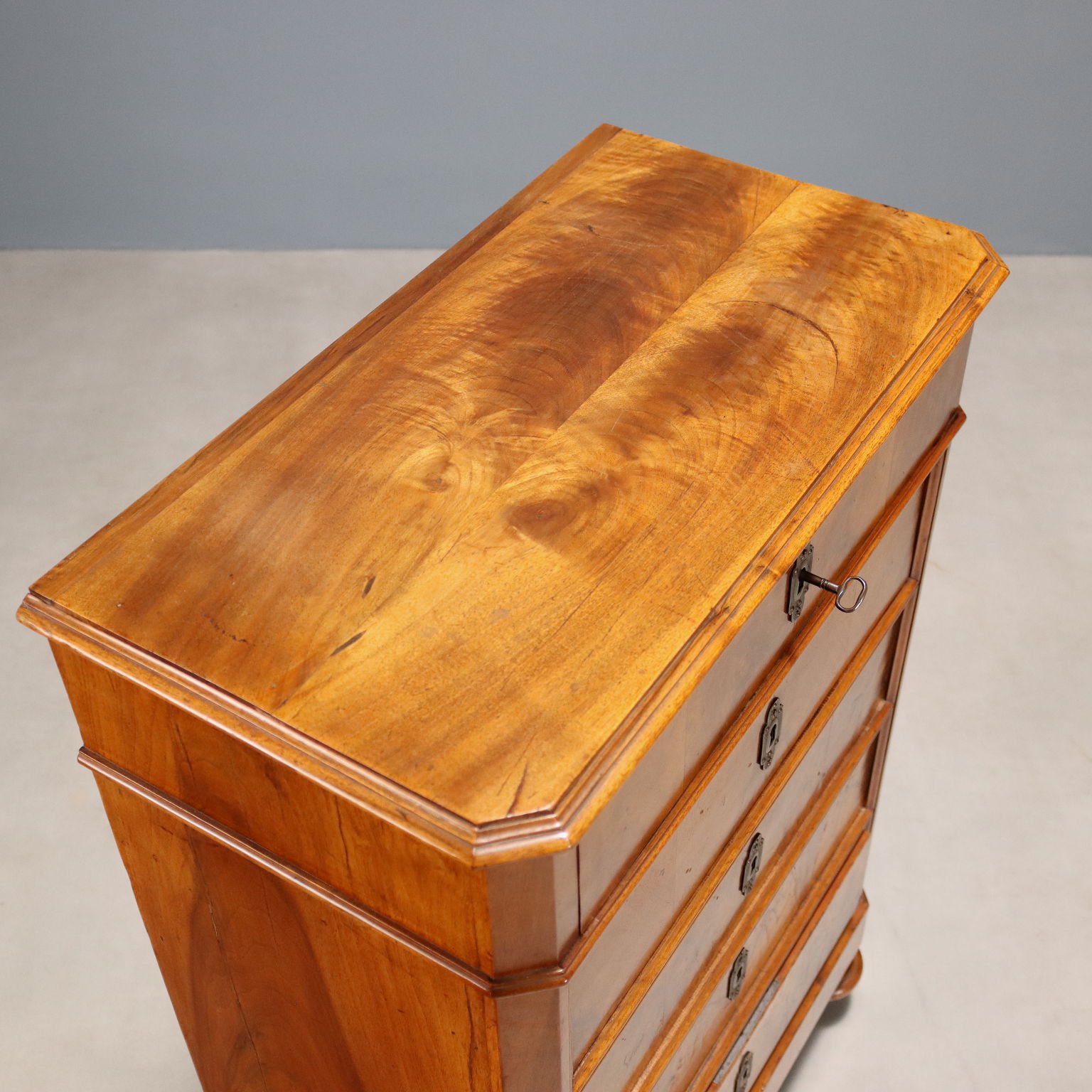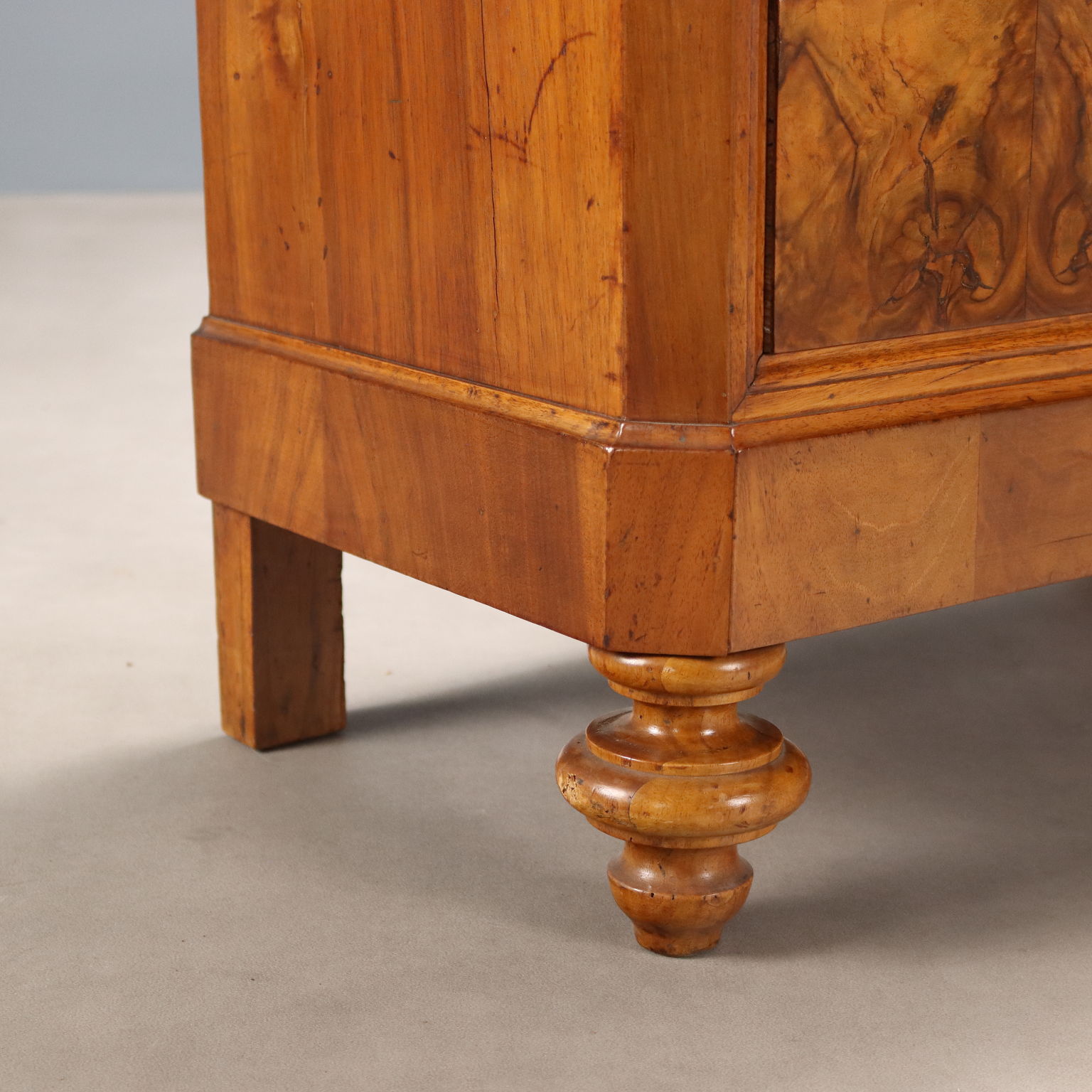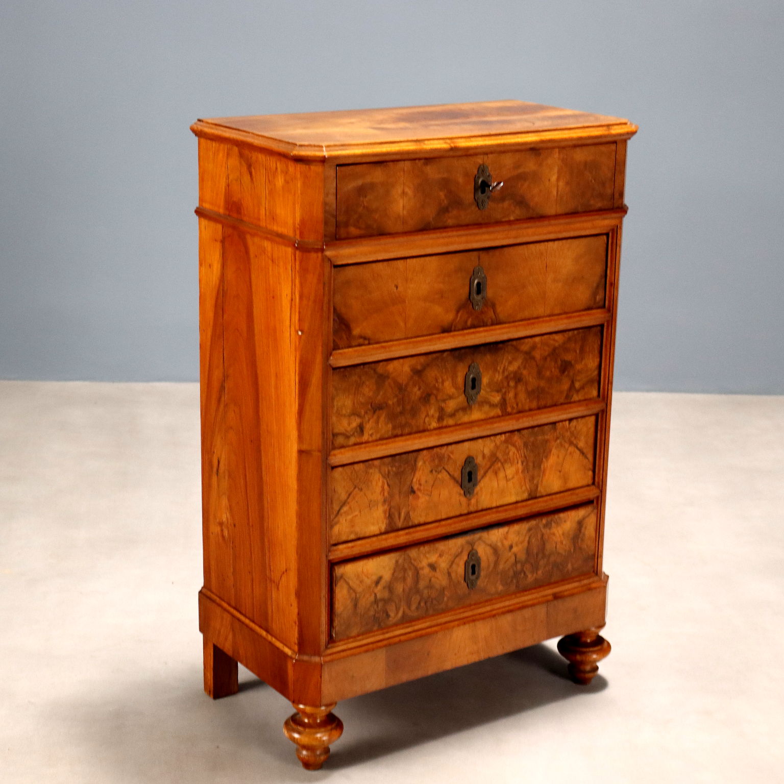 Piccola cassettiera Umbertina in noce e piuma di noce. Fronte a cinque cassetti di cui il primo nella fascia sotto piano. Piedi torniti, bocchette sostituite e interni in abete. Italia, fine XIX Secolo.