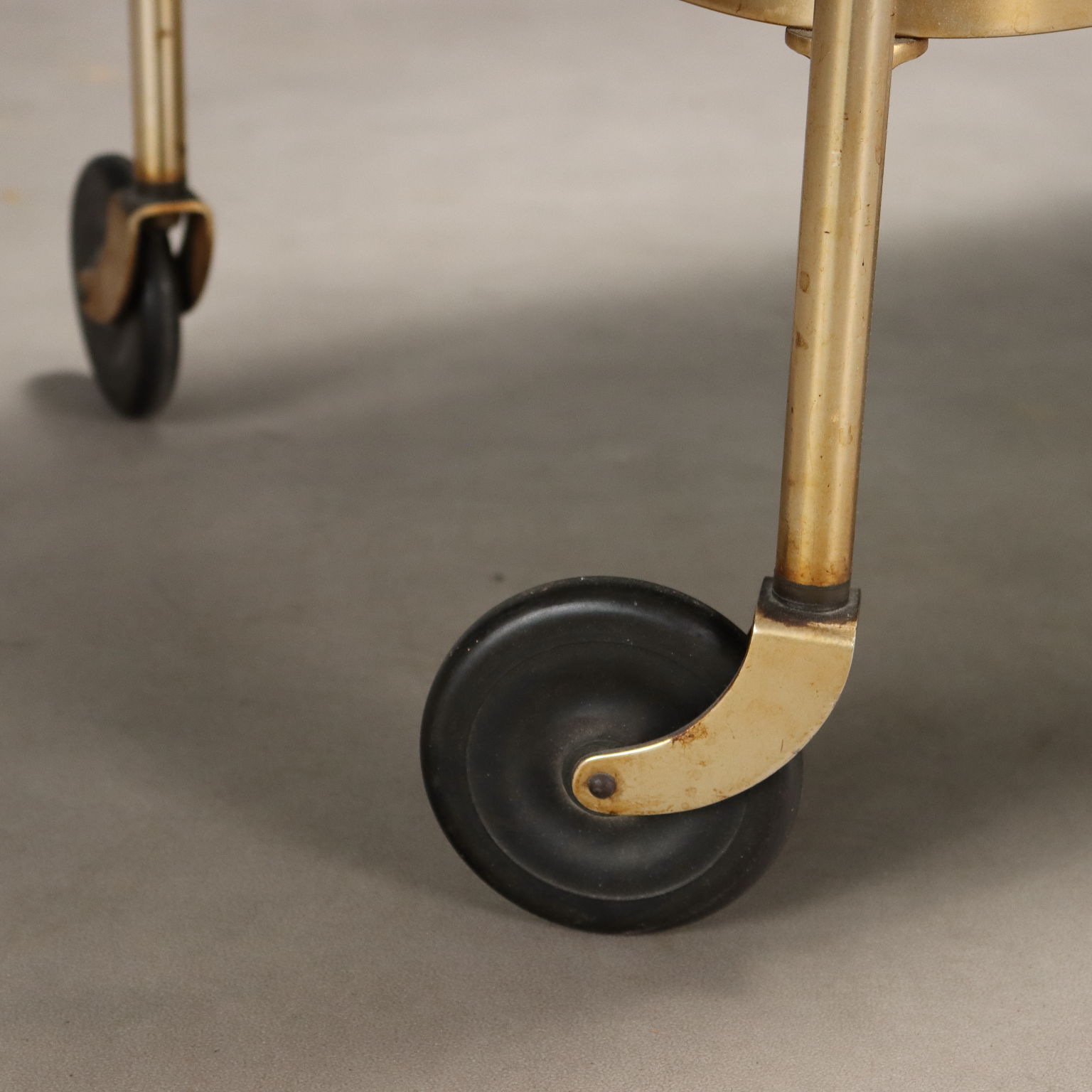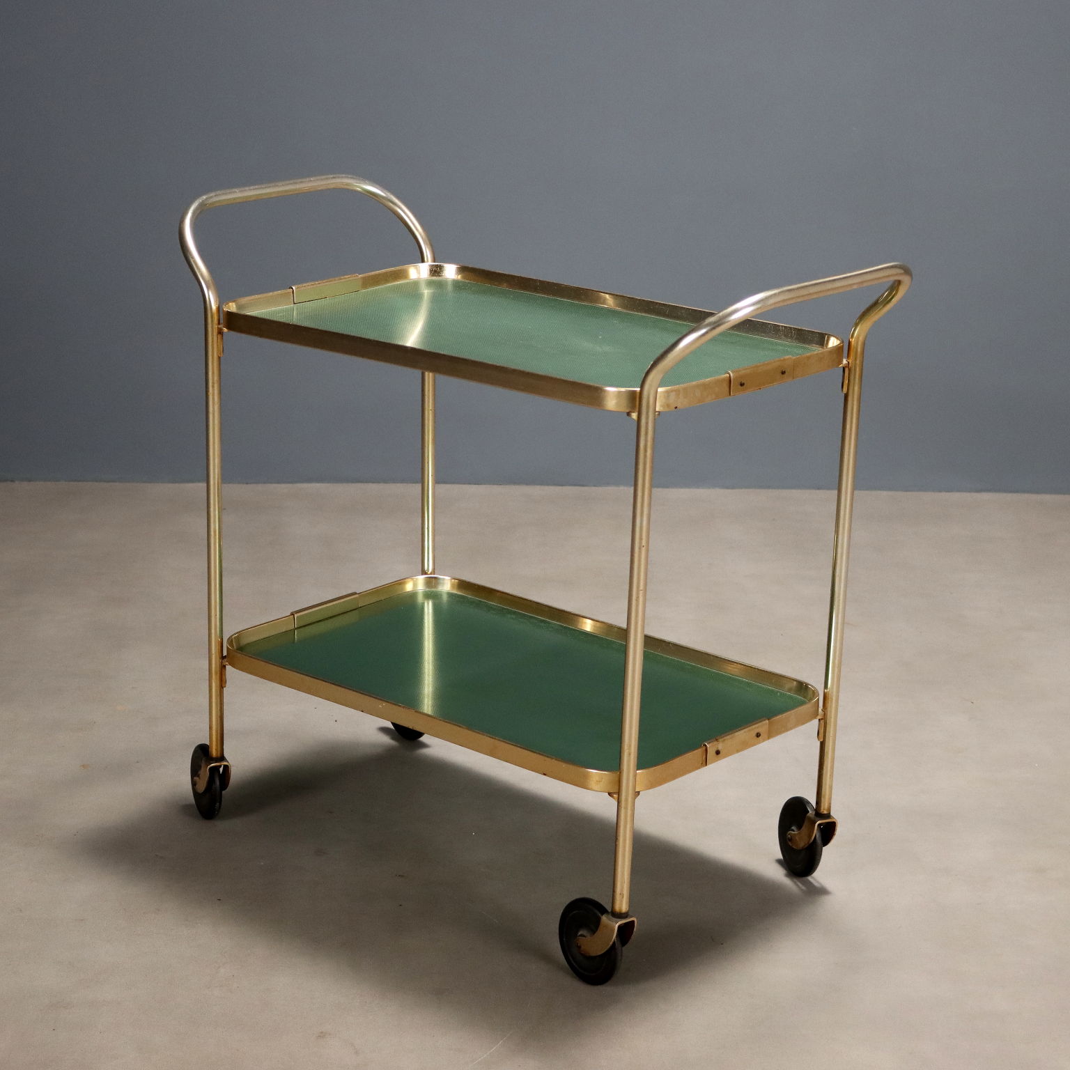 Carrellino di servizio vintage in metallo ottonato con rotelle e doppio piano verde.