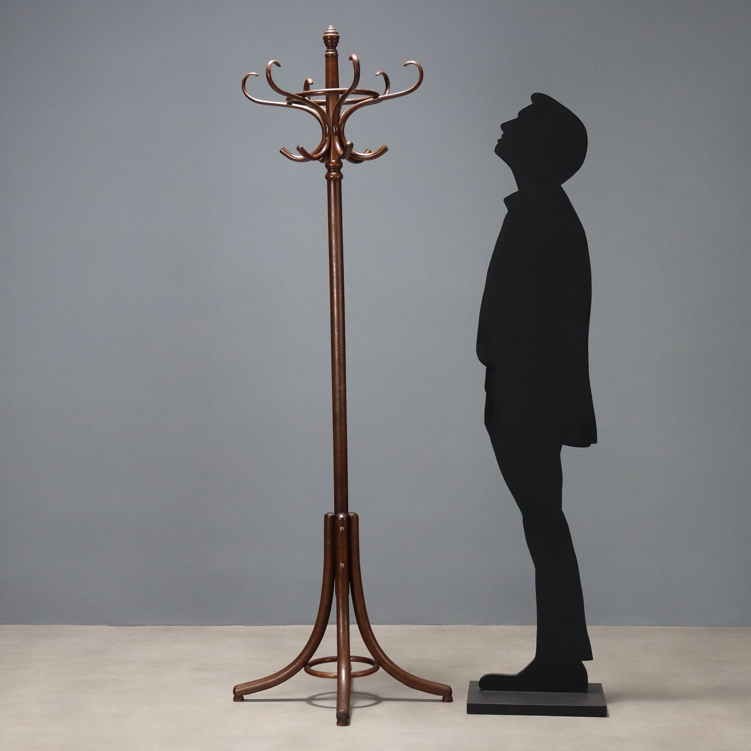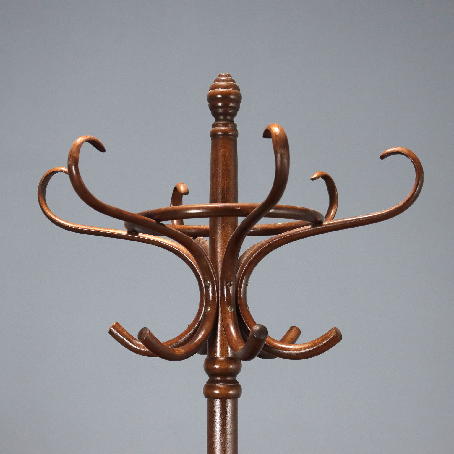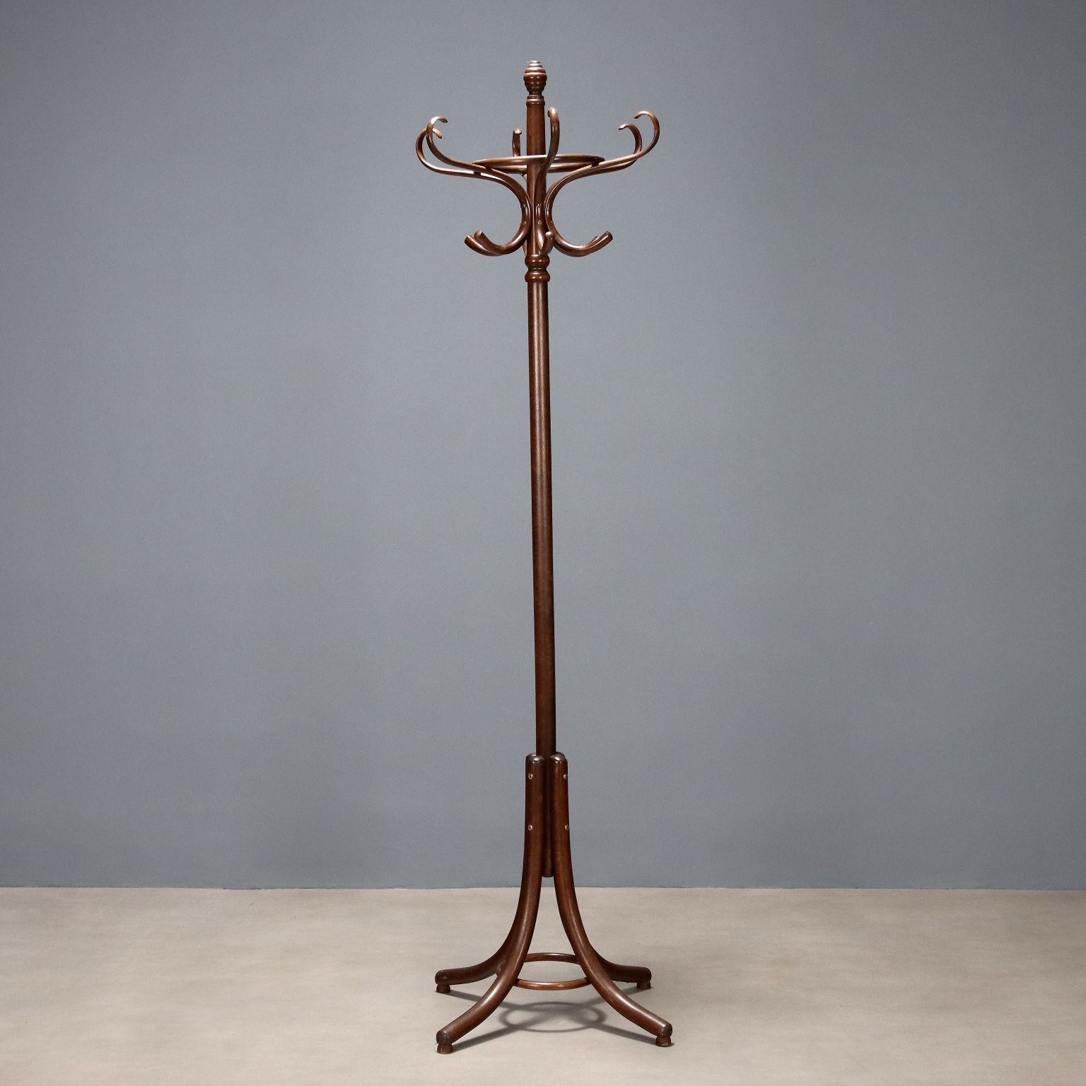 Appendiabiti in stile Thonet, in faggio ricurvo tinto noce. Produzione DREVOUNIA. Cecoslovacchia, terzo quarto XX Secolo.