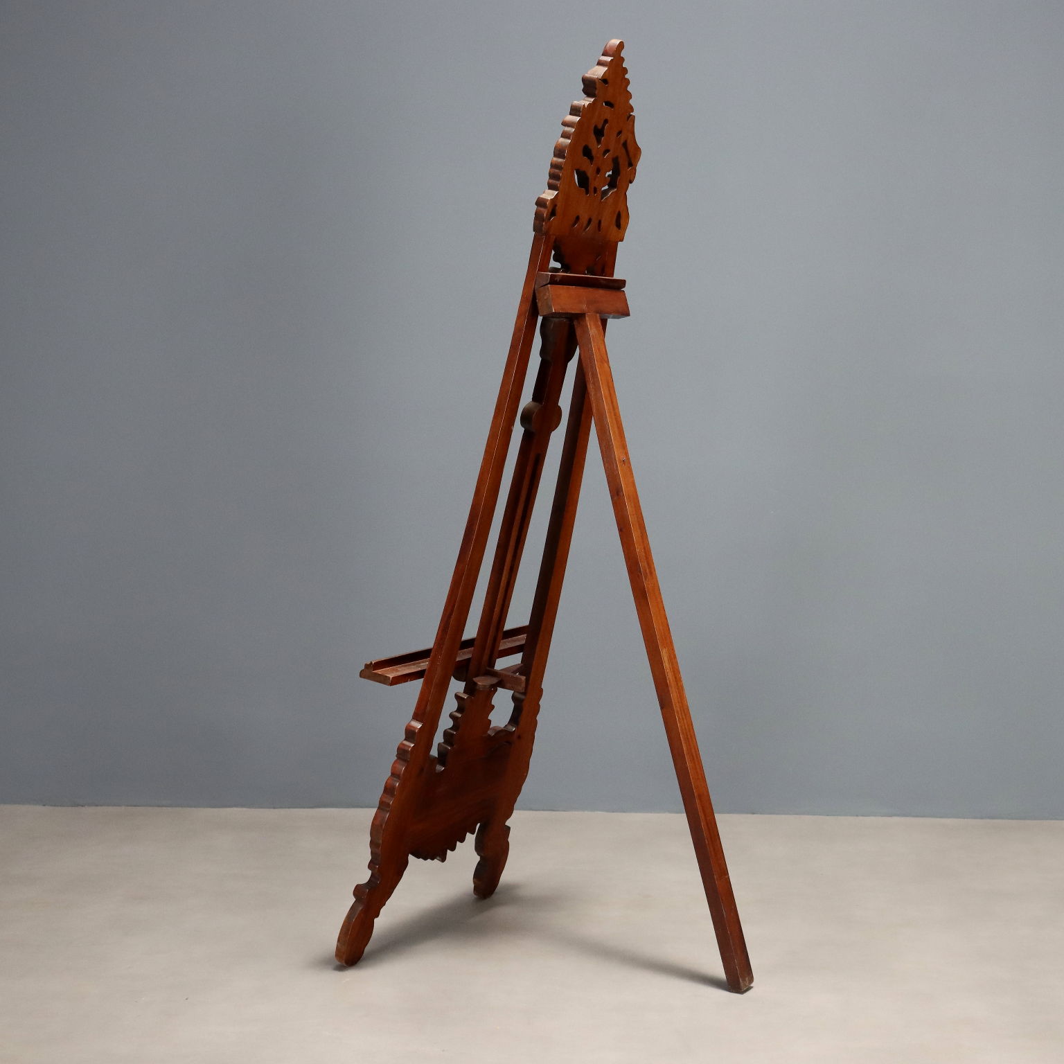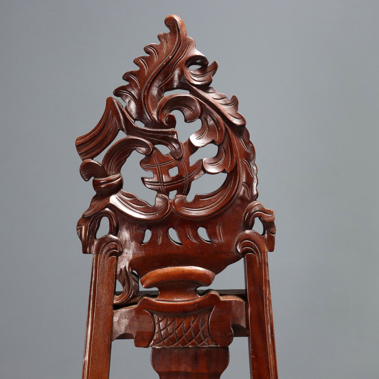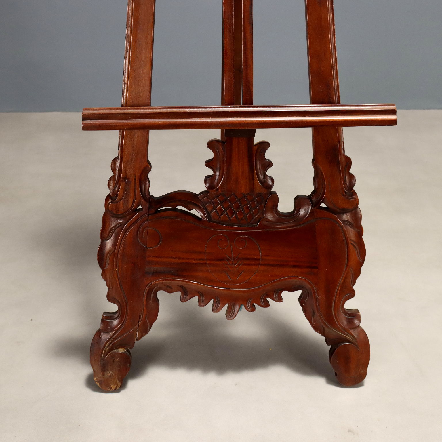 Cavalletto Luigi Filippo in mogano. Cimasa traforata e intagliata a volute e foglie così come nei piedi e la traversa della base. Italia, metà XIX Secolo.