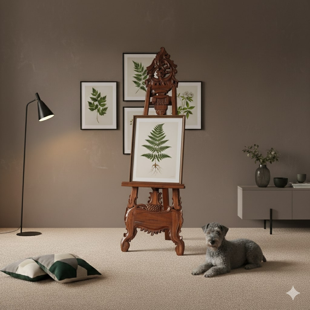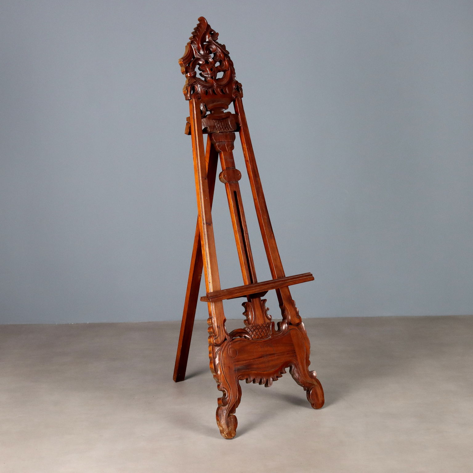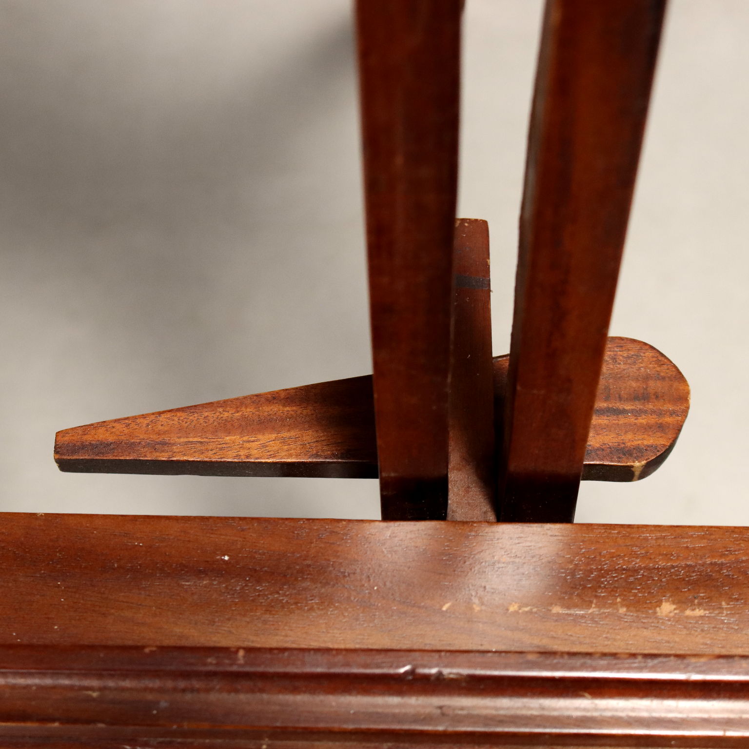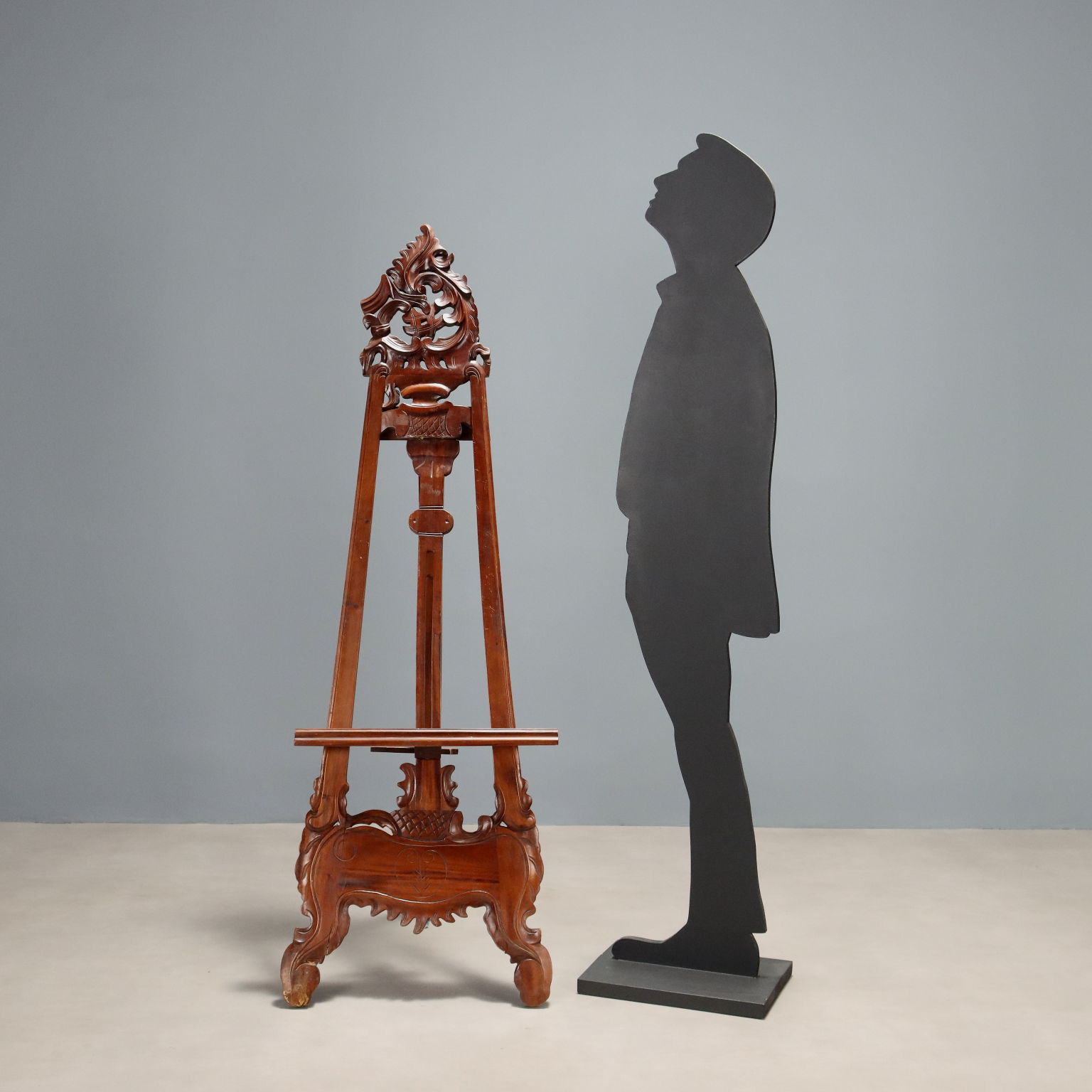 Cavalletto Luigi Filippo in mogano. Cimasa traforata e intagliata a volute e foglie così come nei piedi e la traversa della base. Italia, metà XIX Secolo.