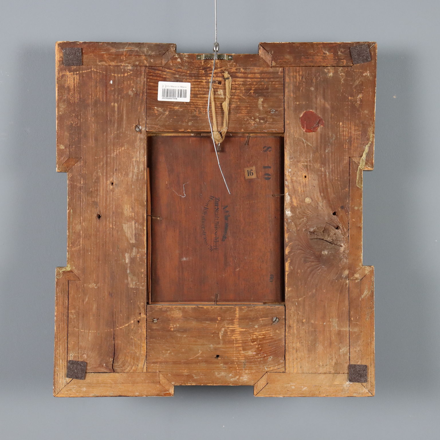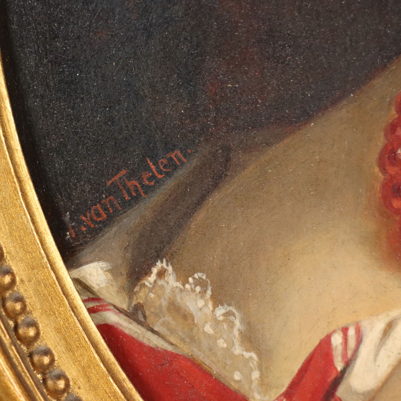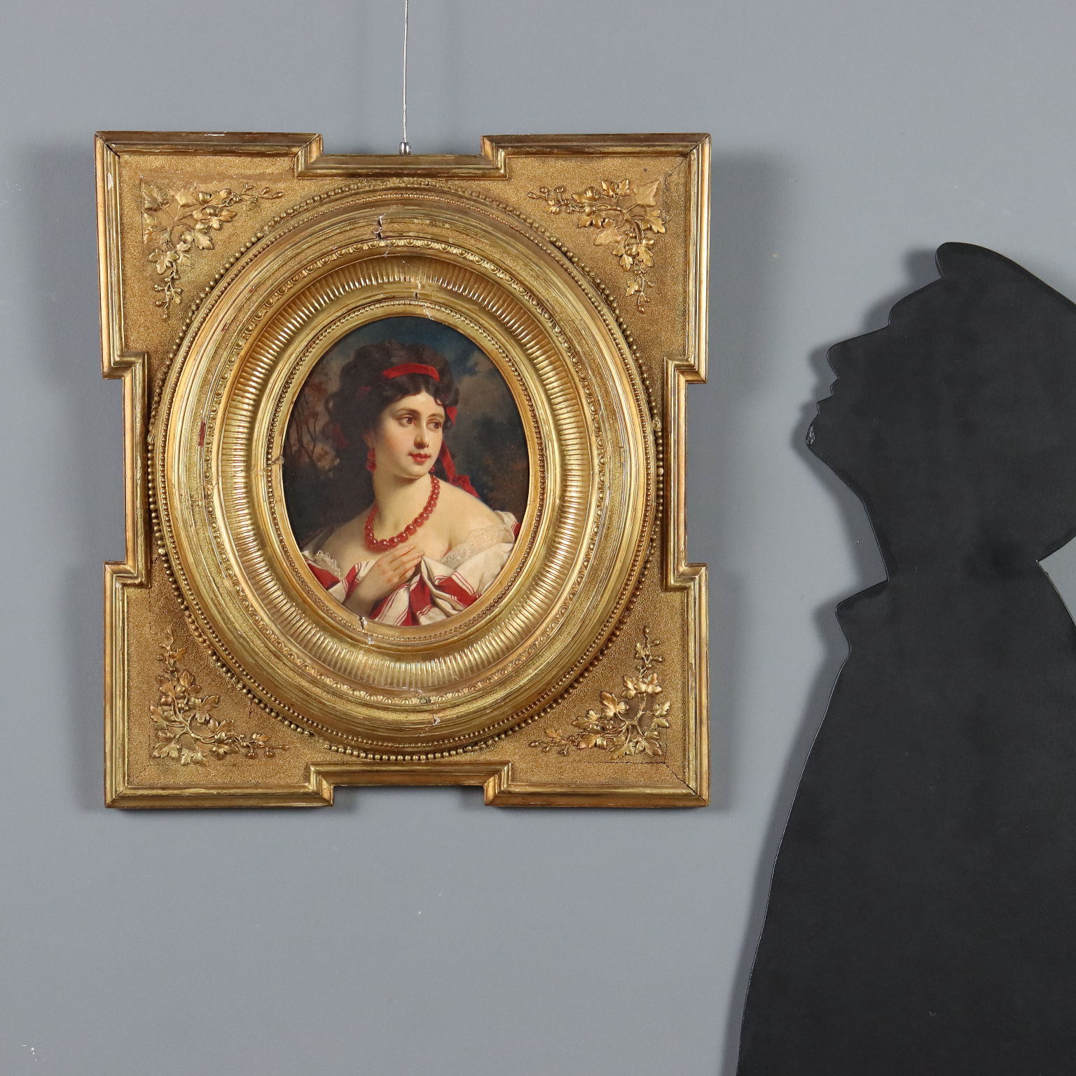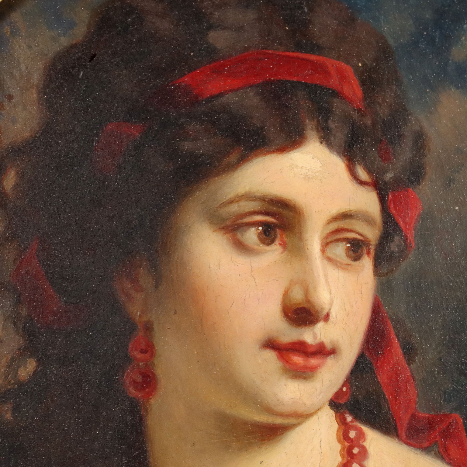 Olio su tavola. Firma non identificata in basso a sinistra. Sul retro sigillo a ceralacca di proprietà. Gradevole ritratto di giovane donna in posa discinta, che regge con la mano l'abito a coprire il seno; spiccano i gioielli e il nastro rosso tra i capelli, che, insieme all' abito, danno vivacità e luminosità alla figura, facendola risaltare sullo sfondo paesaggistico invece scuro e selvaggio. Il dipinto, su tavola rettangolare, è presentato in bella cornice coeva, lavorata, con segni di pregresso restauro e ulteriori piccoli danni.