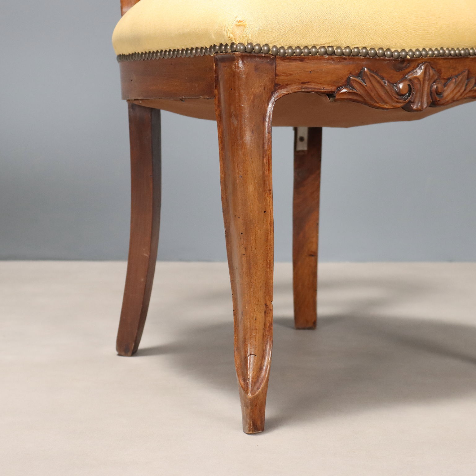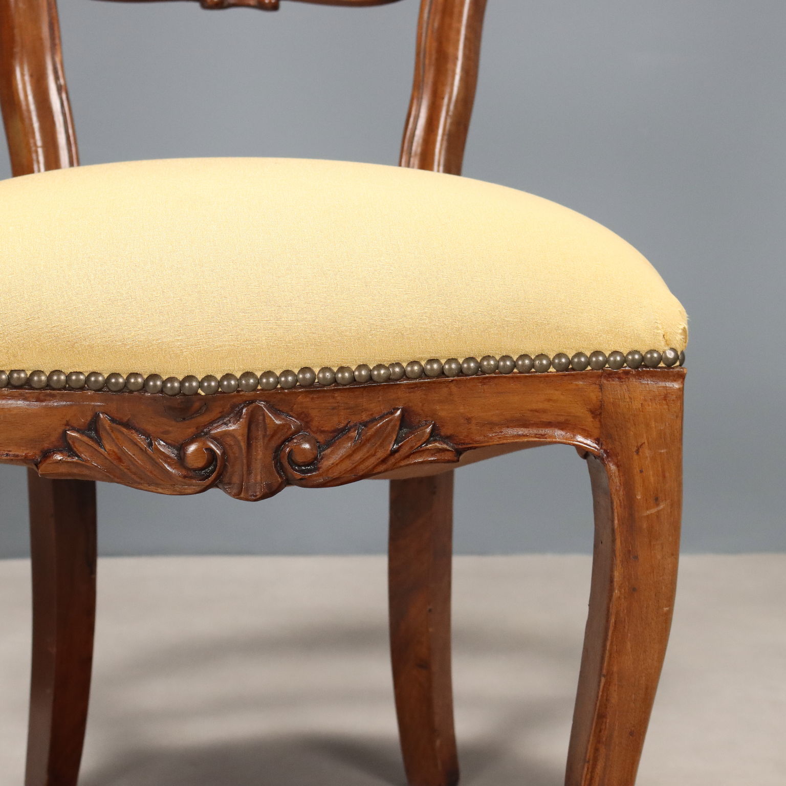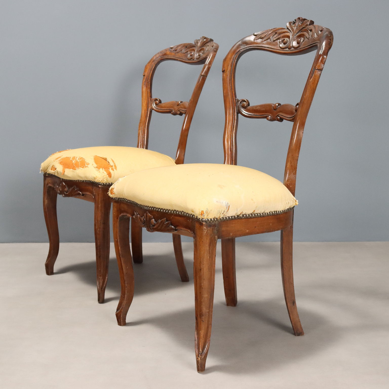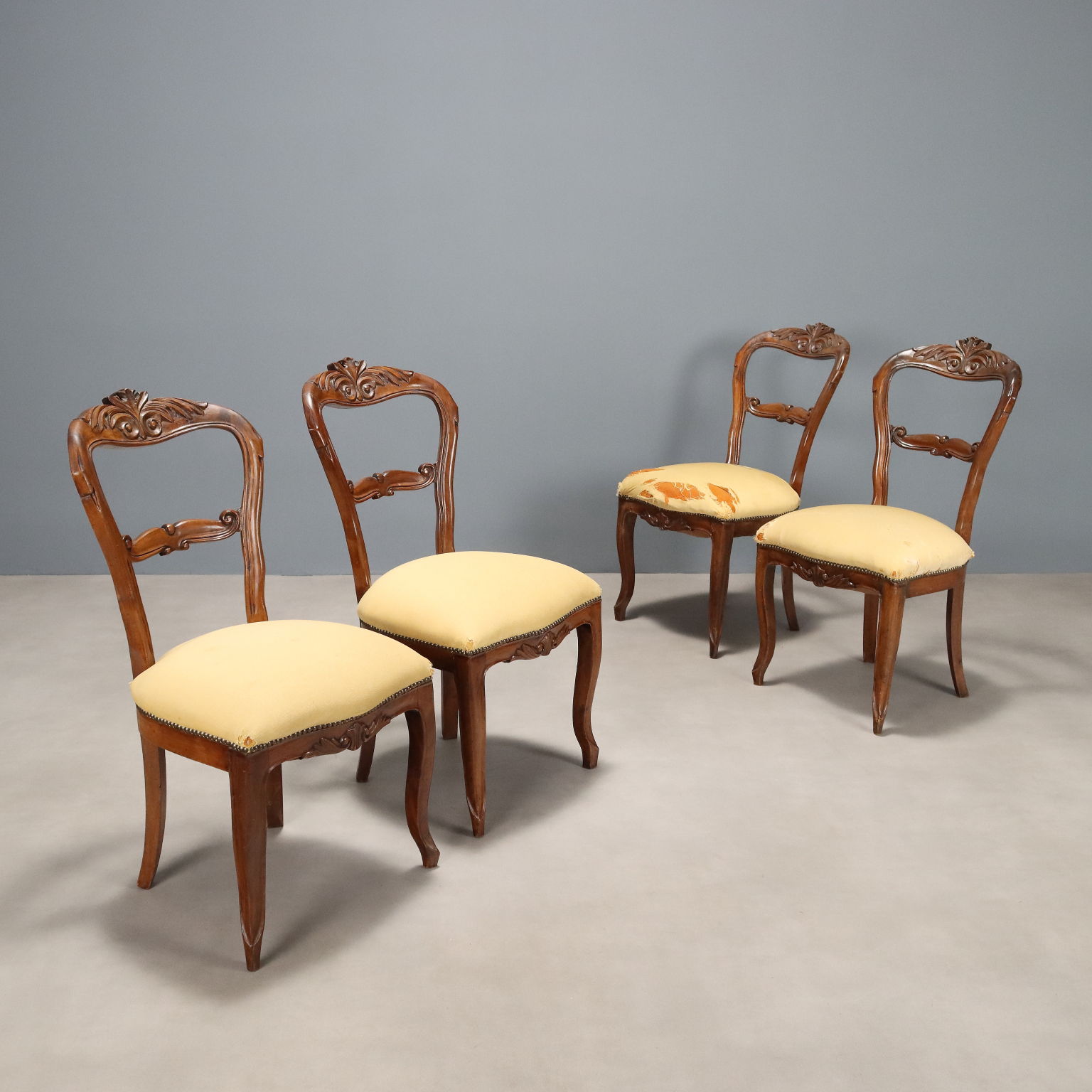 Gruppo di quattro sedie Luigi Filippo in noce. Schienale a giorno intagliato a volute così come la traversa della seduta. Gambe mosse, seduta imbottita. Italia, secondo quarto XIX Secolo.