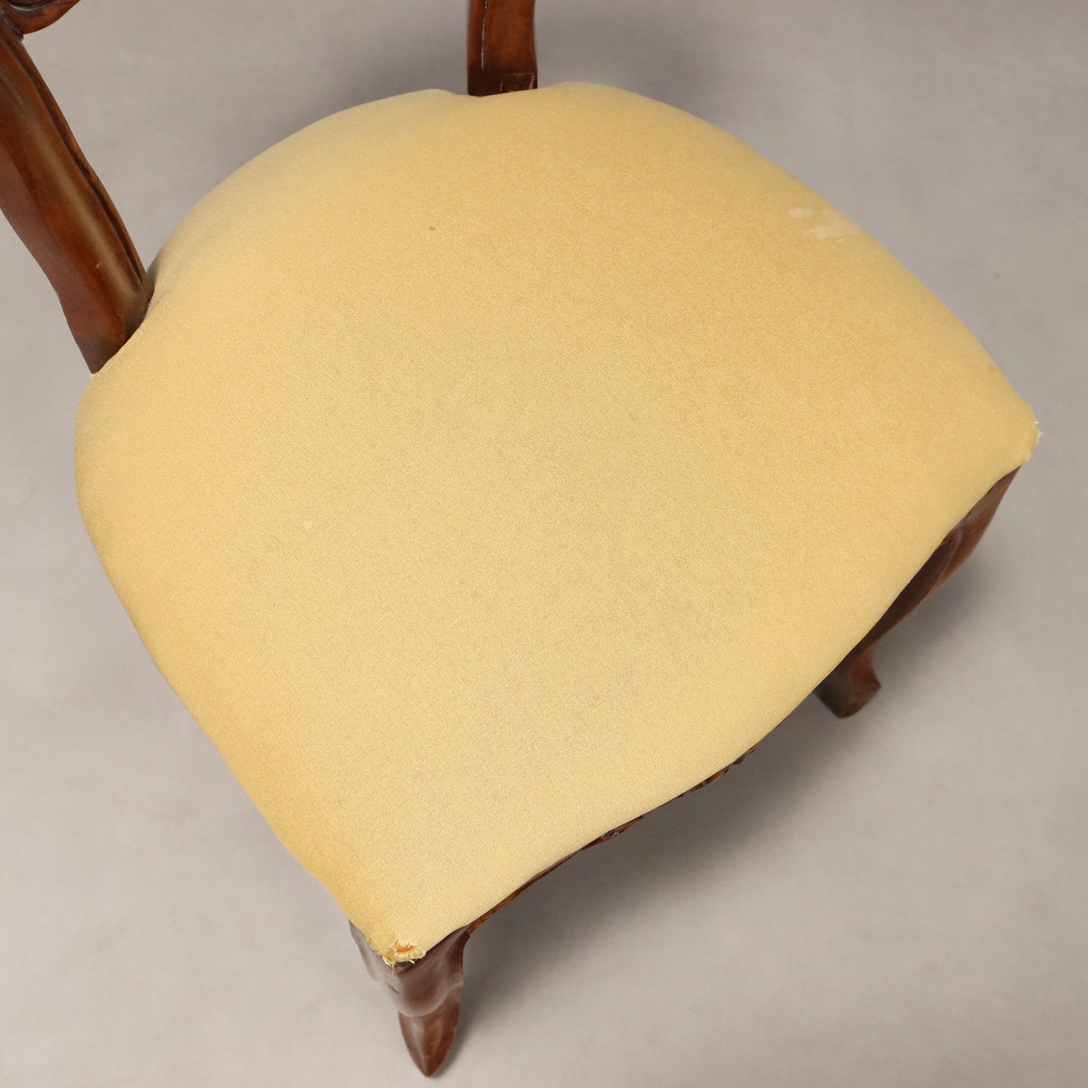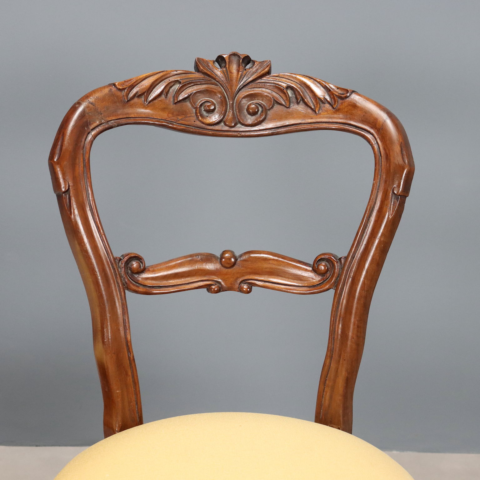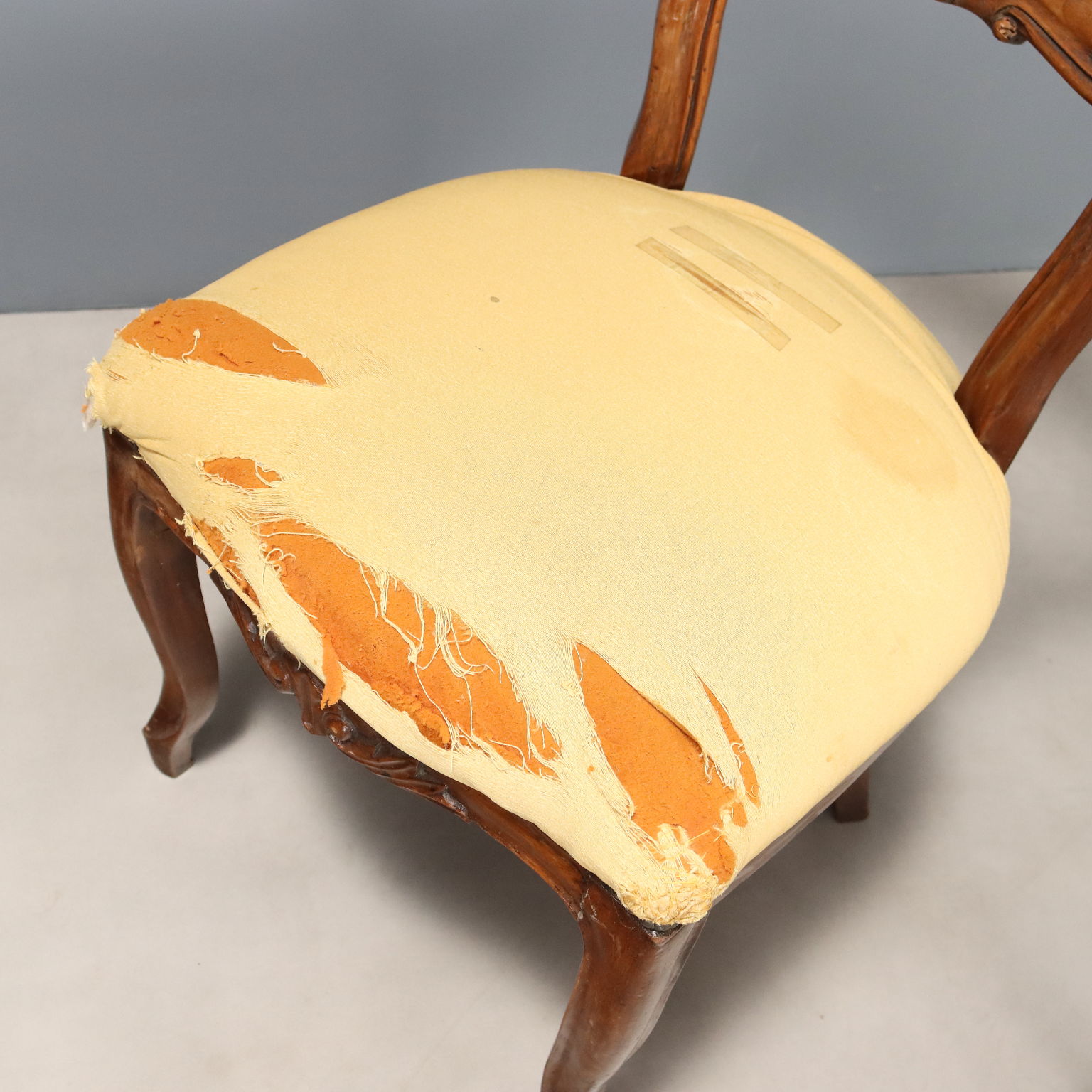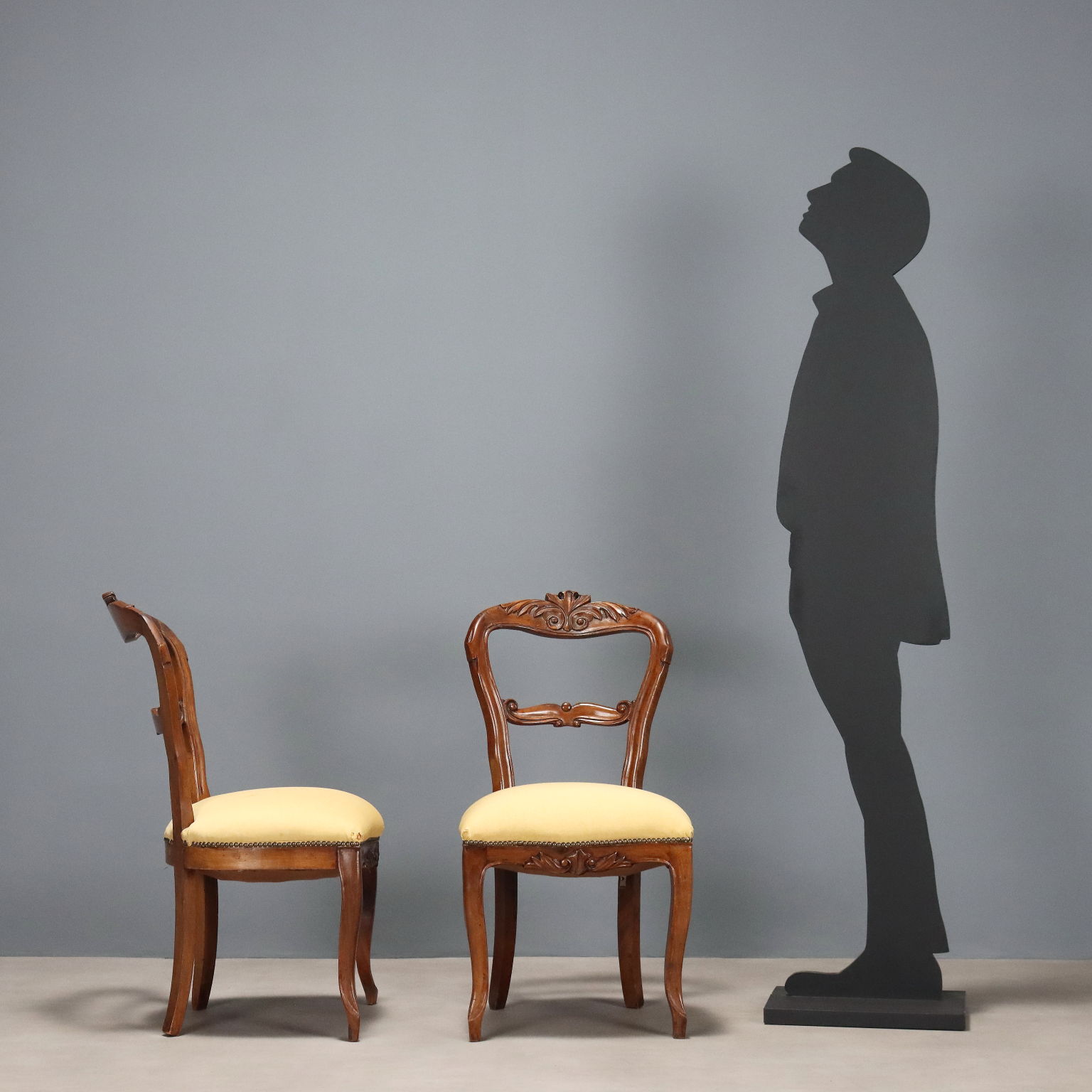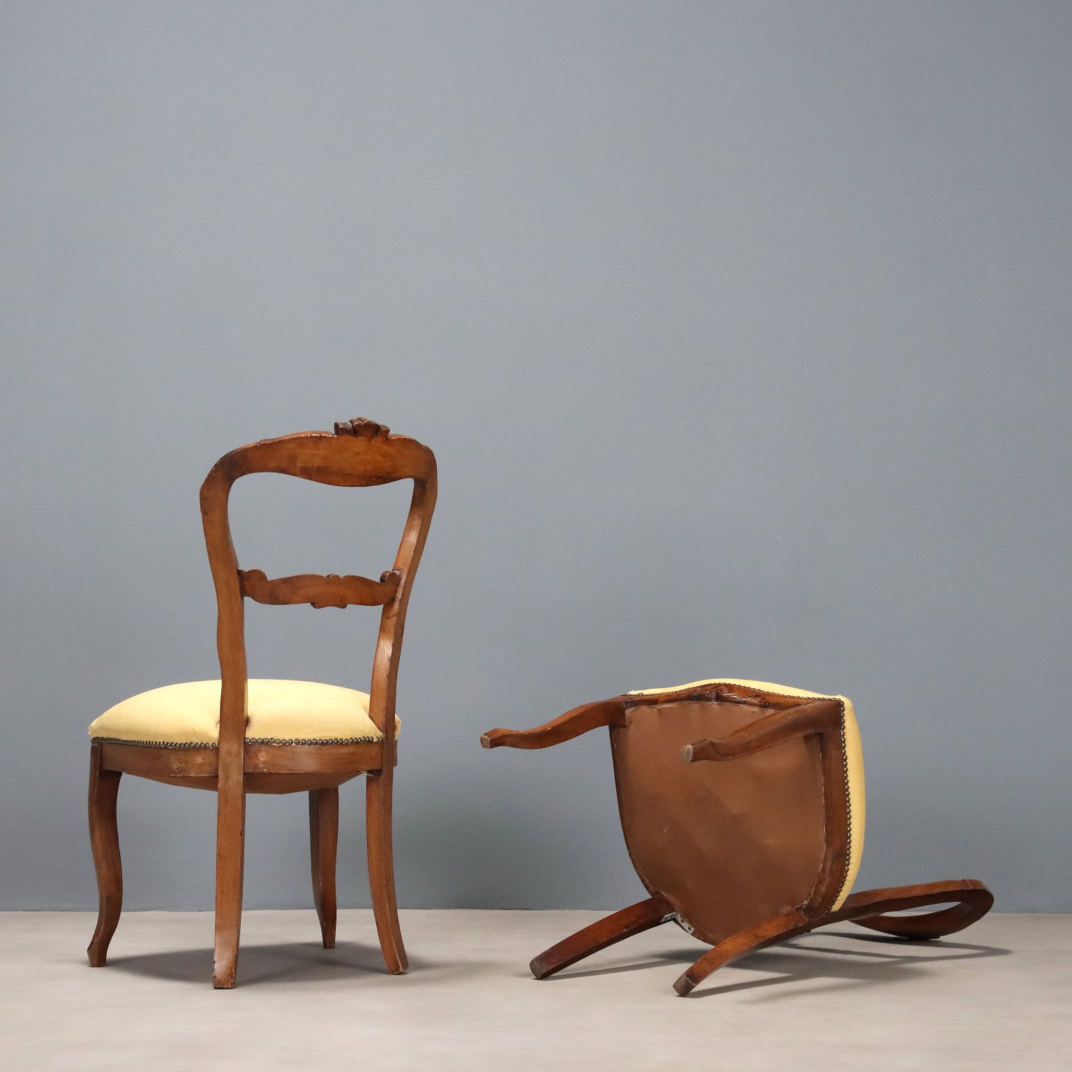 Gruppo di quattro sedie Luigi Filippo in noce. Schienale a giorno intagliato a volute così come la traversa della seduta. Gambe mosse, seduta imbottita. Italia, secondo quarto XIX Secolo.