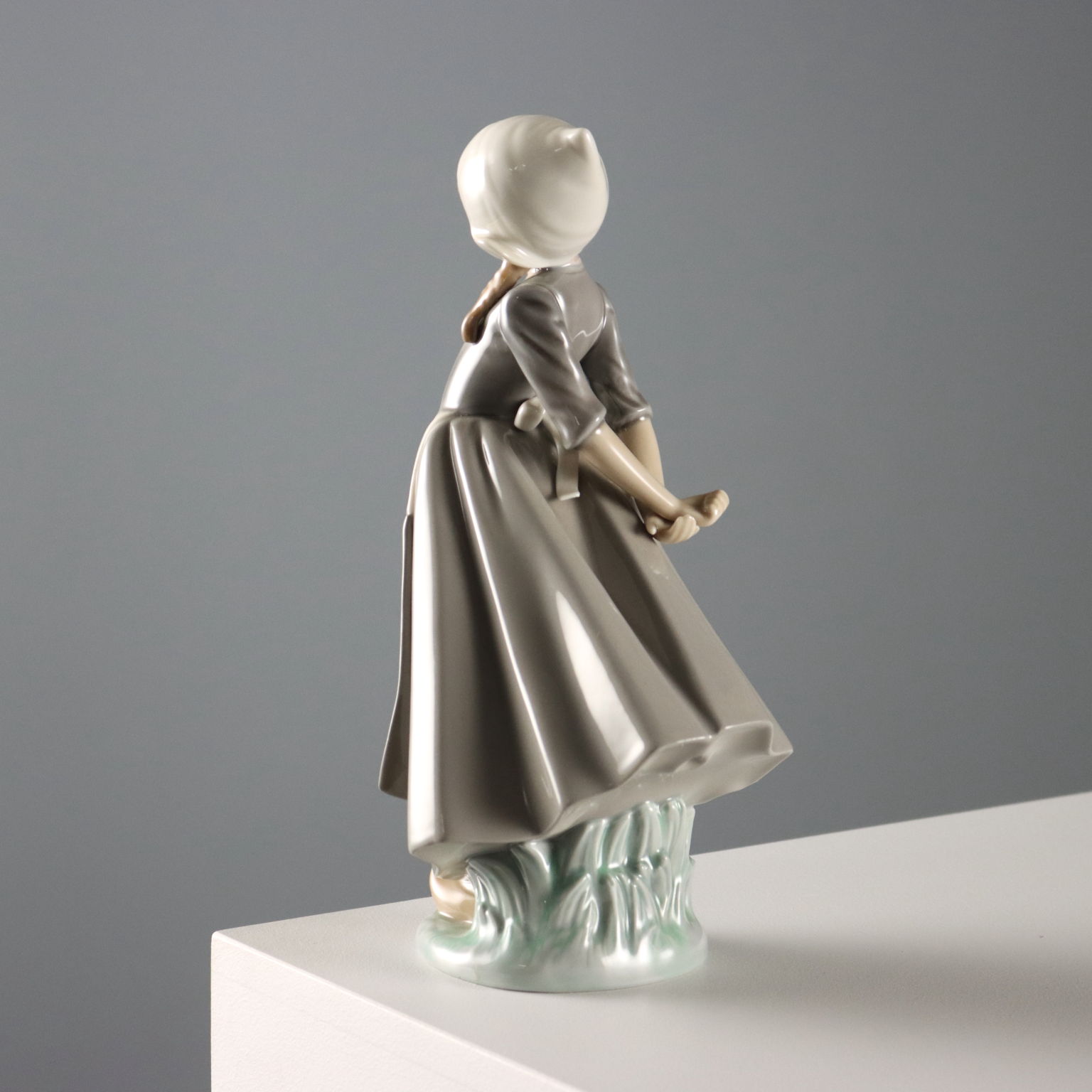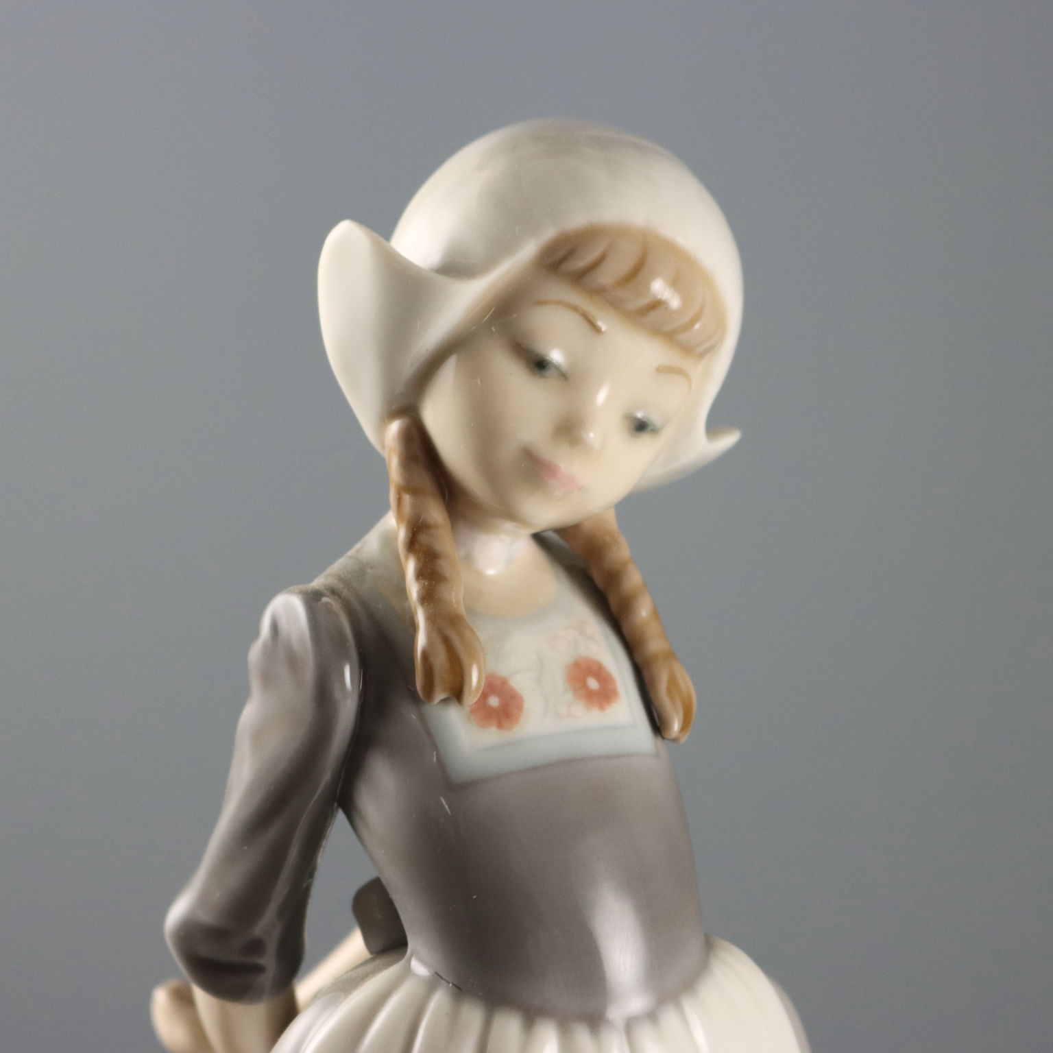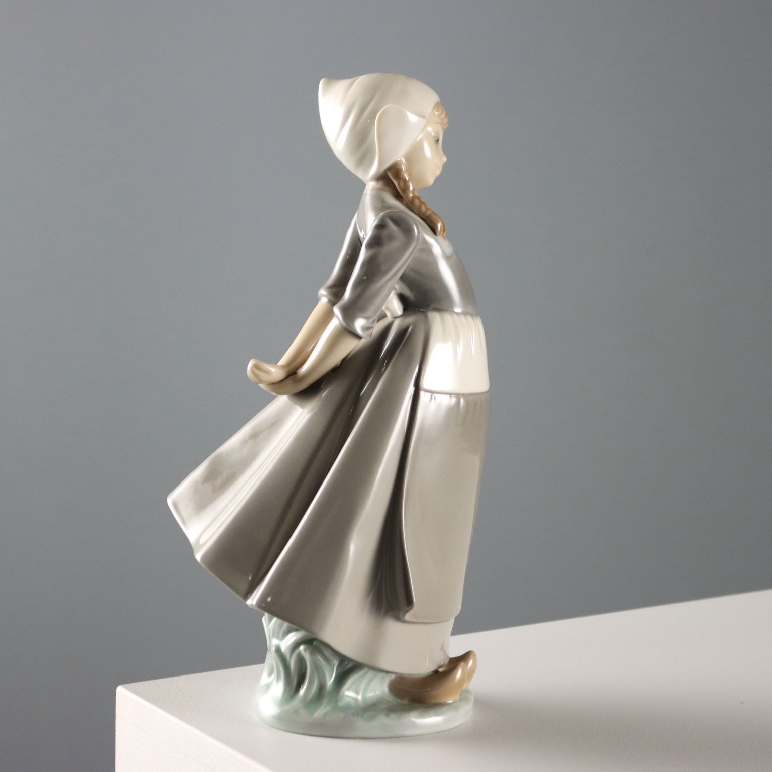 Scultura in porcellana raffigurante olandesina in posa vezzosa. Sotto la base marchio della manifattura e numero di serie.