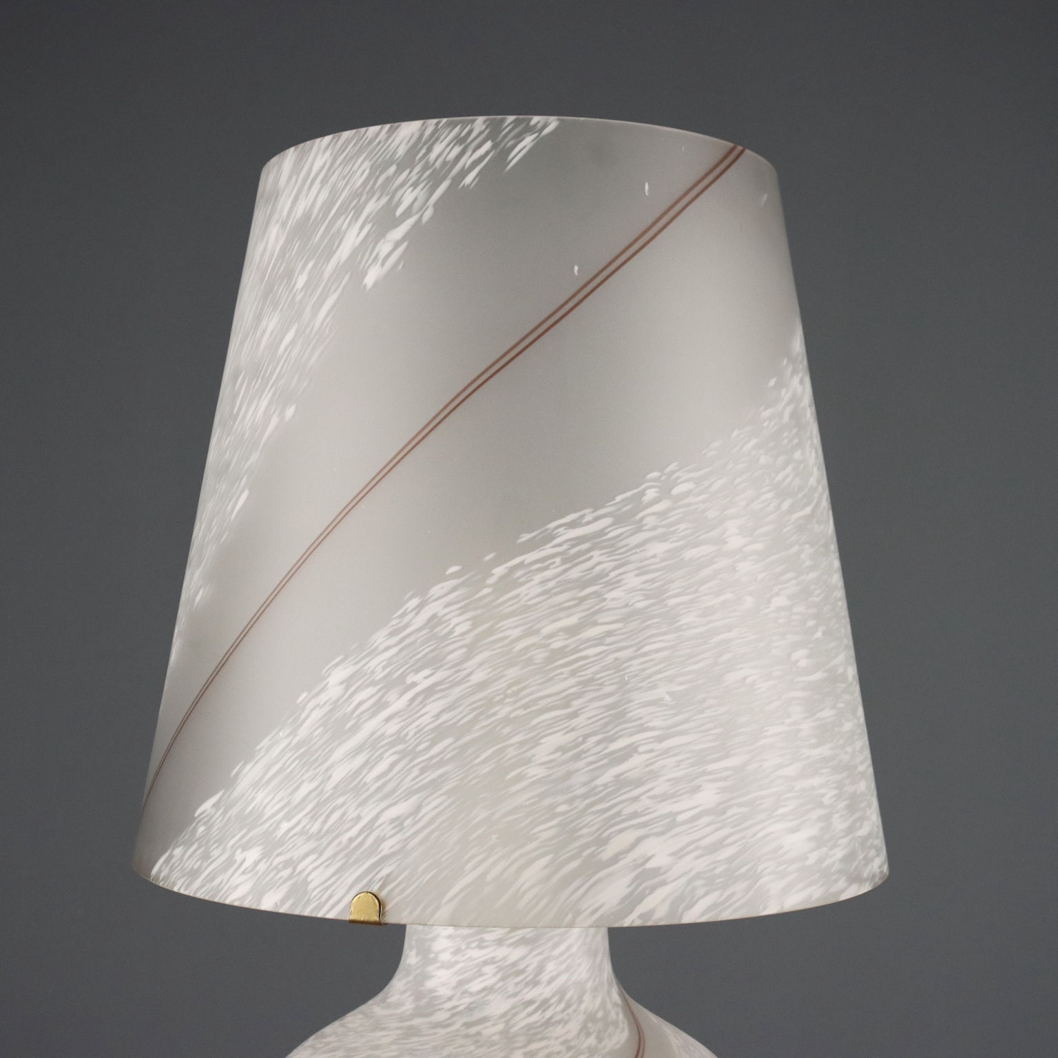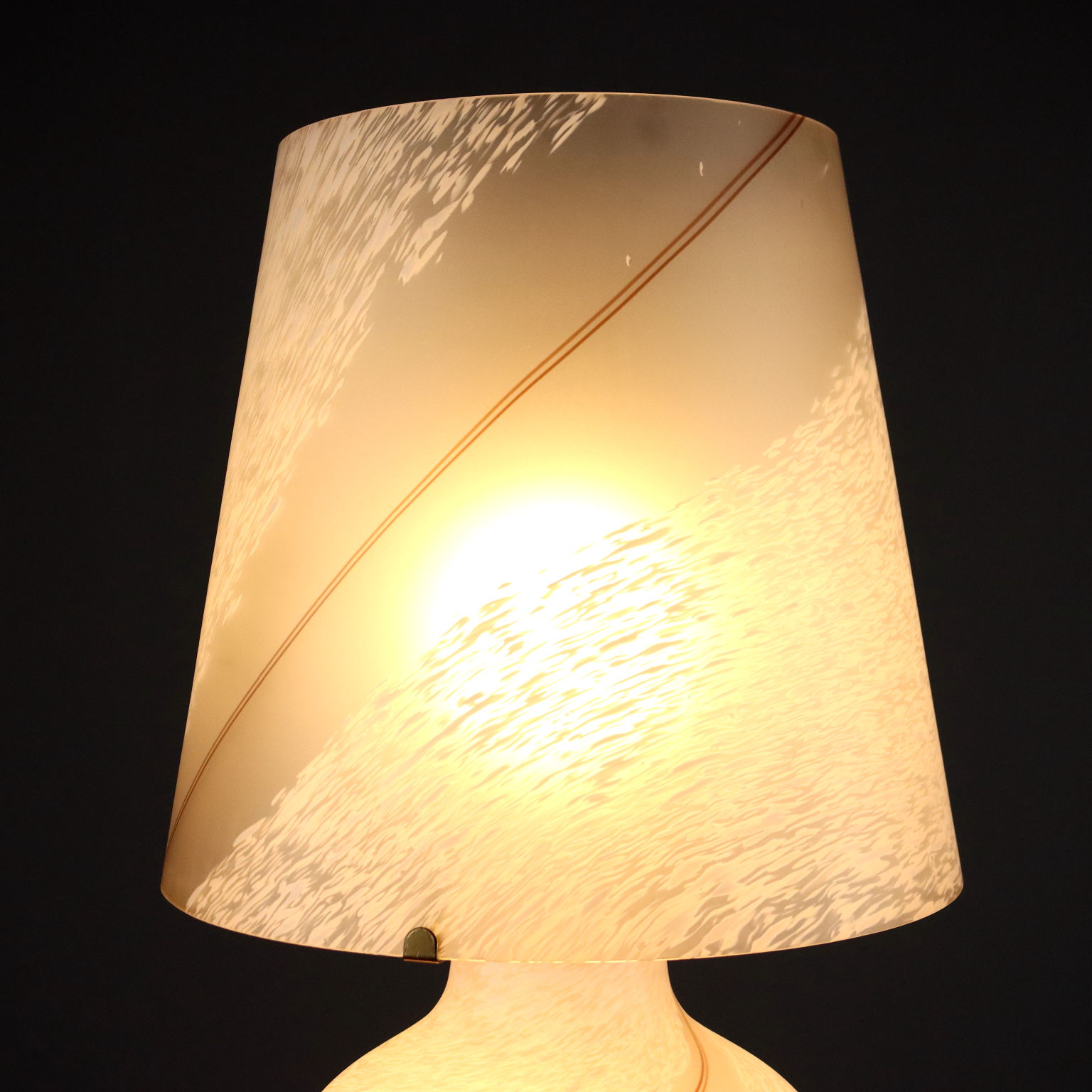 Grande lampada da tavolo in vetro di Murano lavorato con base in ottone. 3 lampadine con attacco E14 interne e 1 lampadina con attacco E27 in cima.