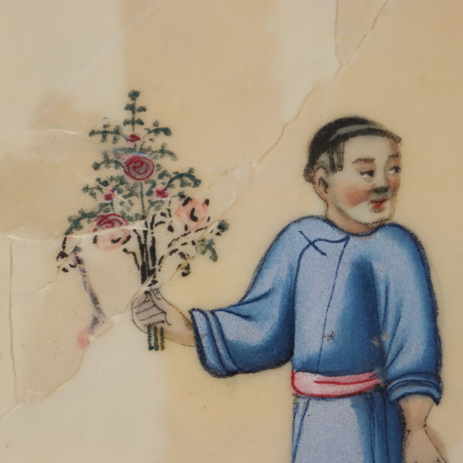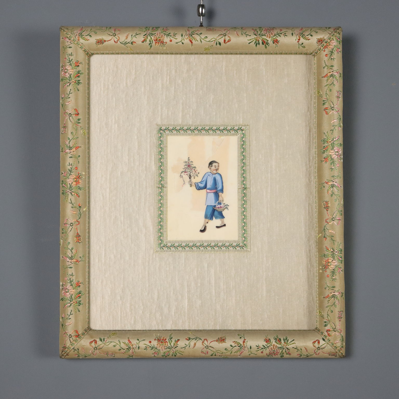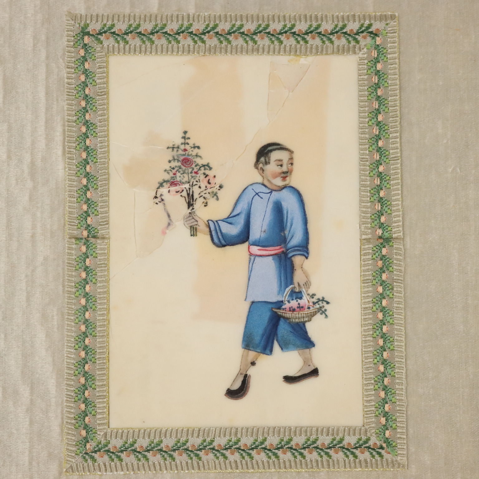Tempera su pith- paper. Produzione cinese, Canton, epoca Qing, 1860 ca. Le due figurine di personaggi cinesi popolari originariamente venivano conservati in un album, parte di una collezione più ampia, ma sono qui presentate invece in bella cornice, decorata con tessuti ricamati a motivo floreale. La pith- paper, ovvero "carta di midollo", è un materiale sottile e traslucido derivato dal midollo dell'albero Tetrapanax papyrifer, o "pianta del midollo", originario della Cina e di Taiwan. Il pith entrò a far parte dell'uso pittorico per soddisfare la crescente domanda di souvenir piccoli, economici e facilmente trasportabili, in seguito alla massiccia crescita del commercio con la Cina nel primo quarto del XIX secolo. Poiché molti venivano venduti in album e quindi protetti dalla luce, conservano i loro colori vivaci ancora oggi.