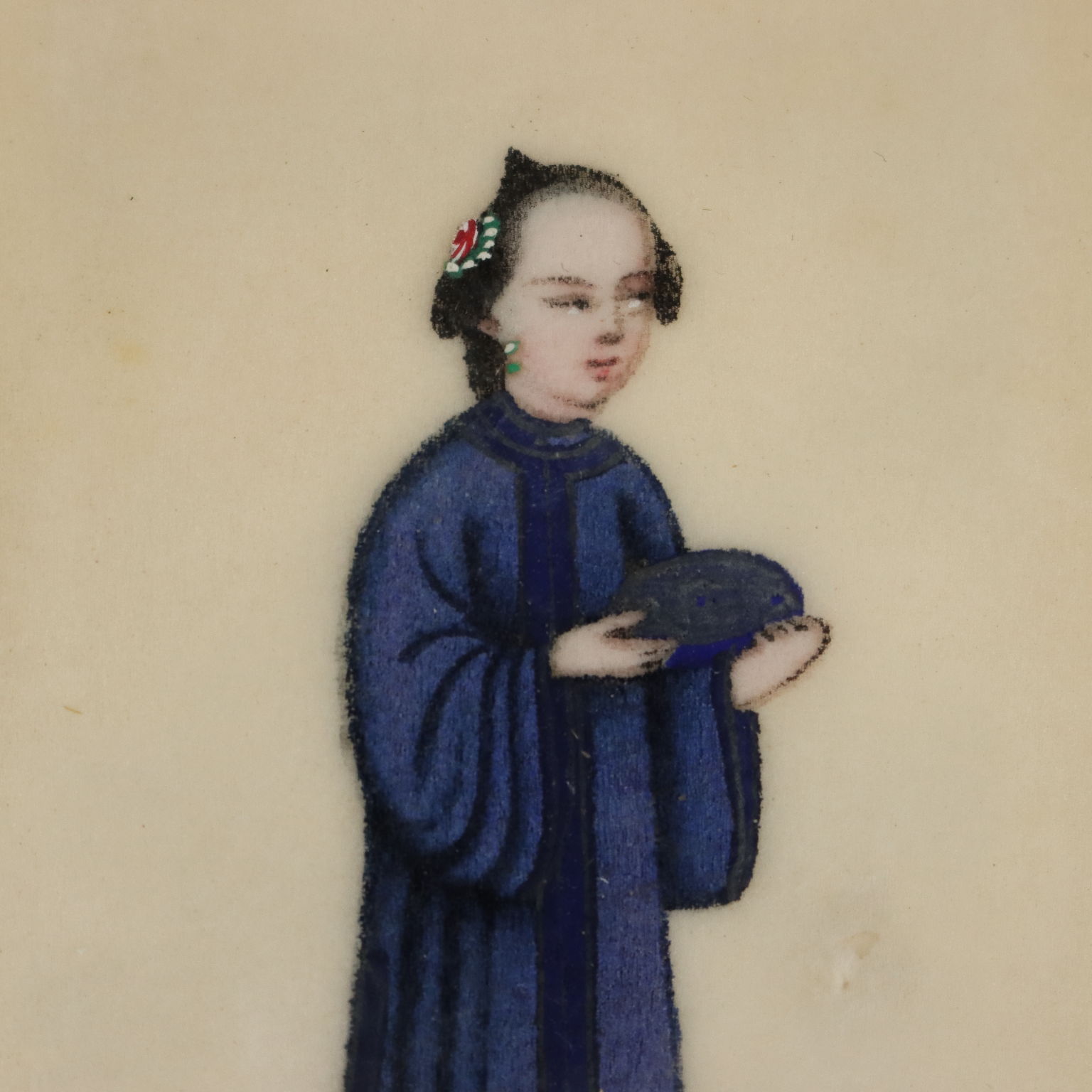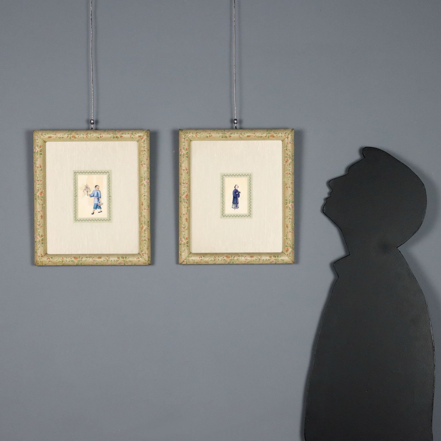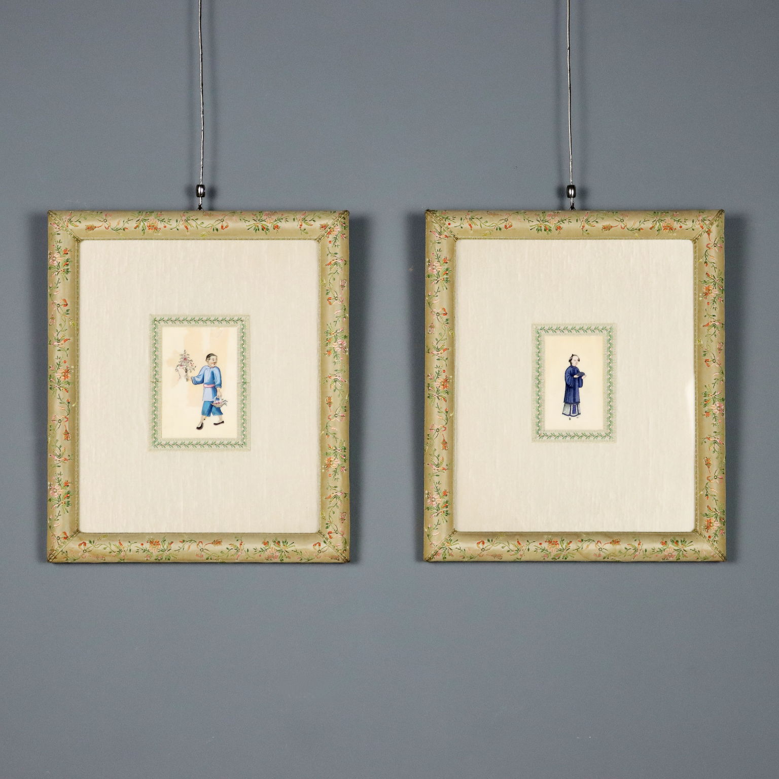 Tempera su pith- paper. Produzione cinese, Canton, epoca Qing, 1860 ca. Le due figurine di personaggi cinesi popolari originariamente venivano conservati in un album, parte di una collezione più ampia, ma sono qui presentate invece in bella cornice, decorata con tessuti ricamati a motivo floreale. La pith- paper, ovvero "carta di midollo", è un materiale sottile e traslucido derivato dal midollo dell'albero Tetrapanax papyrifer, o "pianta del midollo", originario della Cina e di Taiwan. Il pith entrò a far parte dell'uso pittorico per soddisfare la crescente domanda di souvenir piccoli, economici e facilmente trasportabili, in seguito alla massiccia crescita del commercio con la Cina nel primo quarto del XIX secolo. Poiché molti venivano venduti in album e quindi protetti dalla luce, conservano i loro colori vivaci ancora oggi.