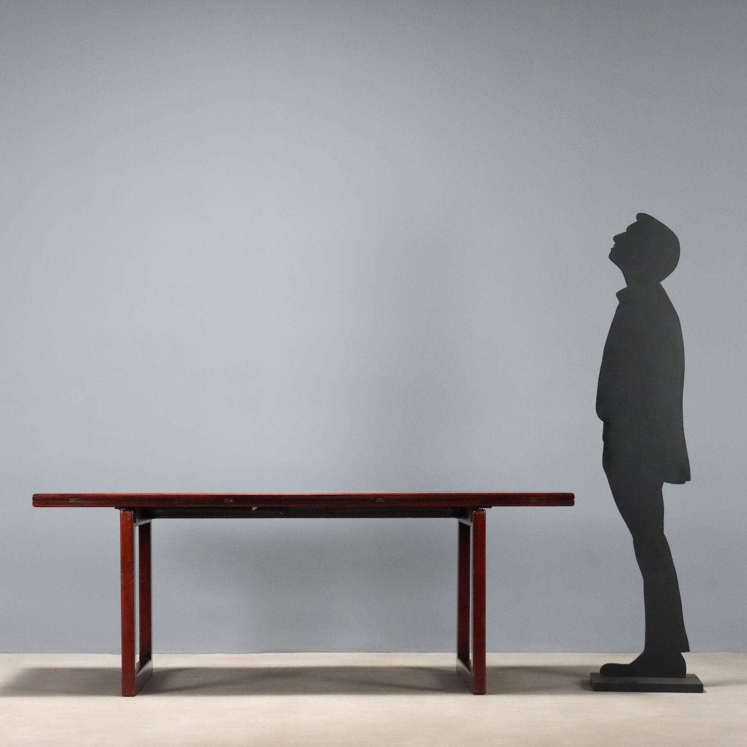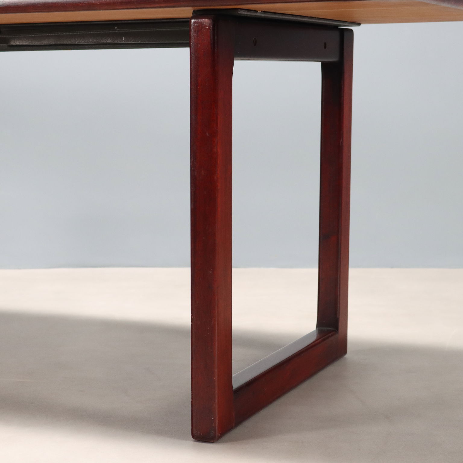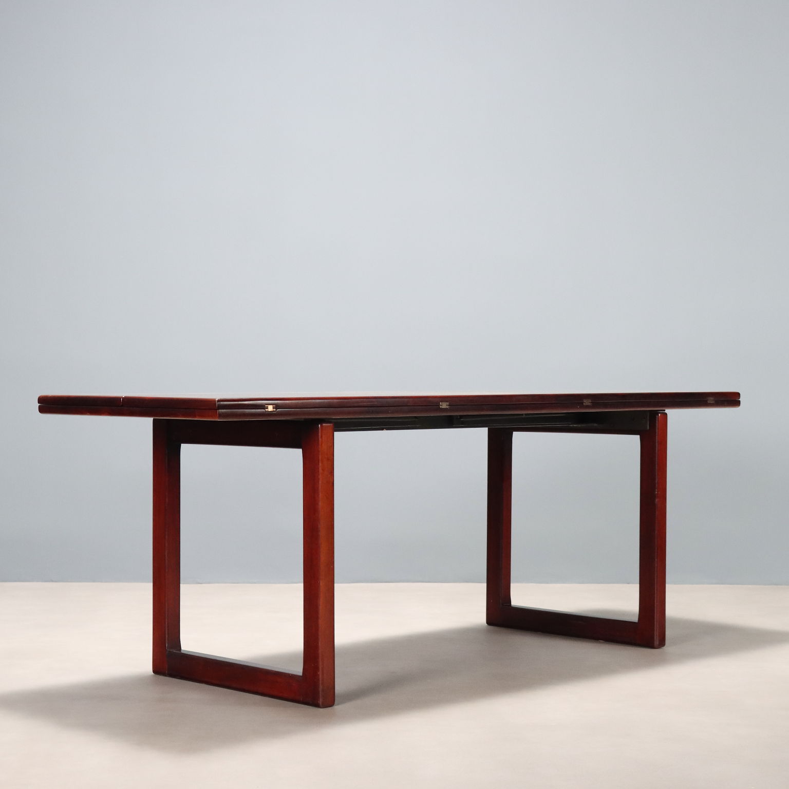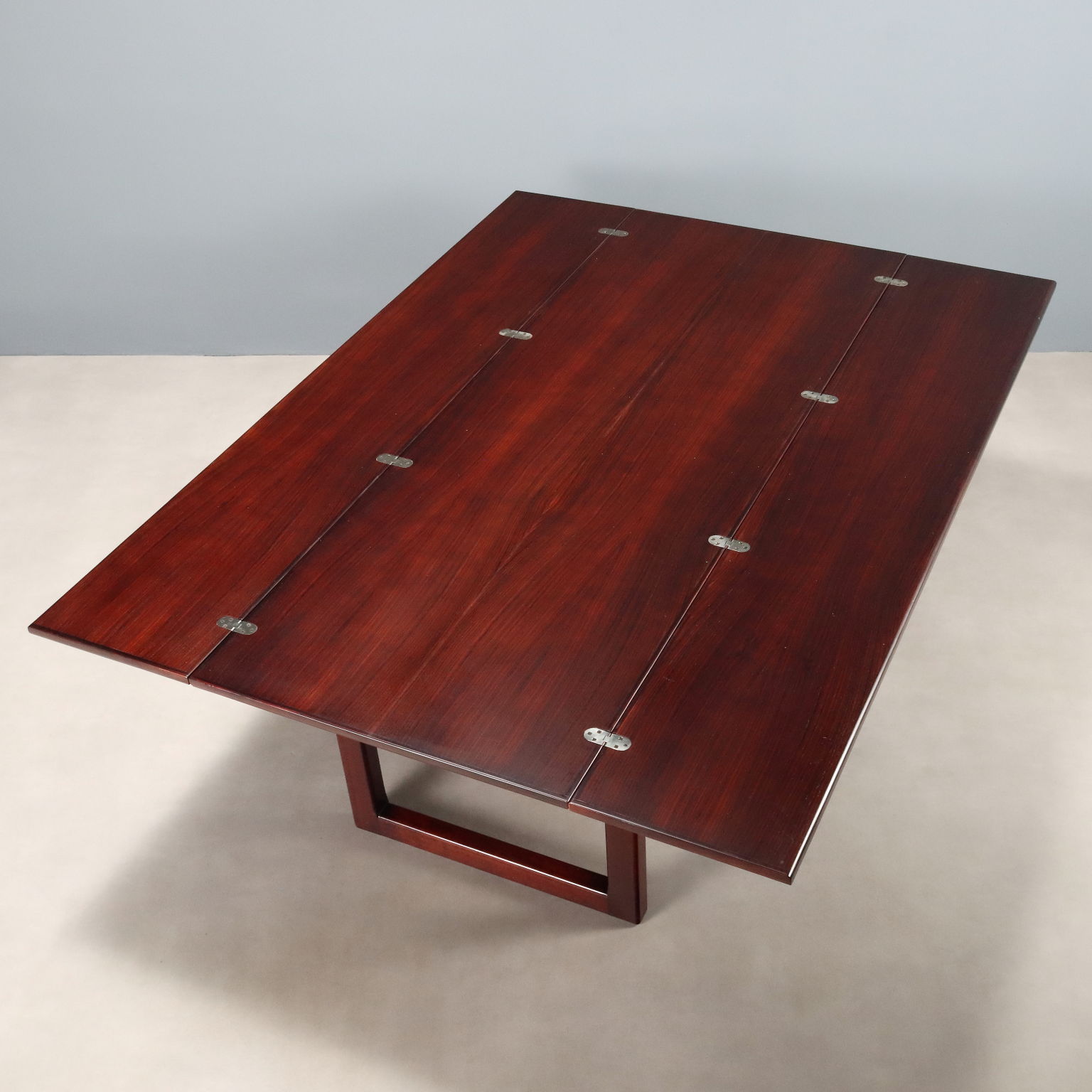 Elegante tavolo con struttura in legno e impiallacciatura in legno esotico che presenta due gambe a cavalletto e un piano che può essere allargato mediante apertura a libro. Dettagli e sostegni in metallo.