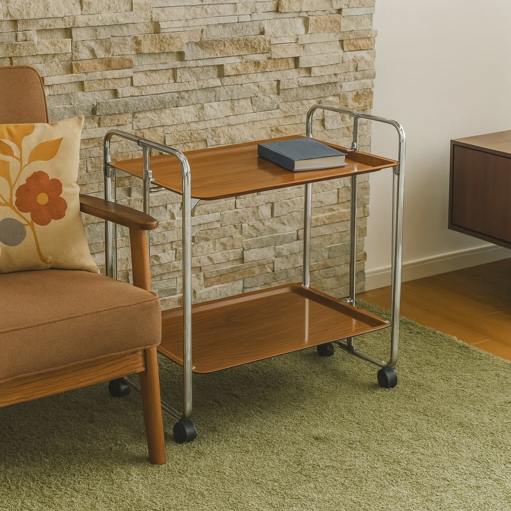 Carrello di servizio portavivande con rotelle, in metallo con doppio piano marrone.