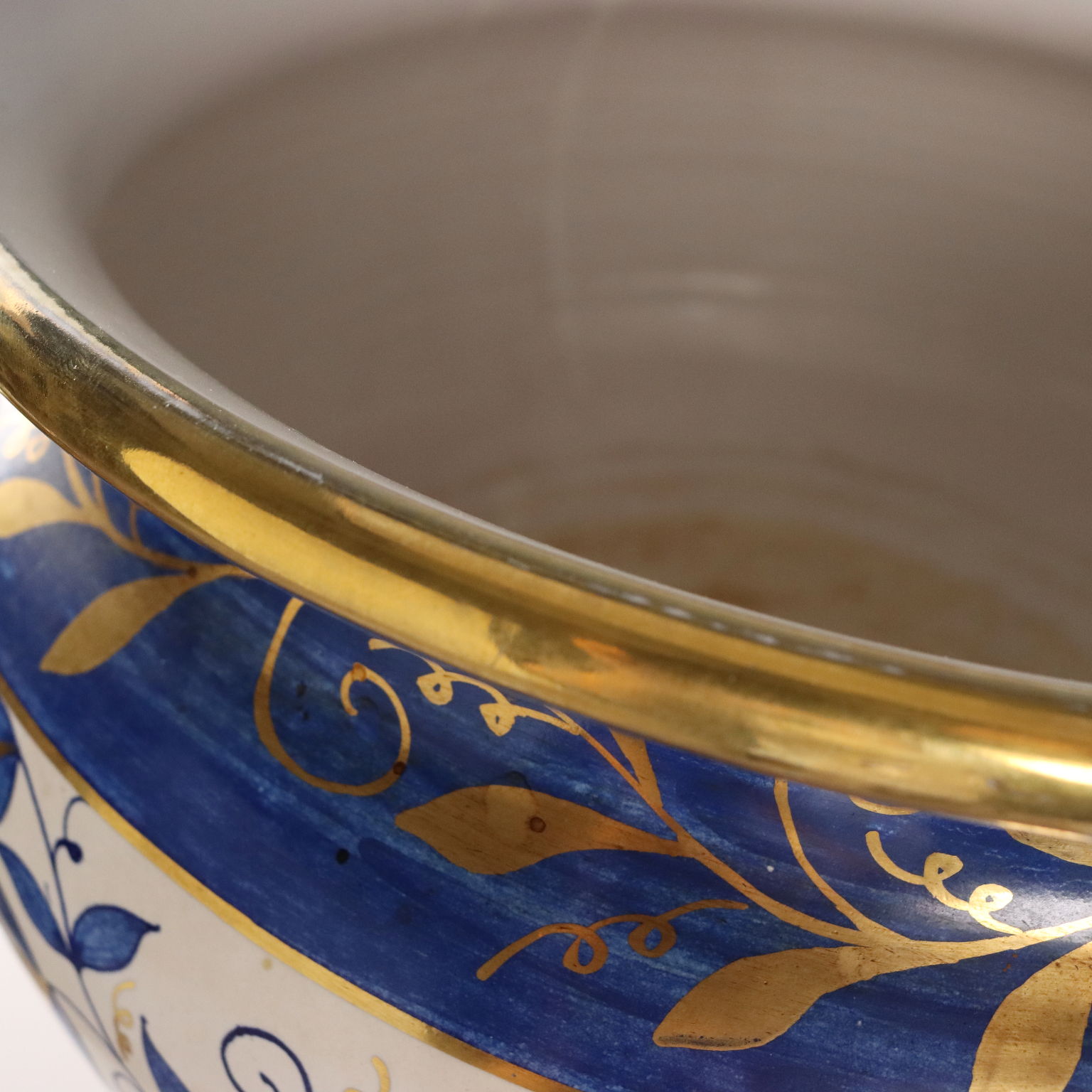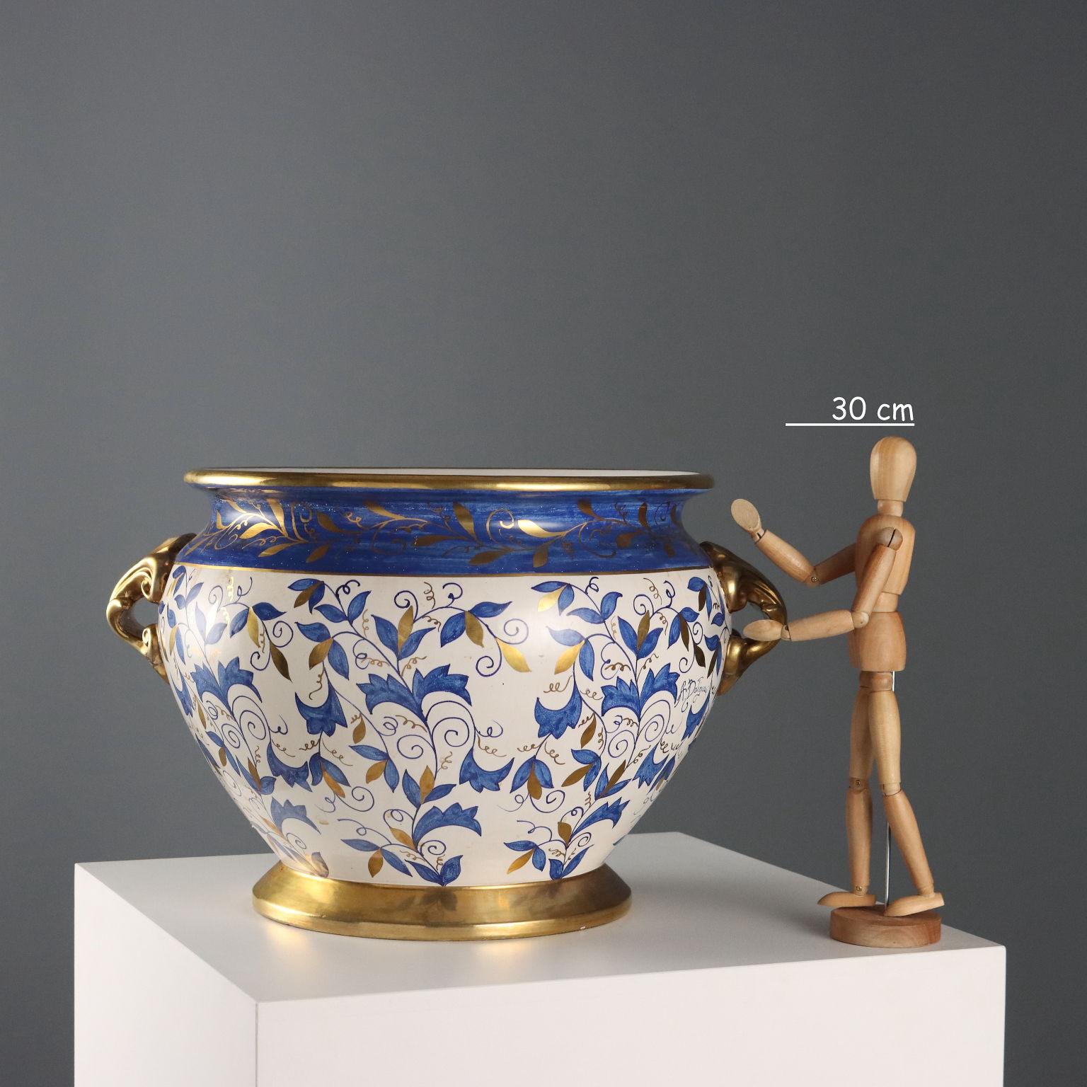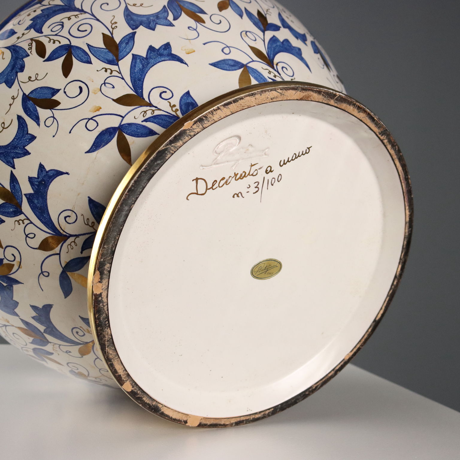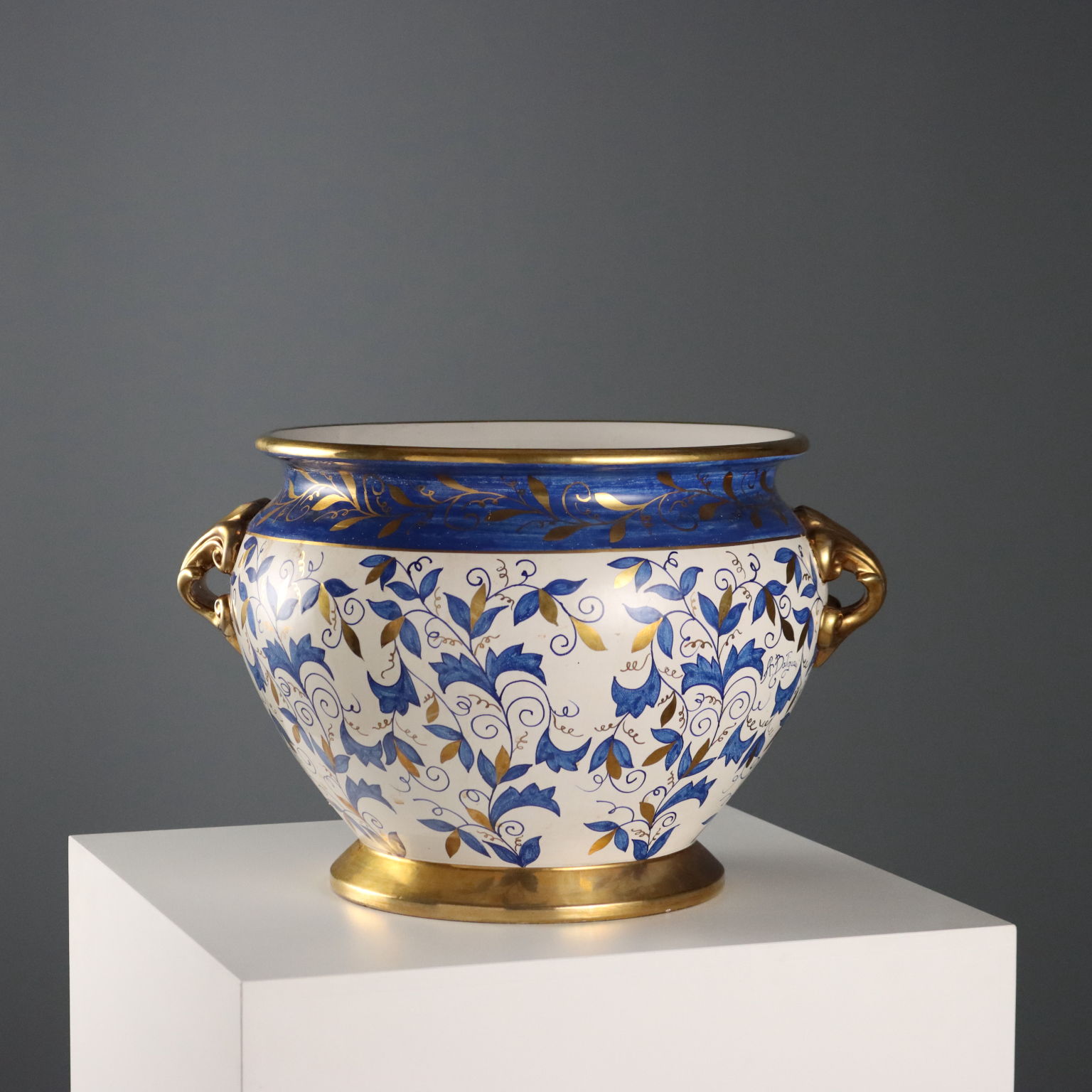 Cache pot in ceramica dipinta a tema vegetale in oro e blu su sfondo bianco. Anse a volute in oro zecchino. Numero della serie limitata 3/100, marchio ed etichetta della manifattura sotto la base.