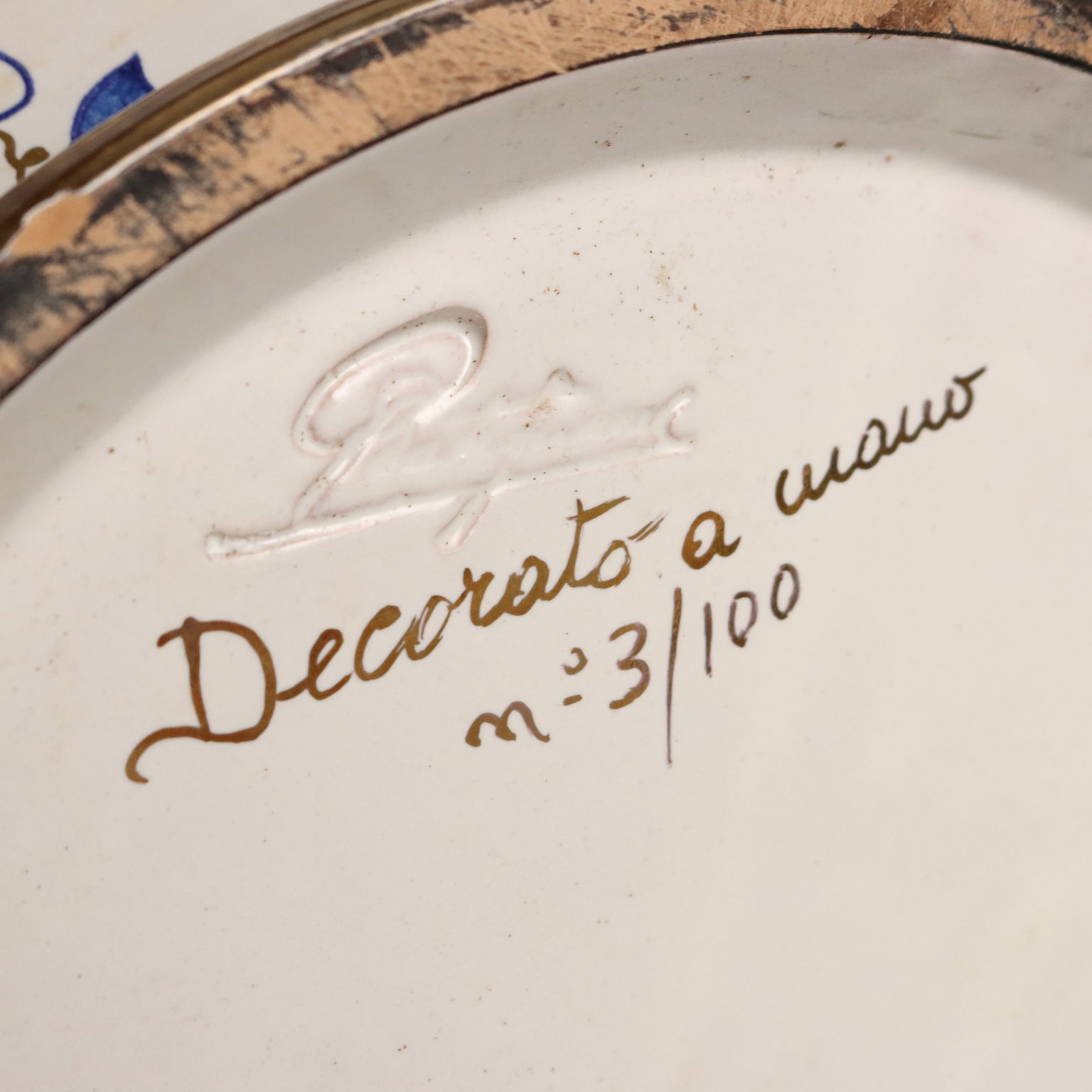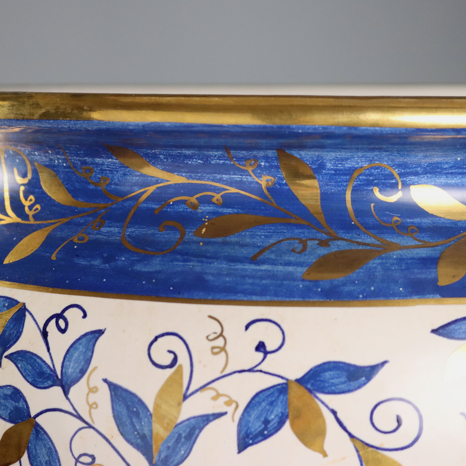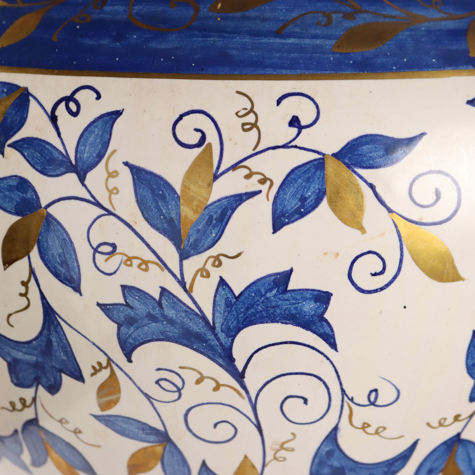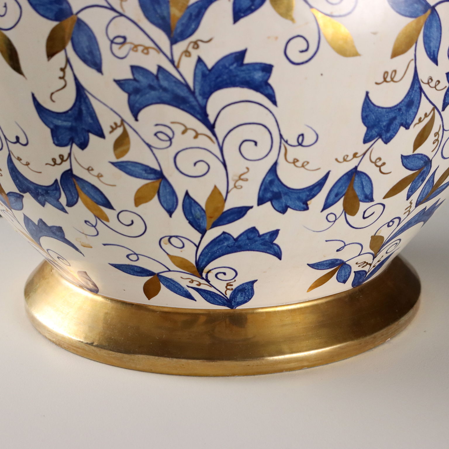 Cache pot in ceramica dipinta a tema vegetale in oro e blu su sfondo bianco. Anse a volute in oro zecchino. Numero della serie limitata 3/100, marchio ed etichetta della manifattura sotto la base.