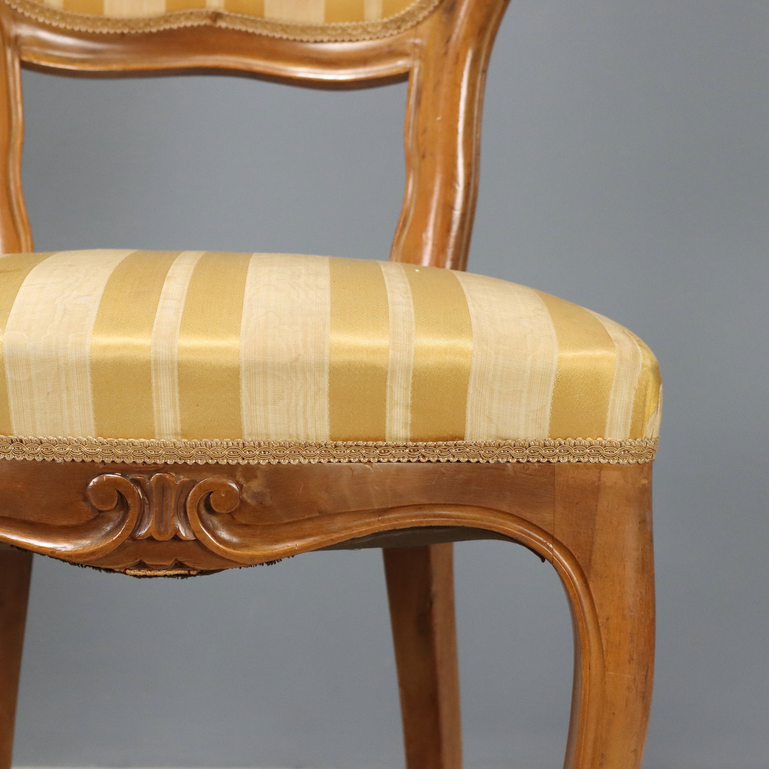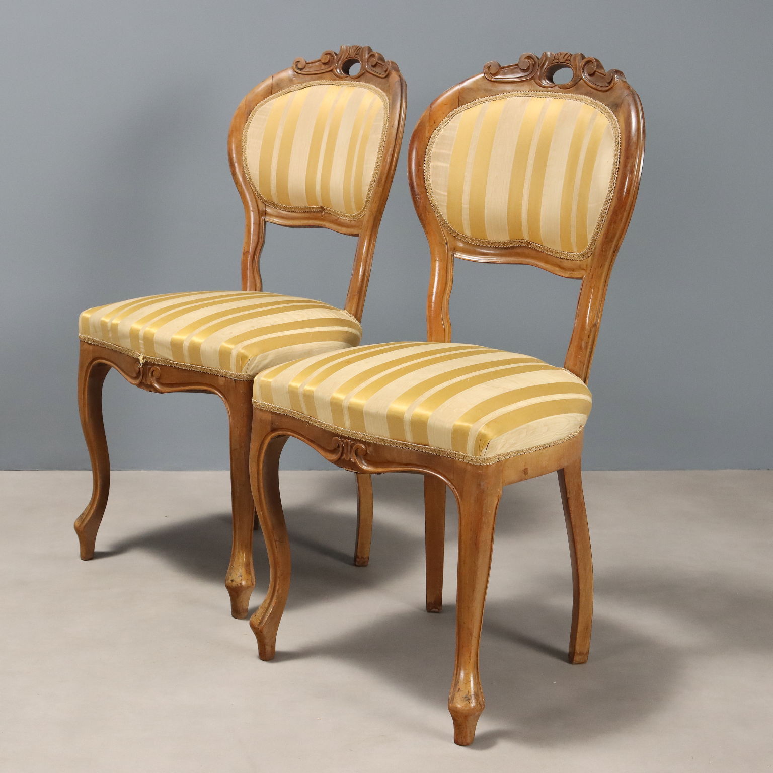 Gruppo di quattro sedie Luigi Filippo, in noce. Cimasa dello schienale traforata e intagliata, gambe mosse. Seduta e pannello dello schienale imbottiti. Italia, secondo quarto XIX Secolo.