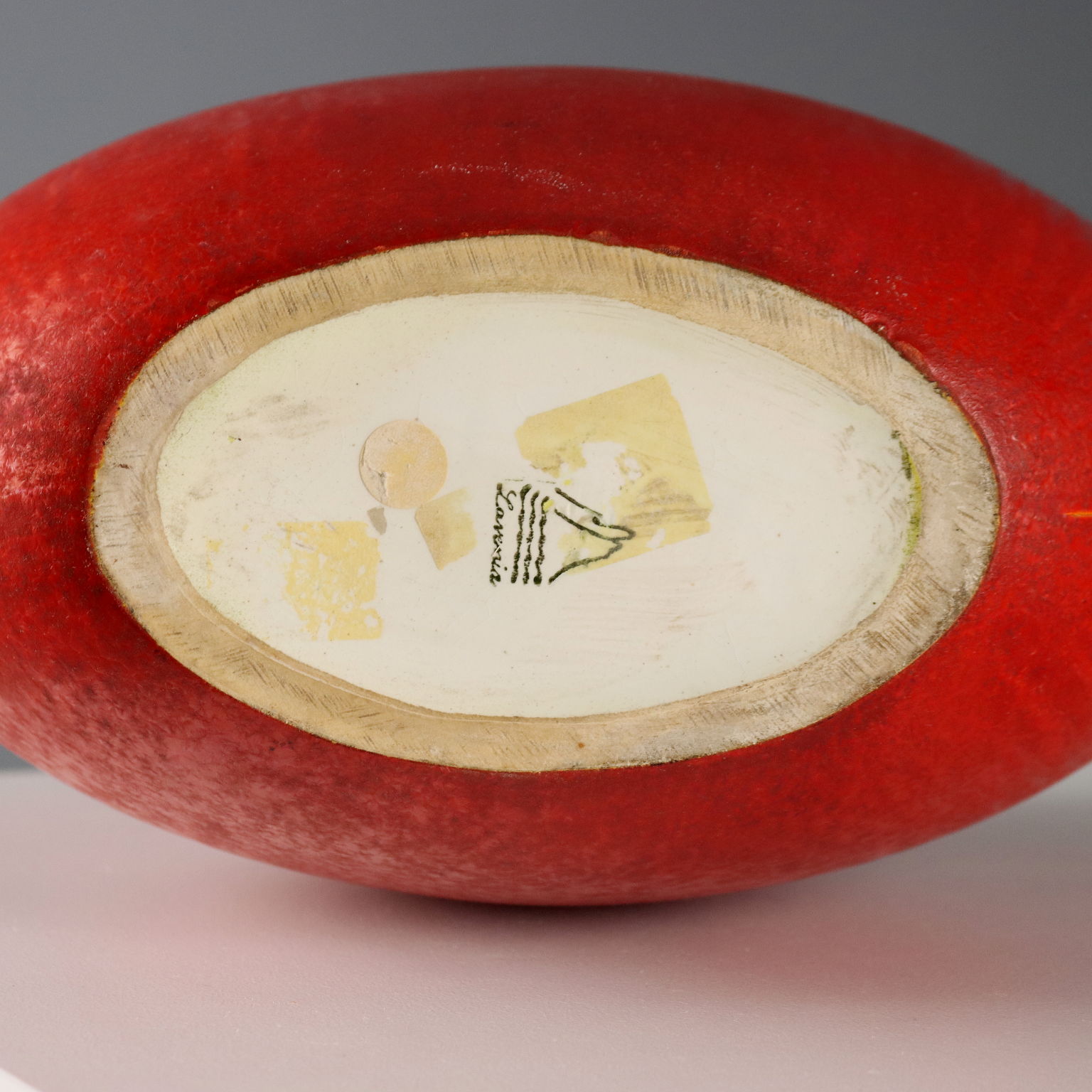 Vaso in ceramica smaltata a colaggio nei toni del rosso e arancio, marchio della manifattura sotto la base.