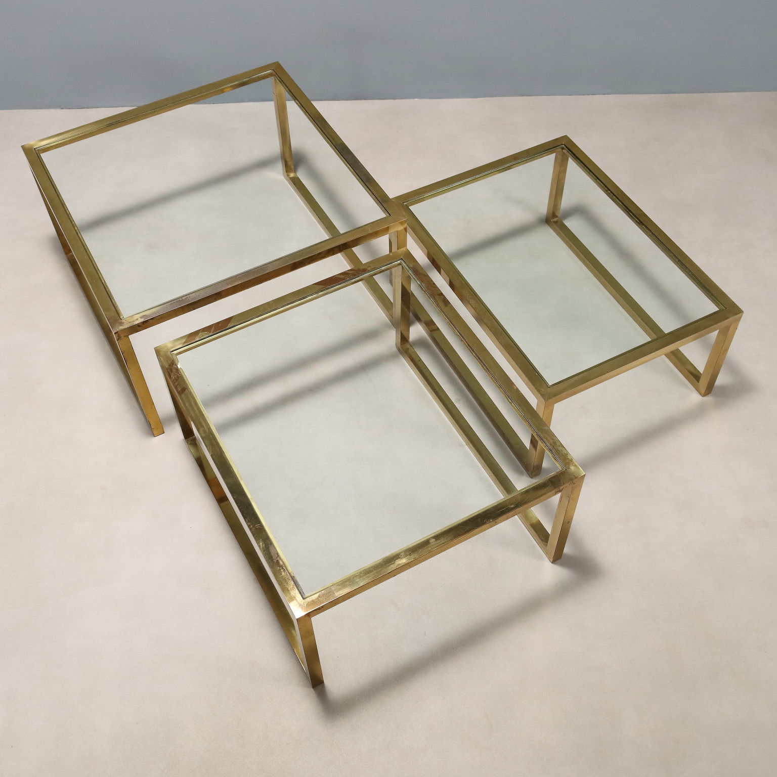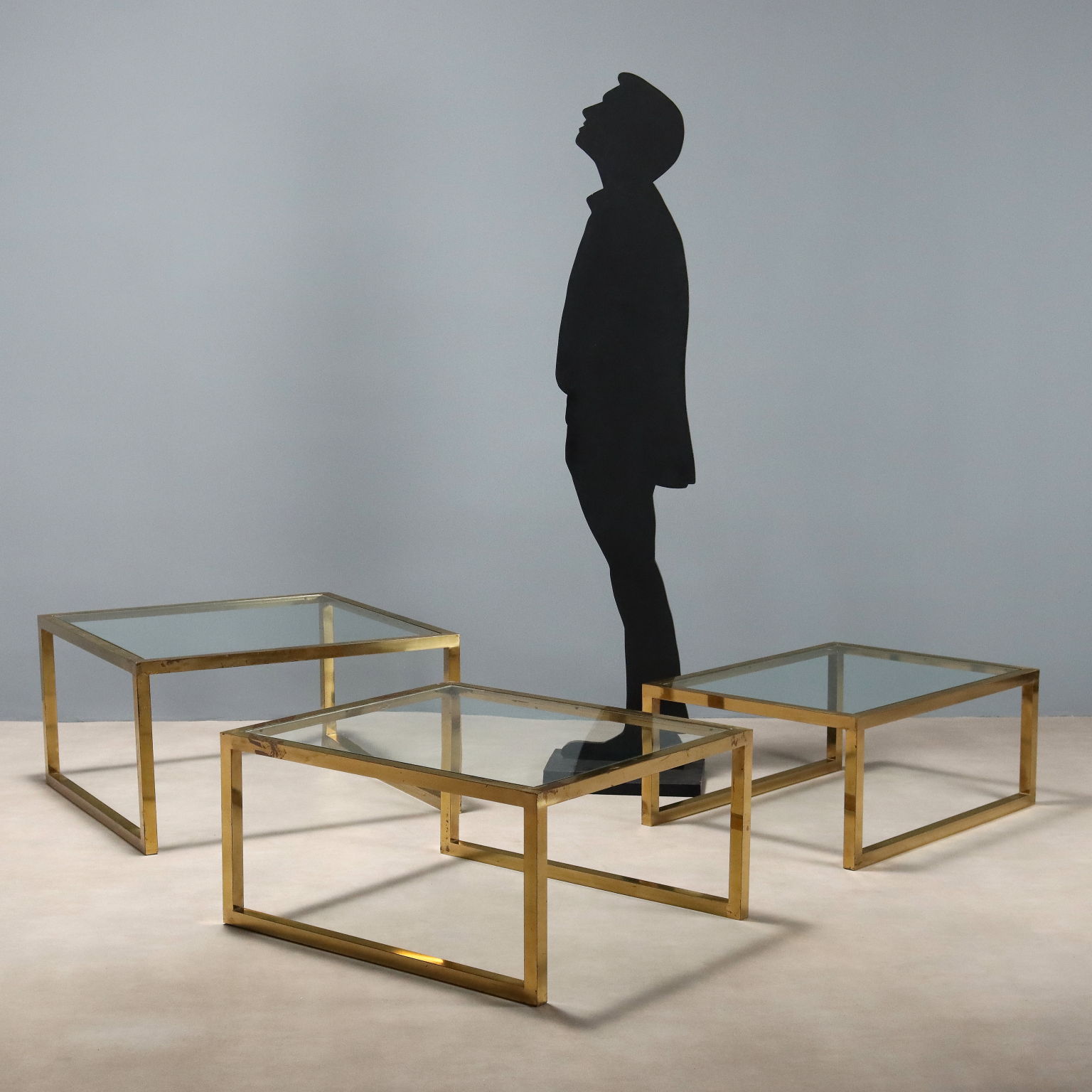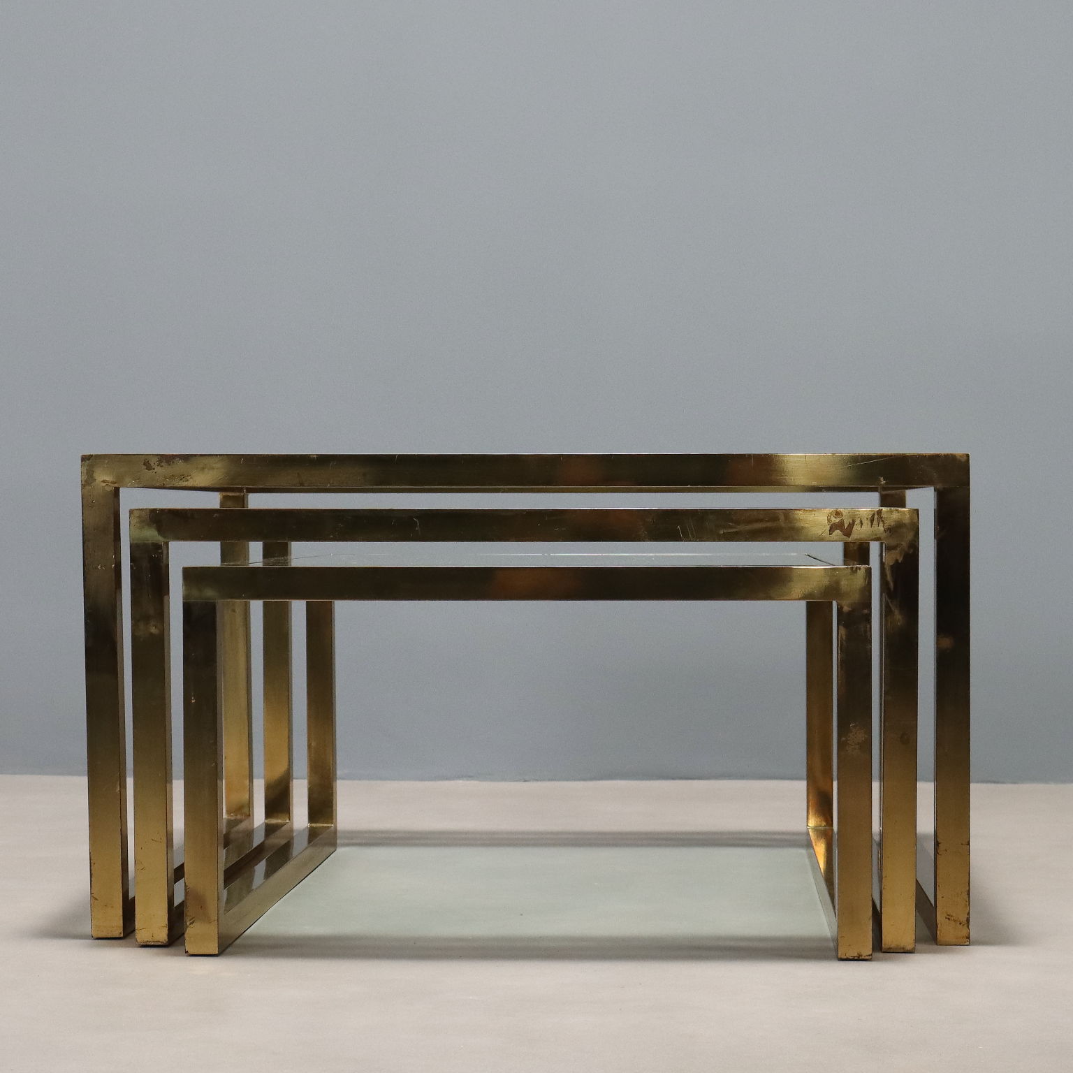 Tre tavolini a nido con struttura in ottone e piano quadrato di differenti misure. In buone condizioni generali con qualche segno del tempo come visibile in foto.