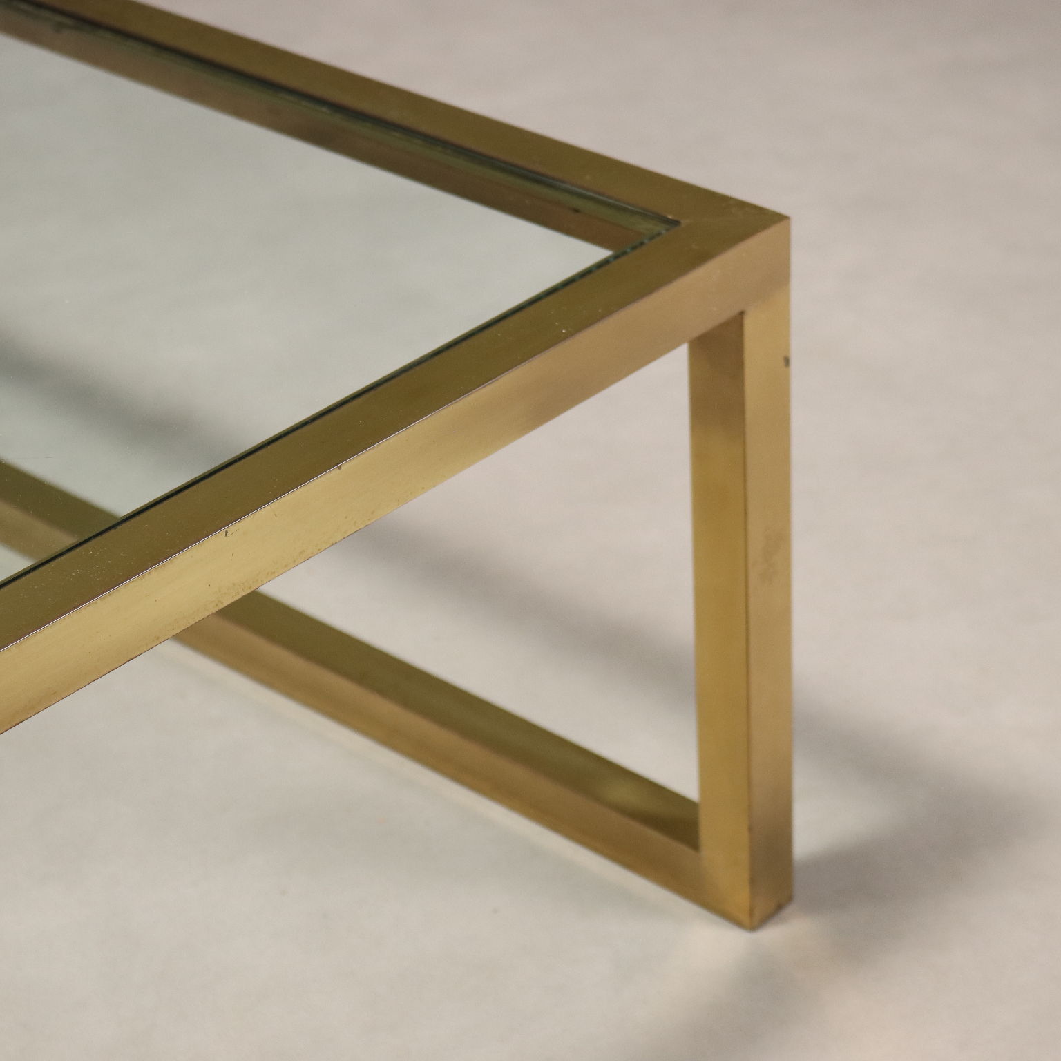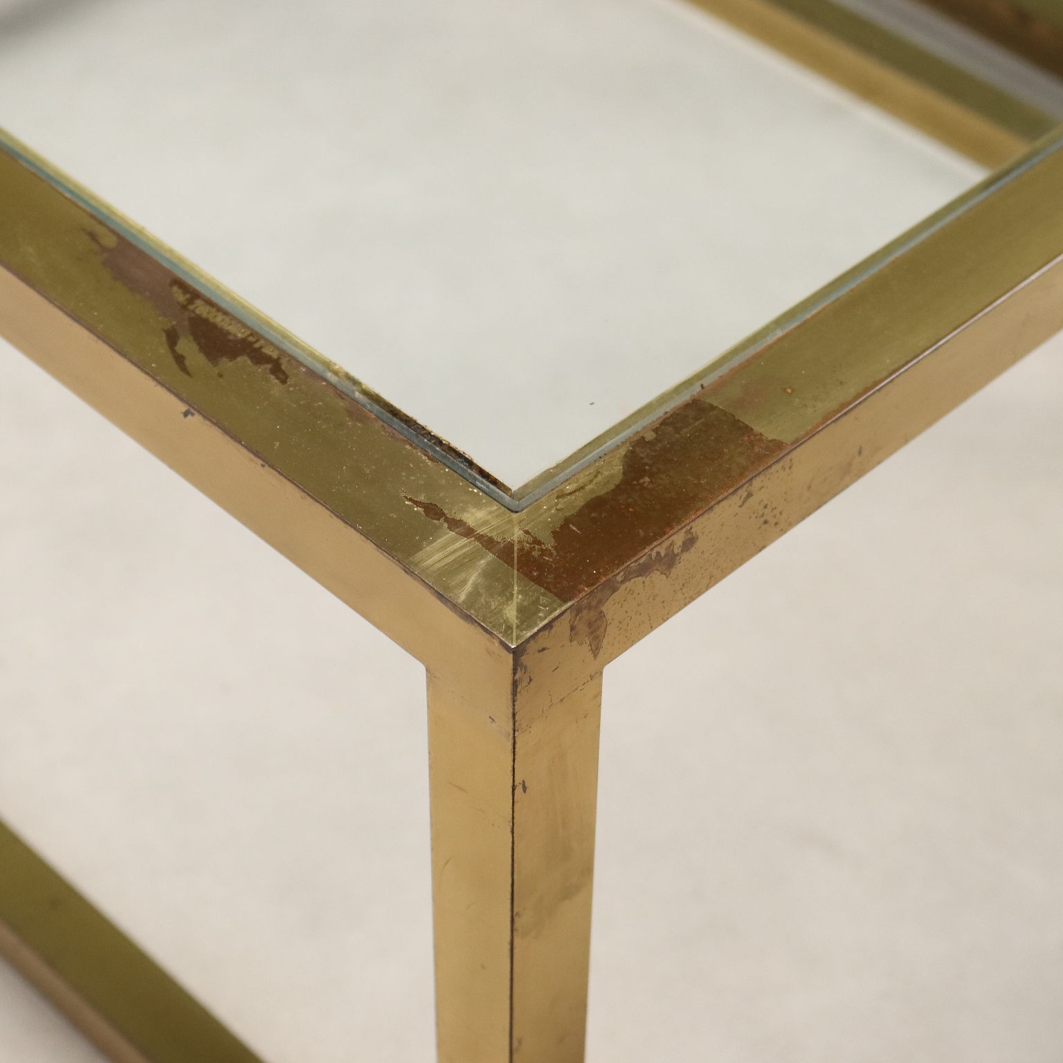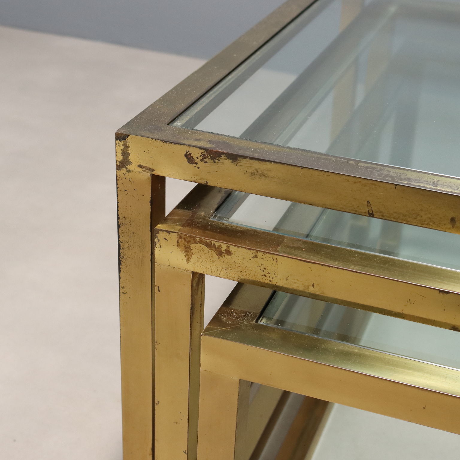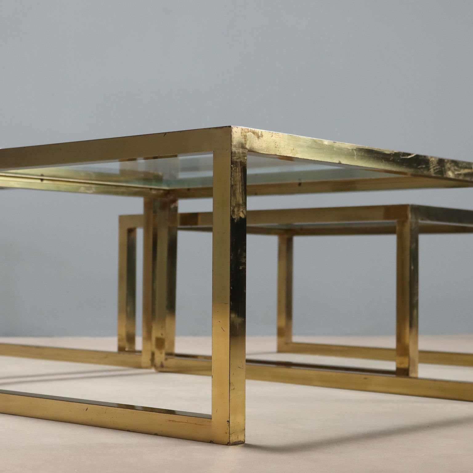 Tre tavolini a nido con struttura in ottone e piano quadrato di differenti misure. In buone condizioni generali con qualche segno del tempo come visibile in foto.