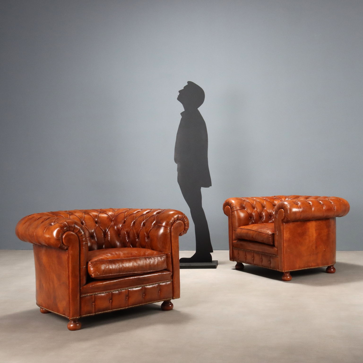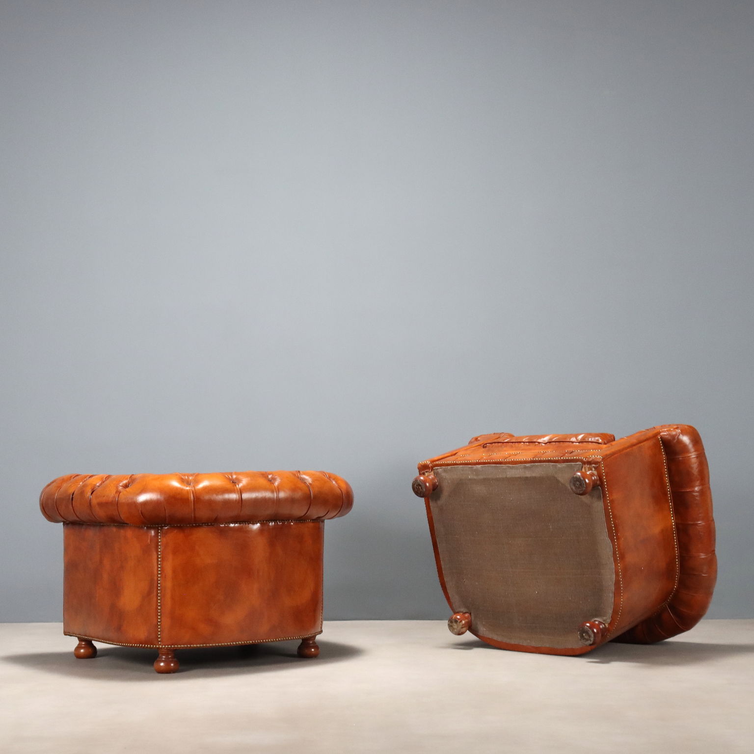 Coppia di poltrone in stile Chesterfield. Pelle marrone conciata, con finitura capitonnè, borchiature dorate, piedi a cipolla in faggio tinto noce. Italia, XX Secolo.
