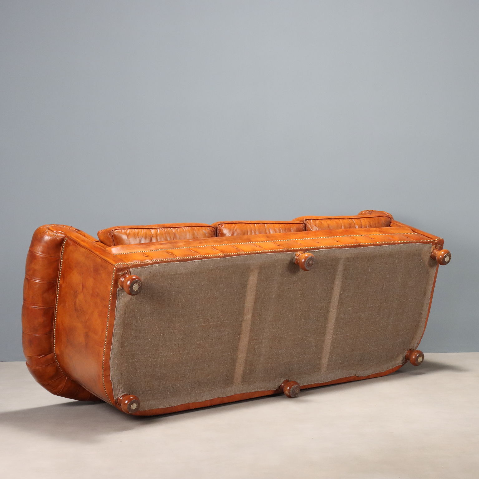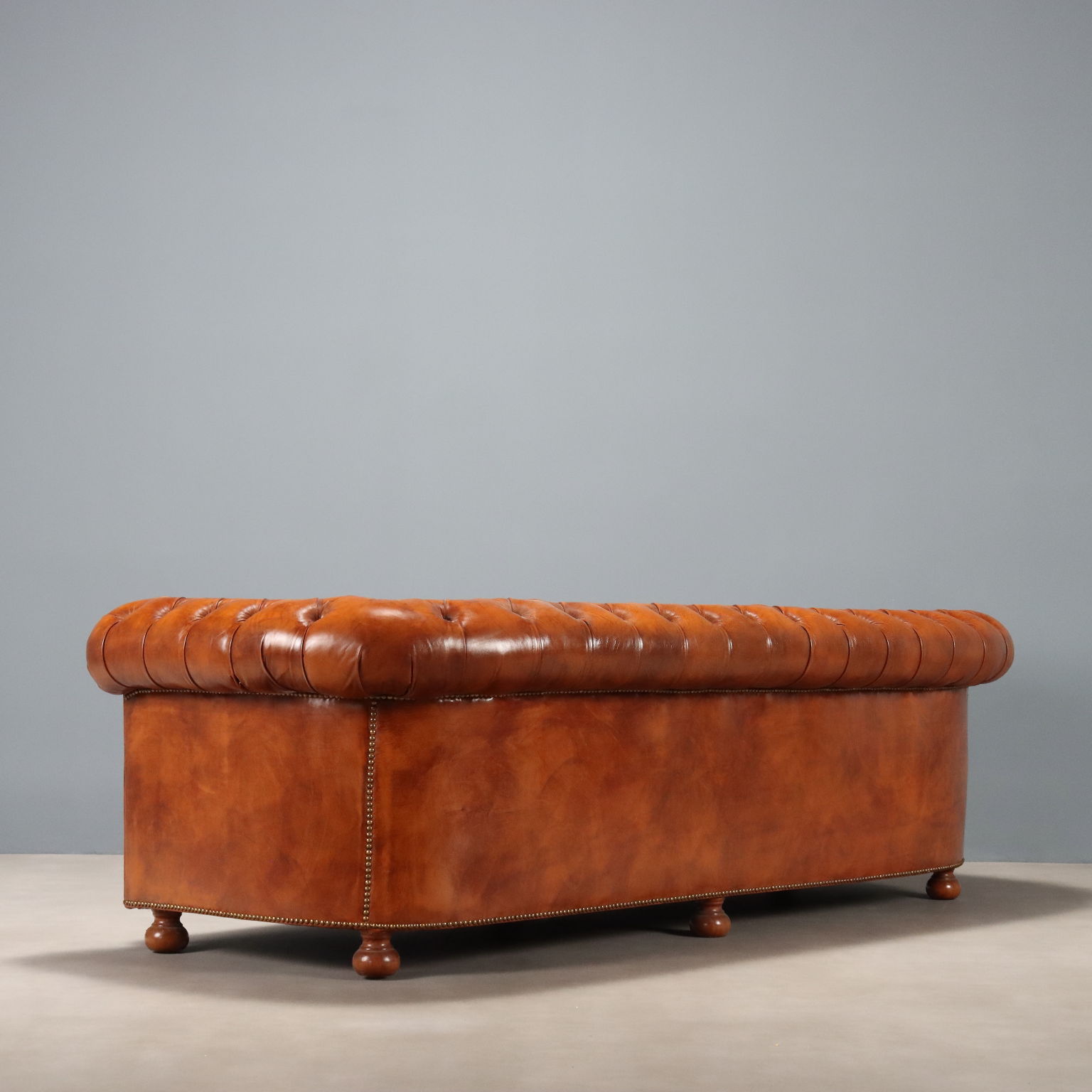 Divano 3 posti in stile Chesterfield. Pelle marrone conciata, con finitura capitonnè, borchiature dorate, piedi a cipolla in faggio tinto noce. Italia, XX Secolo.