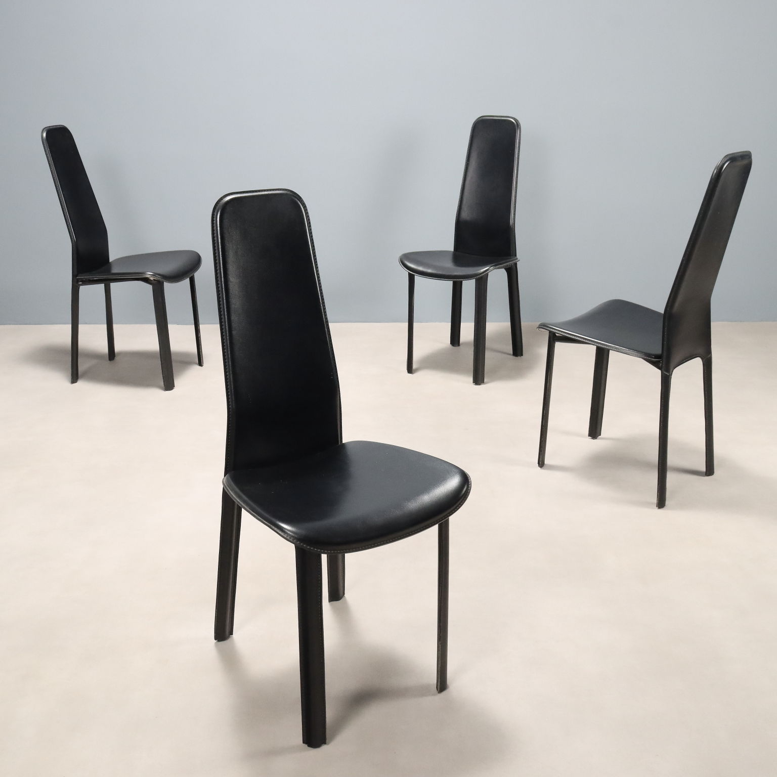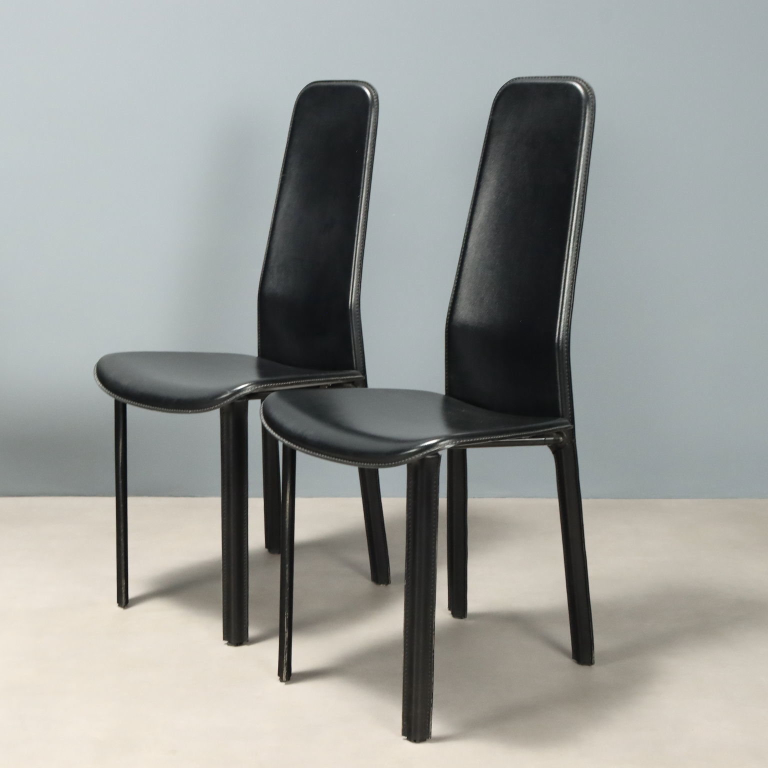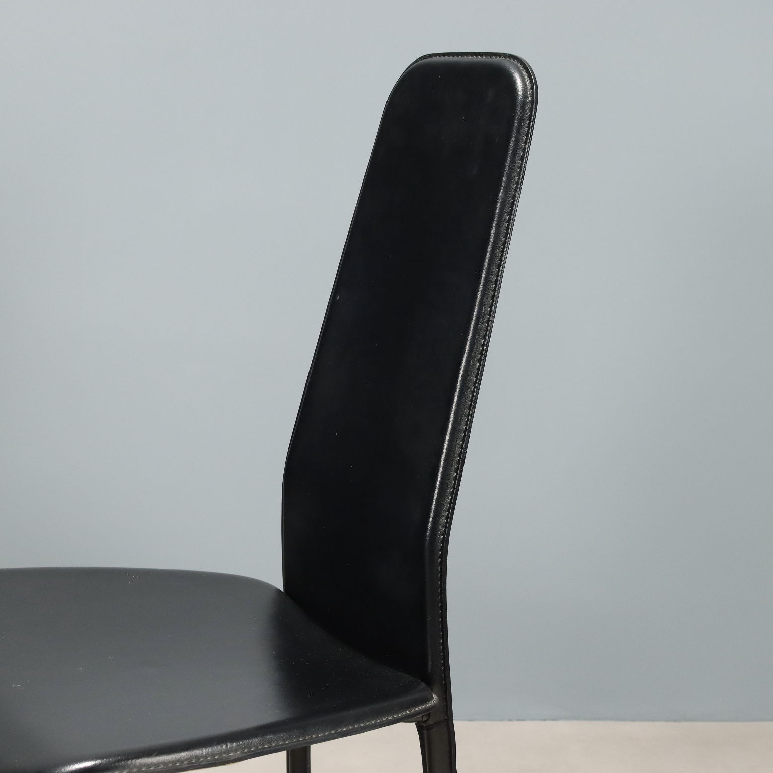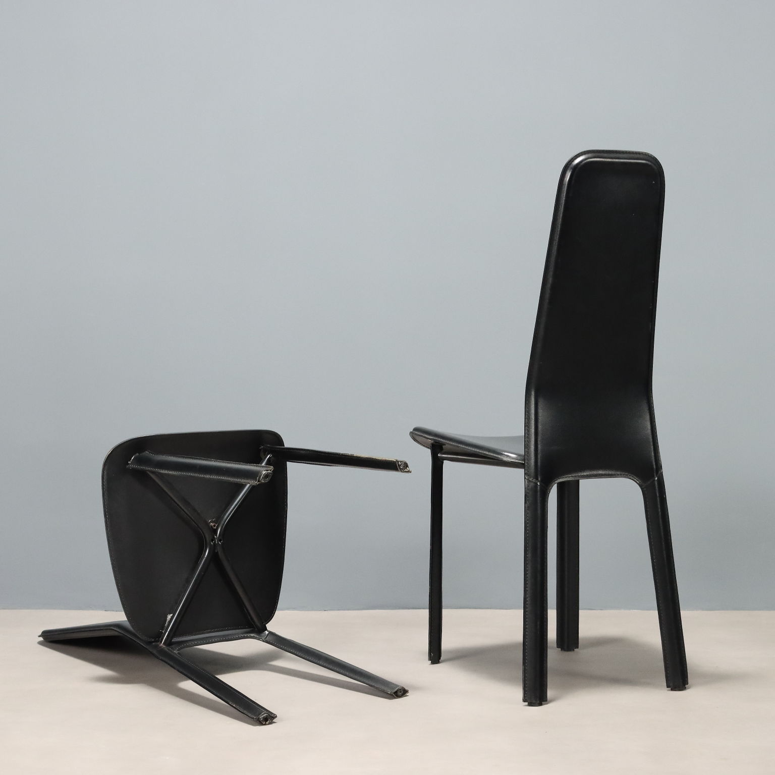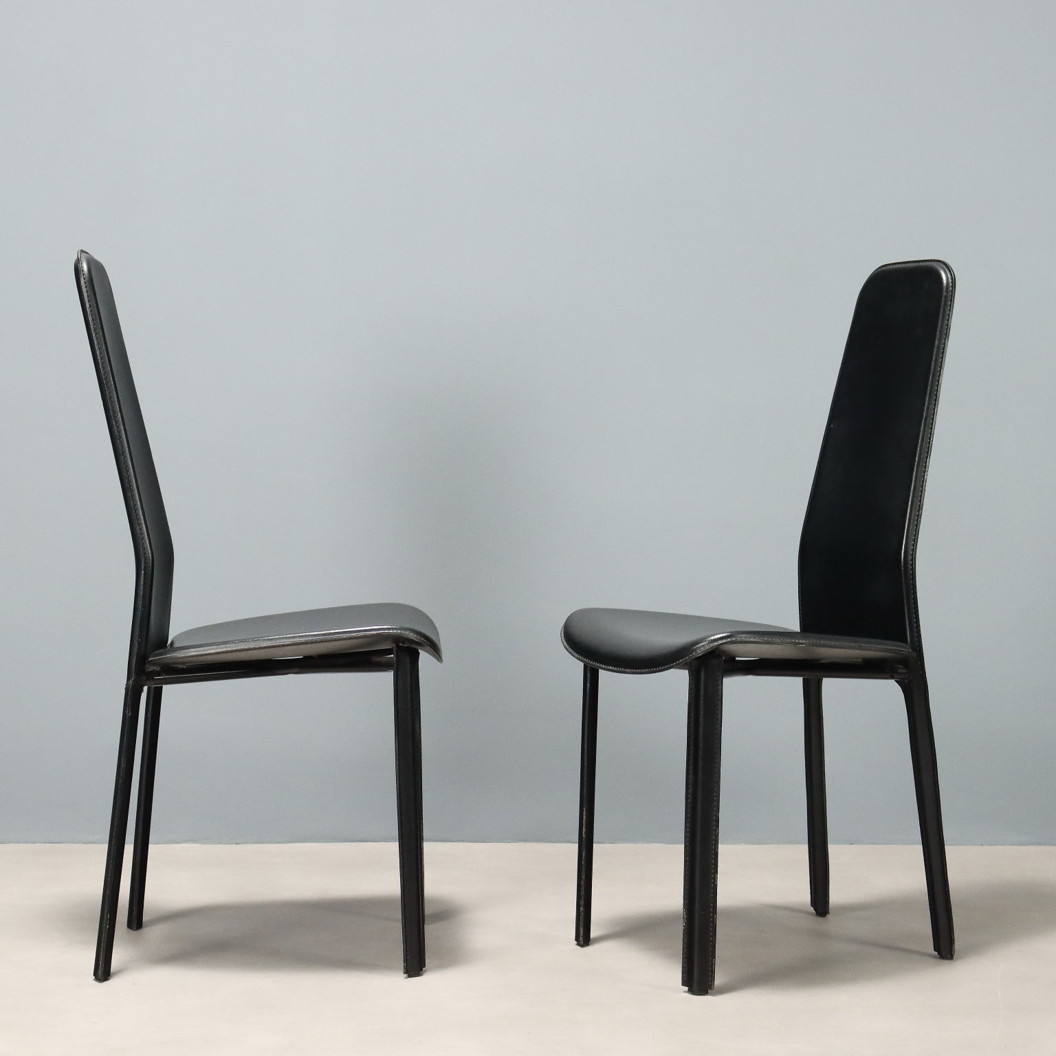 Set di sedie da pranzo con struttura in metallo e rivestimento in pelle nera.