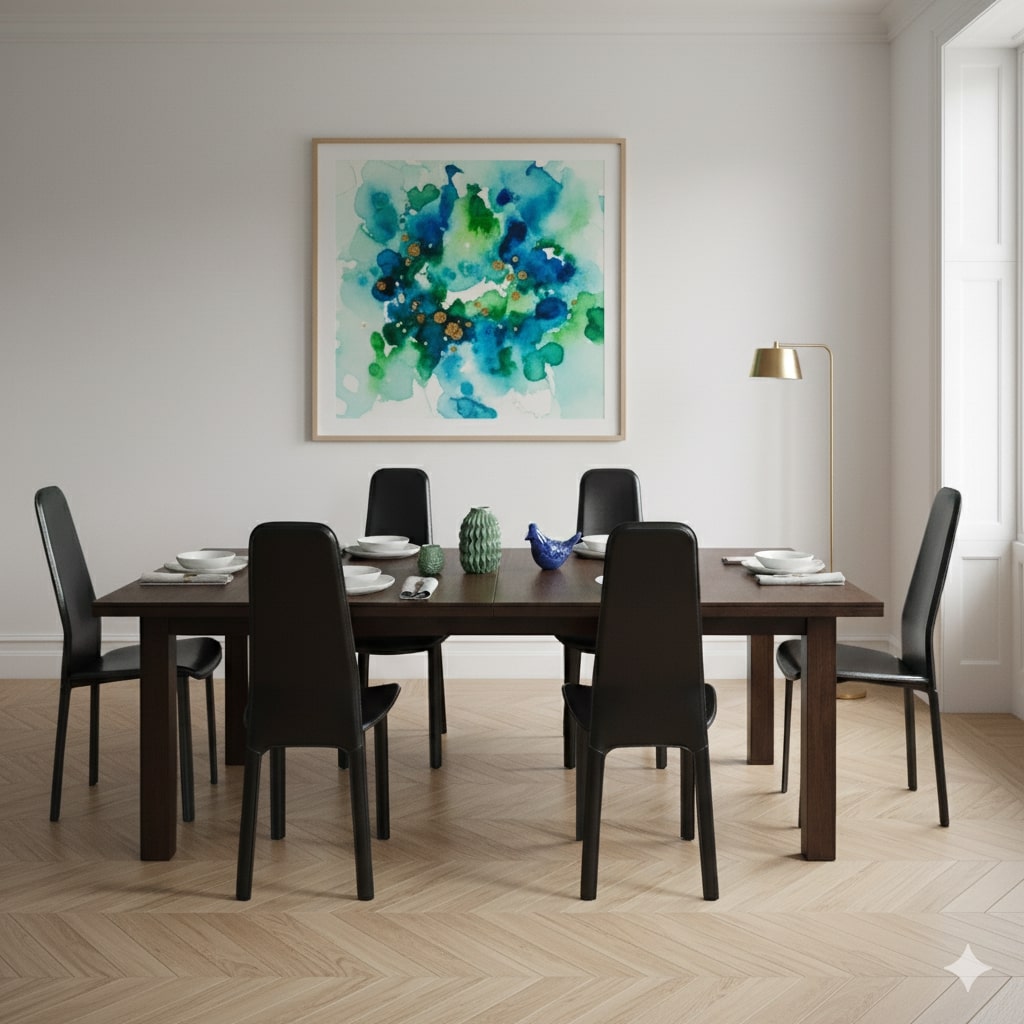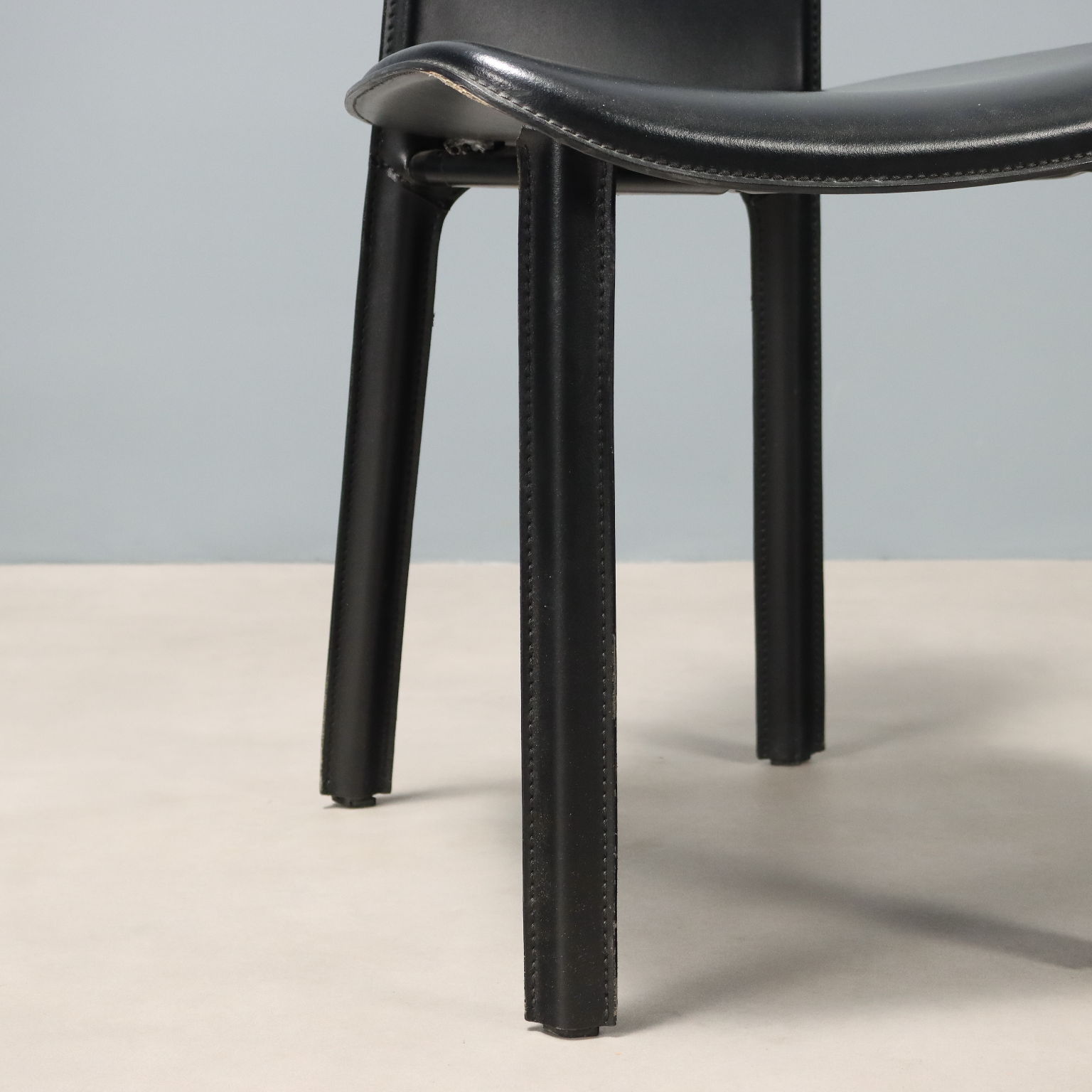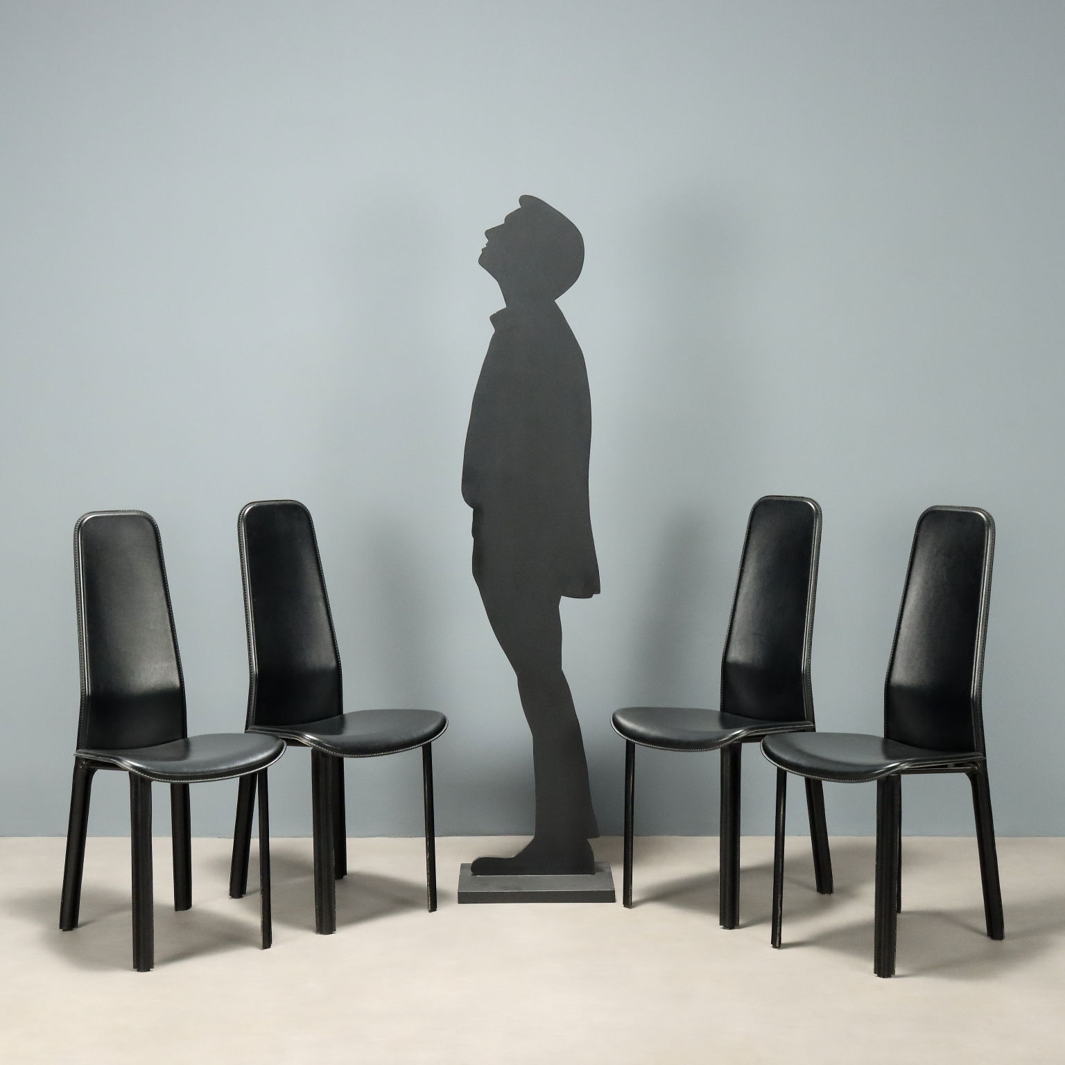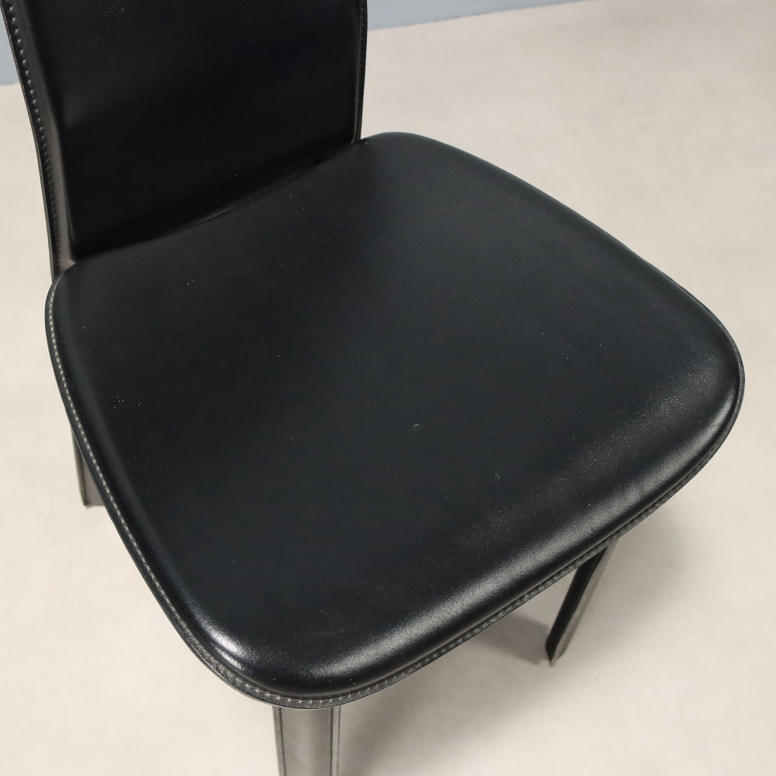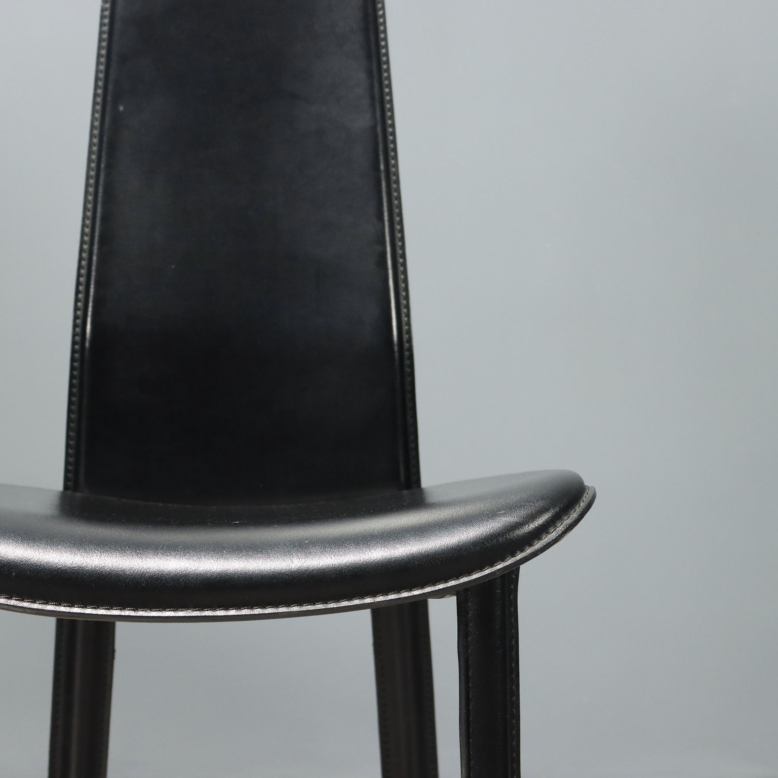 Set di sedie da pranzo con struttura in metallo e rivestimento in pelle nera.