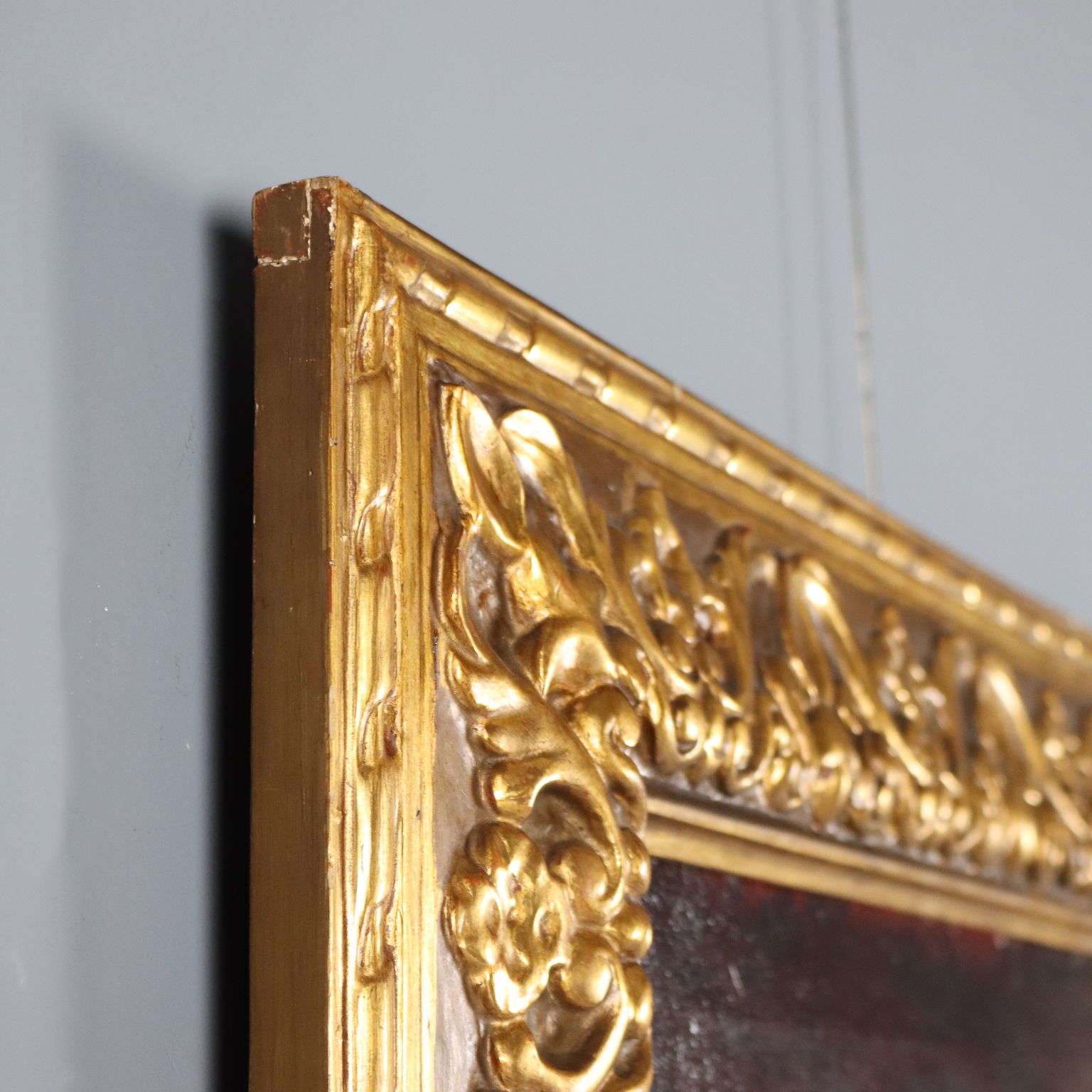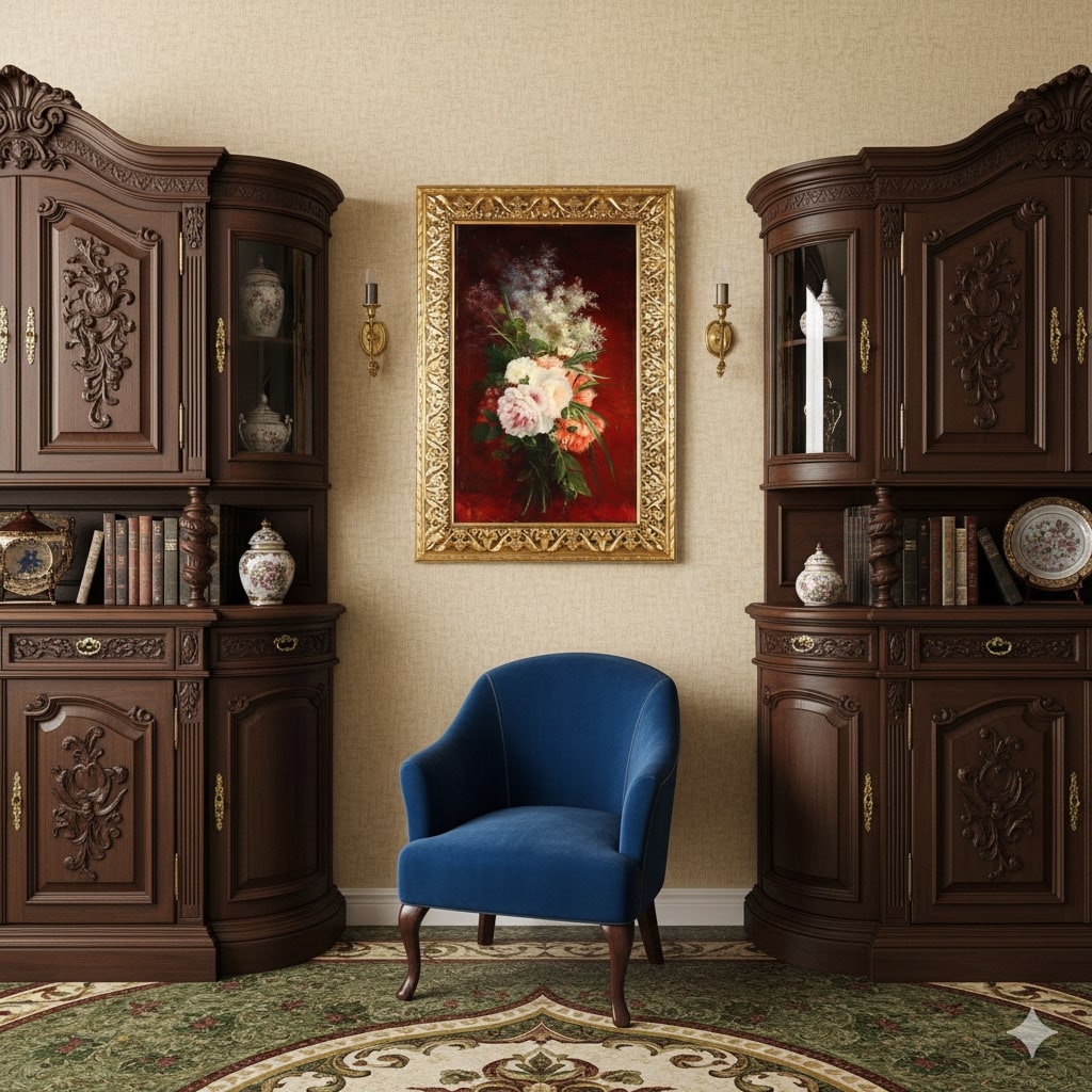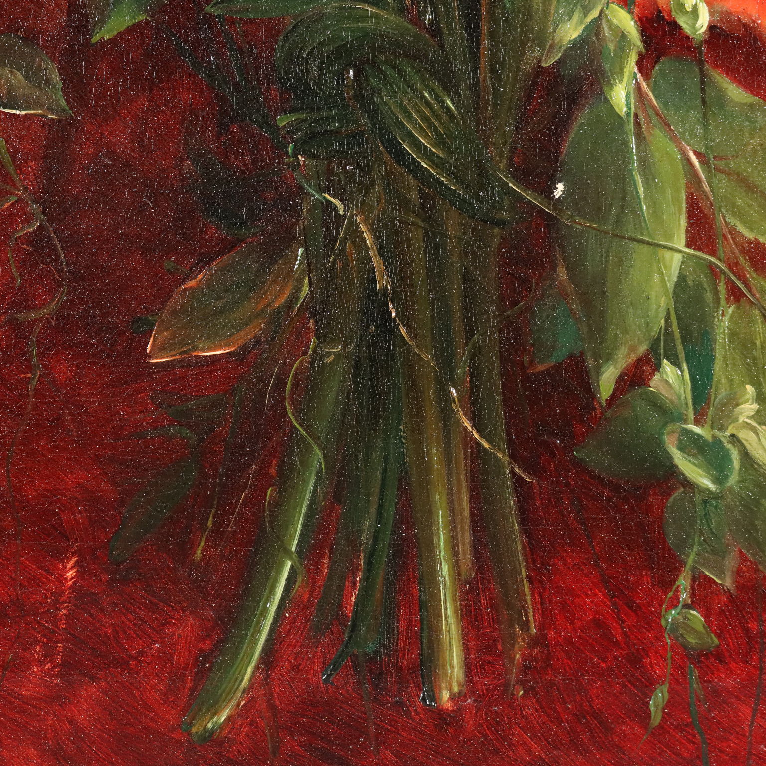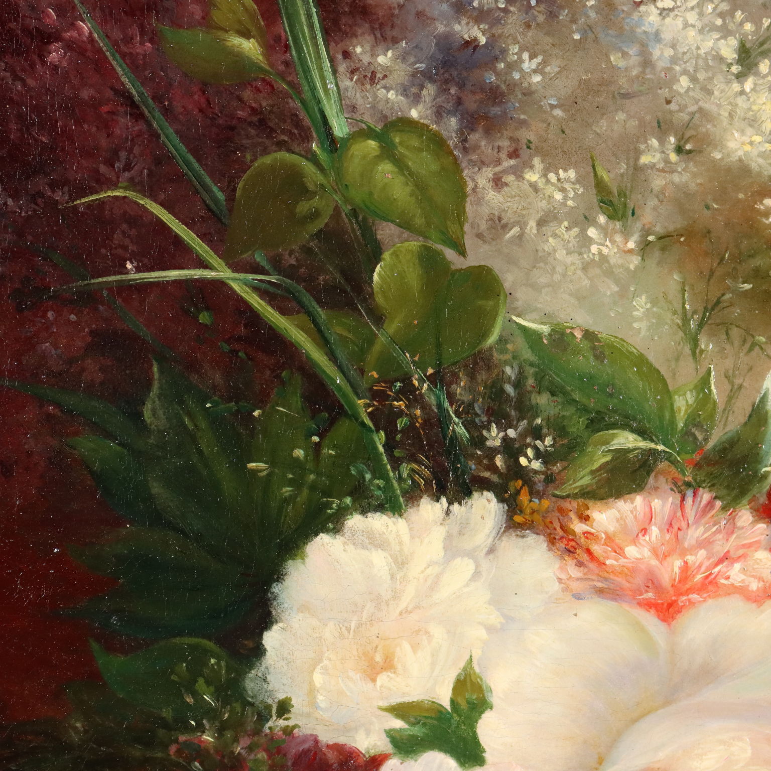 Olio su tela. Firmato R. Marti e datato in basso a destra. È opera giovanile di Ricardo Marti Aguilo (1868 -1936), pittore spagnolo autore di paesaggi e composizioni floreali. Il mazzo spicca per la luminosità delle peonie centrali, bianche e rosate che si irraggia sullo sfondo scuro accendendolo nella parte inferiore di sfumature rossastre; nella parte superiore il mazzo di "velo da sposa" sfuma nel buio soprastante. IL dipinto è presentato in cornice dorata della prima metà del '900.