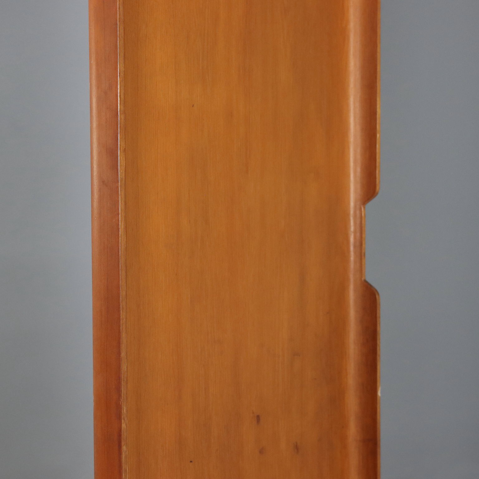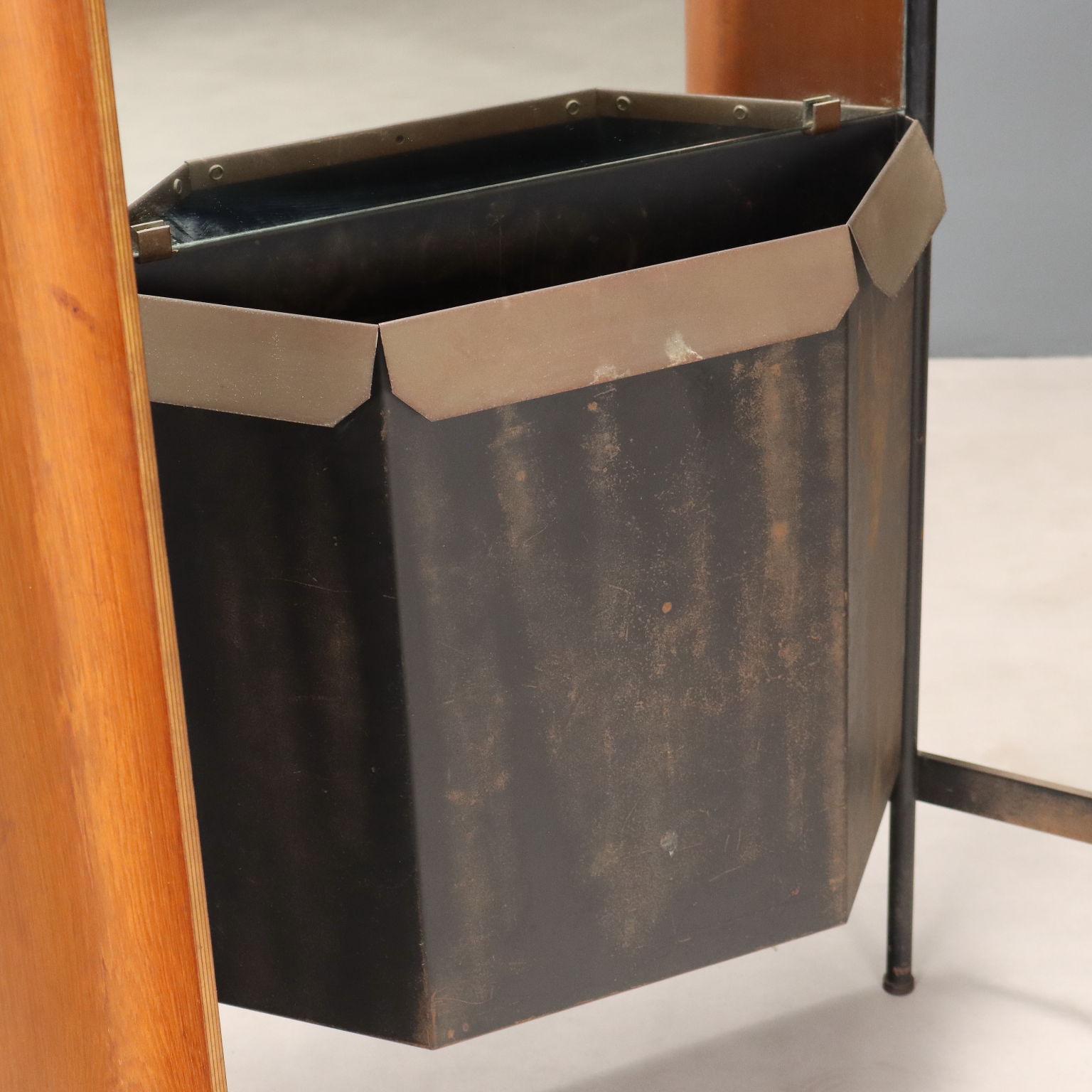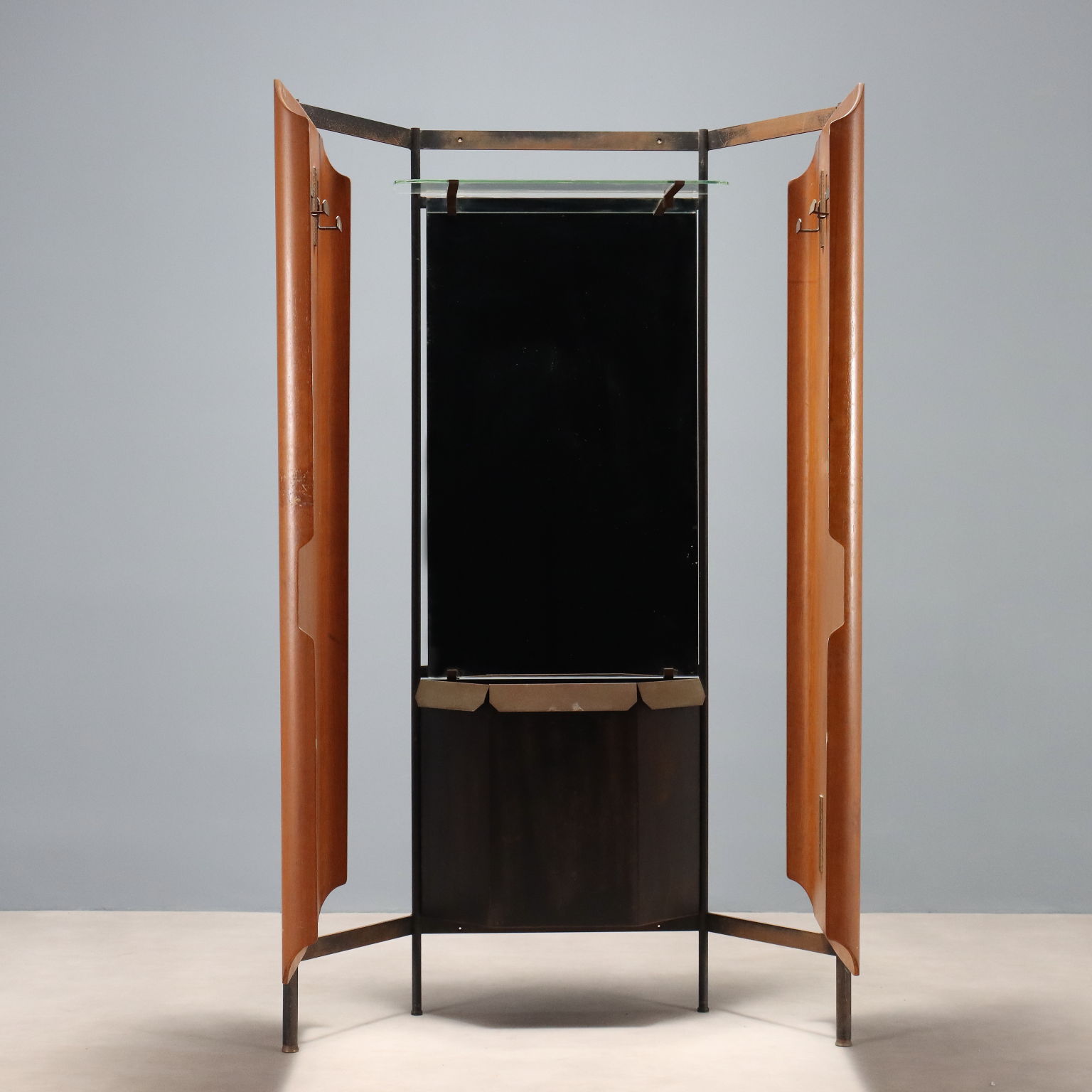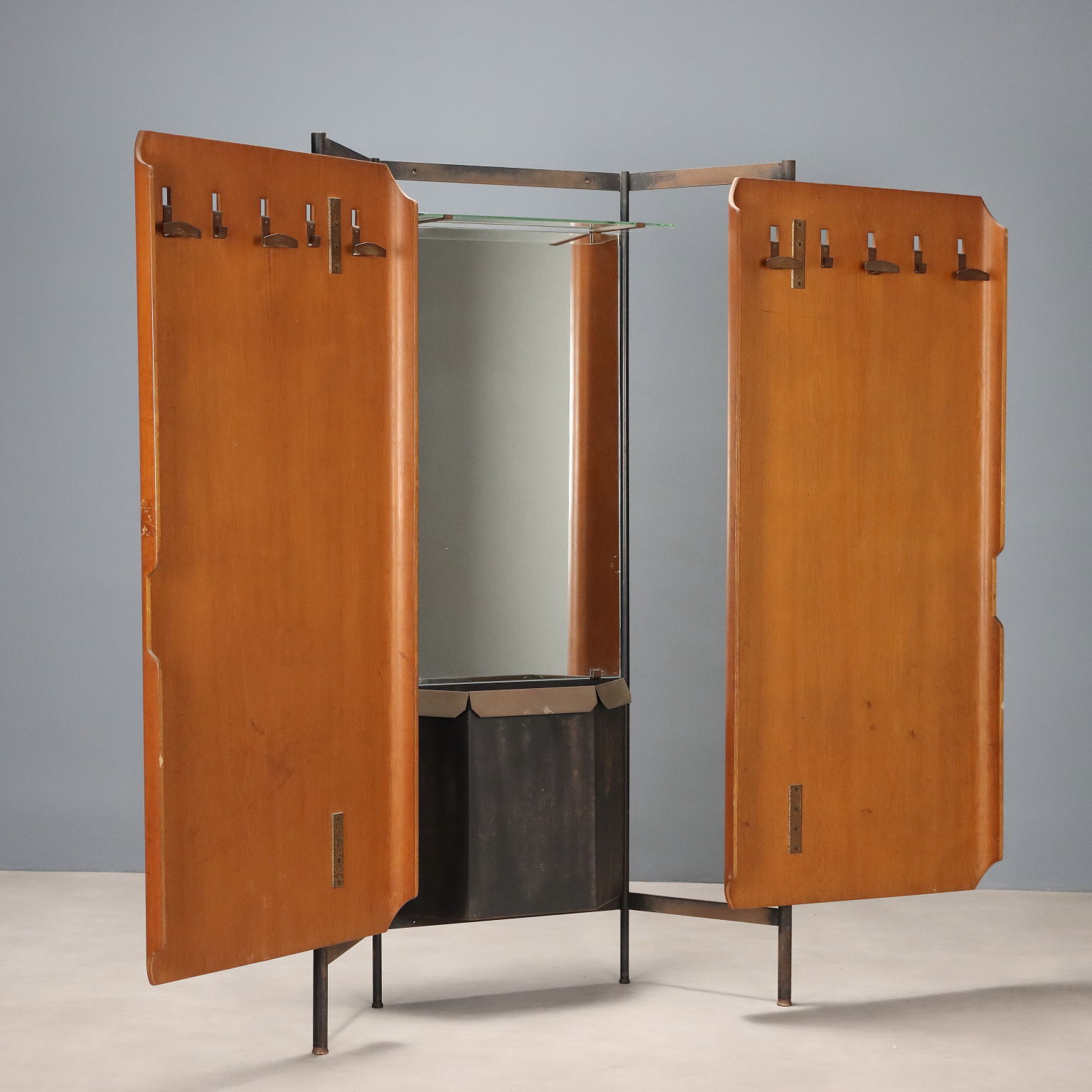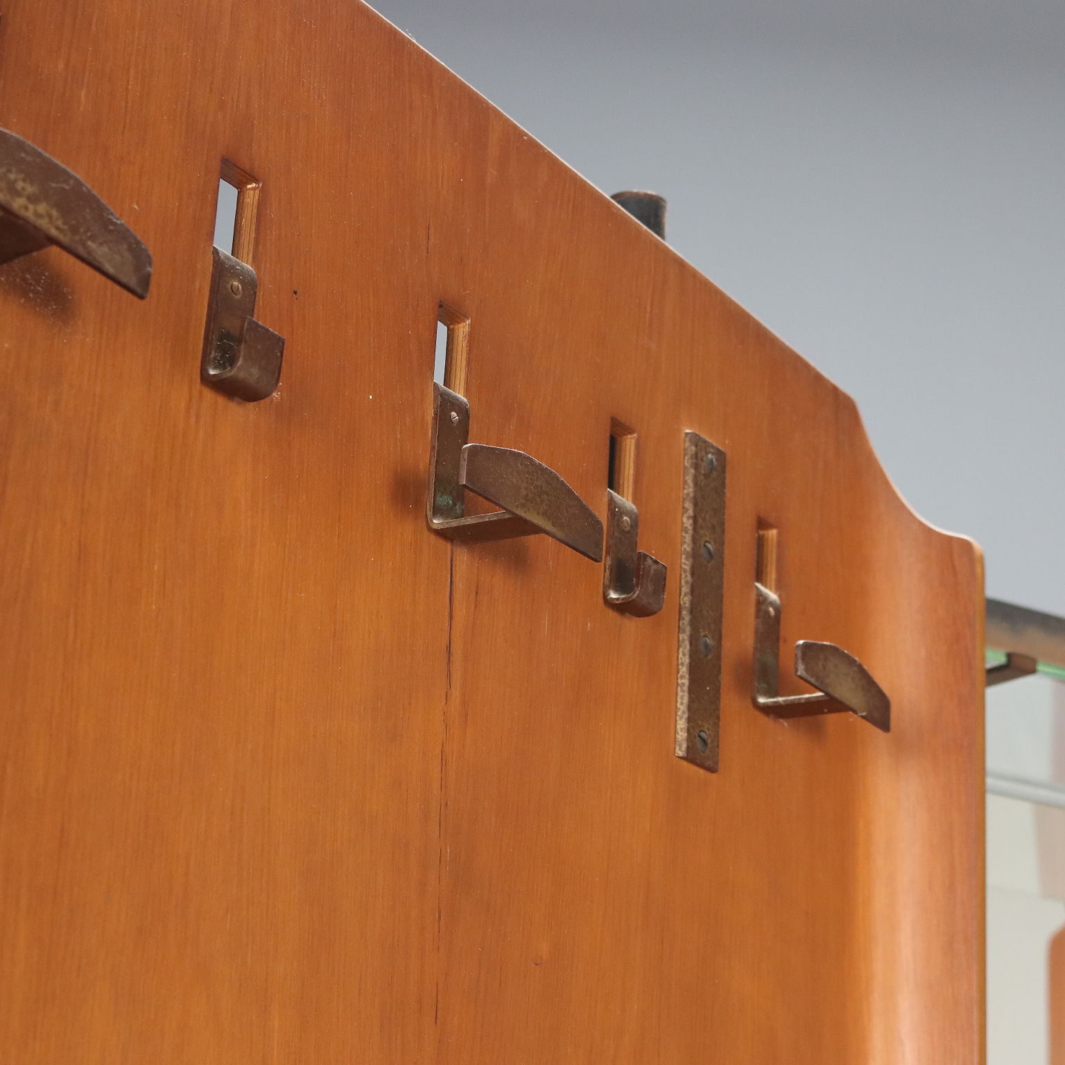 Descrizione Appendiabiti vintage con ante in compensato impiallacciato teak che celano uno specchio, una mensola, un contenitore e appendini in ottone.