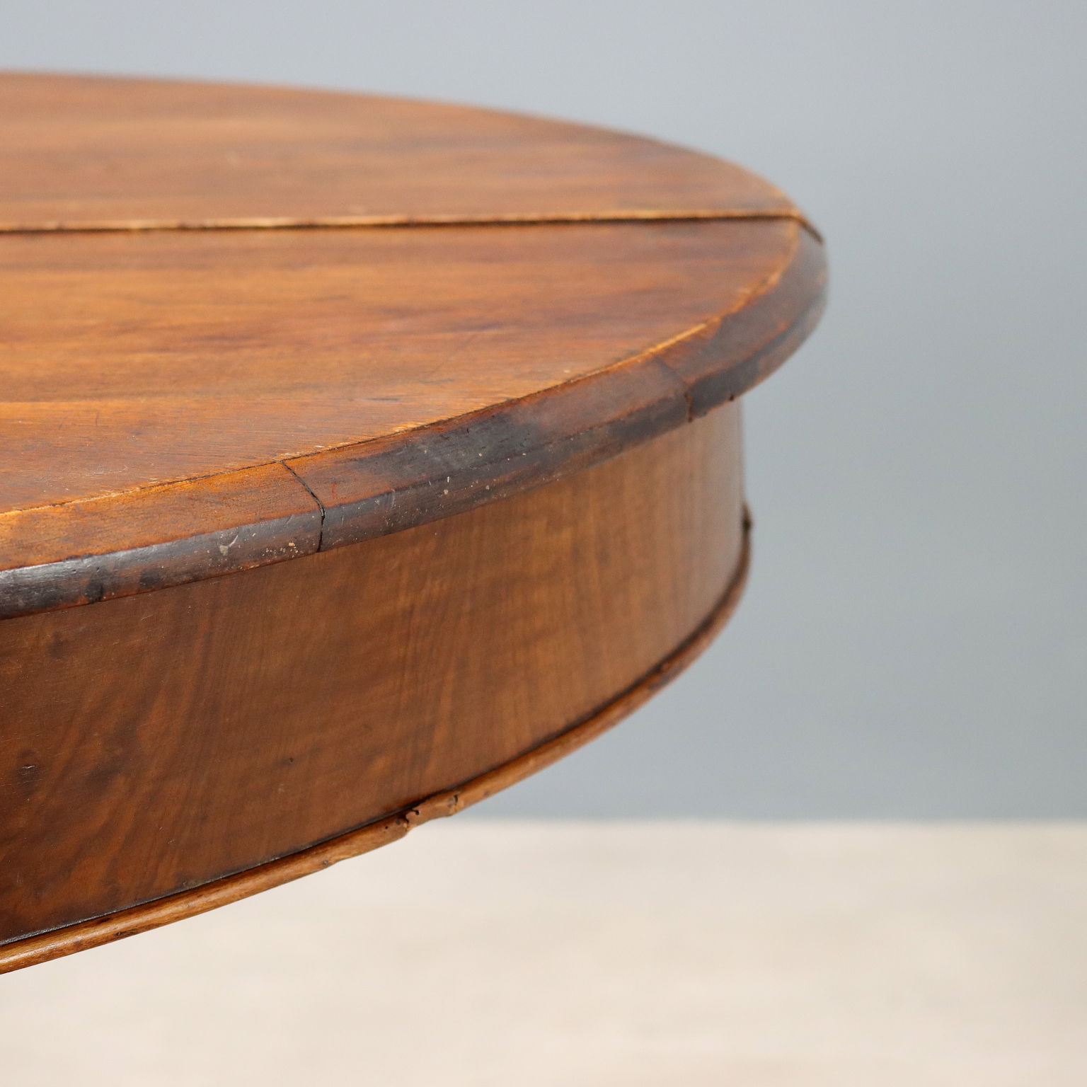 Tavolo tondo in noce. Piano allungabile con gambe di sostegno a scomparsa, gamba centrale tornita poggiante su quattro piedi mossi e intagliati, culminanti con riccioli. Italia, XIX Secolo.