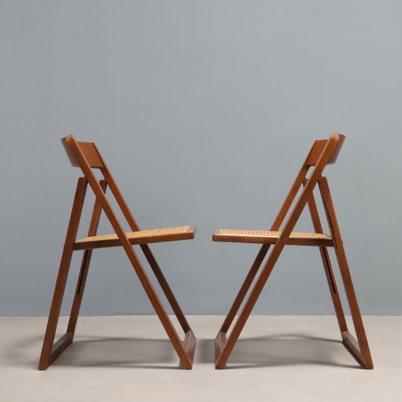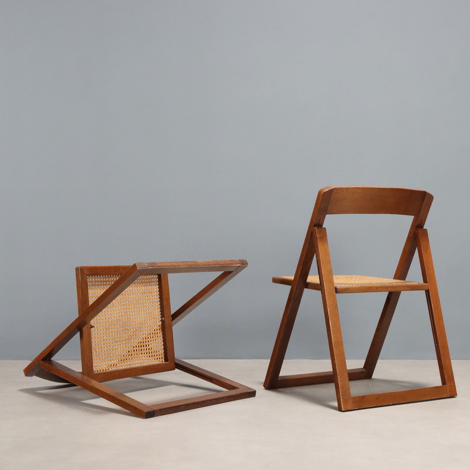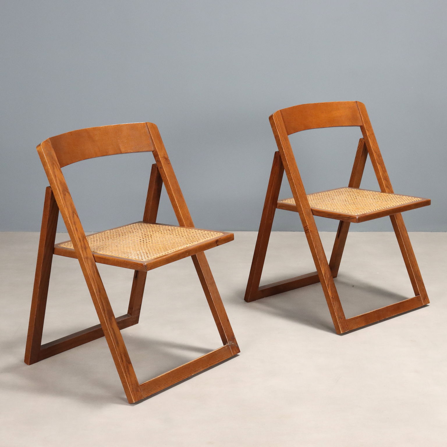 Coppia di sedie pieghevoli con struttura in legno e seduta in paglia di Vienna.