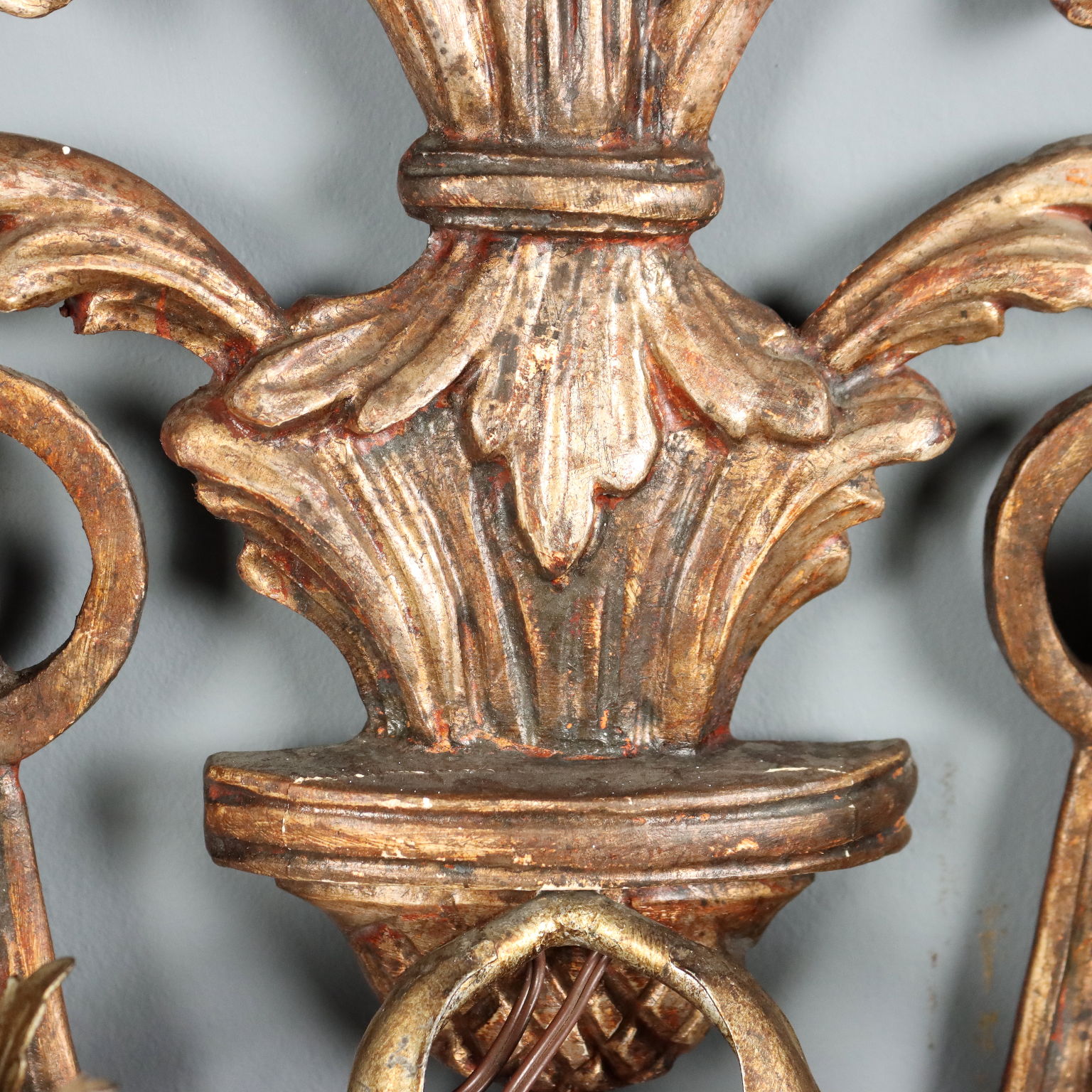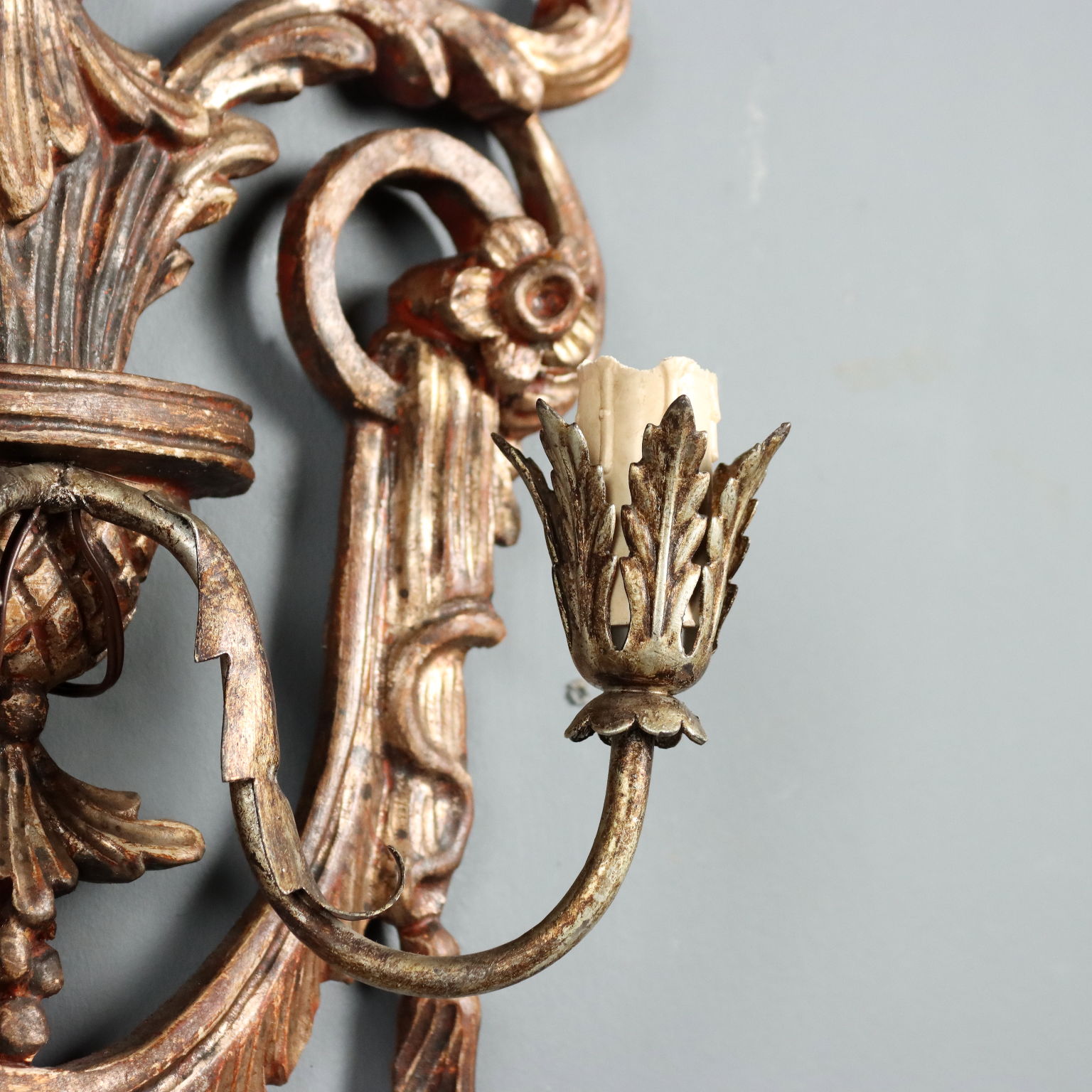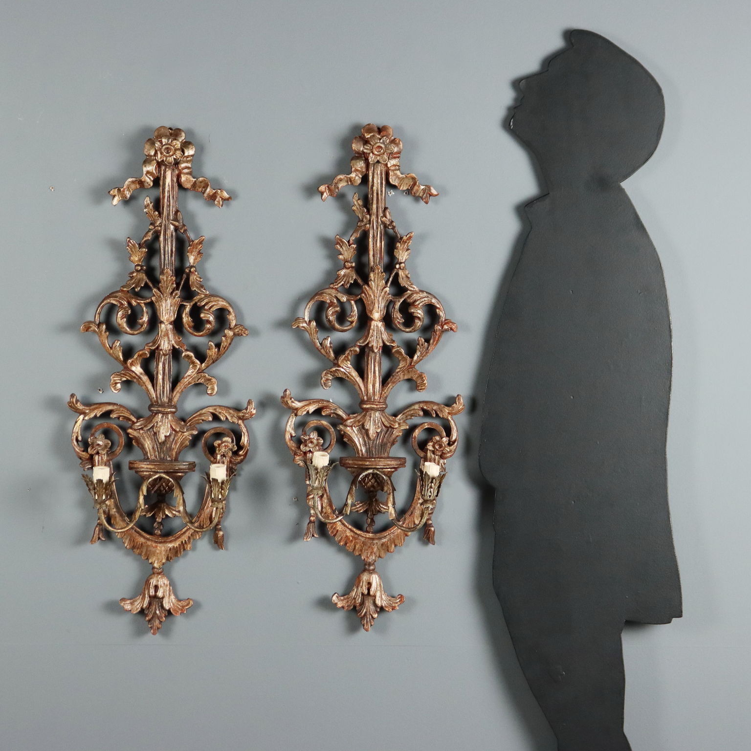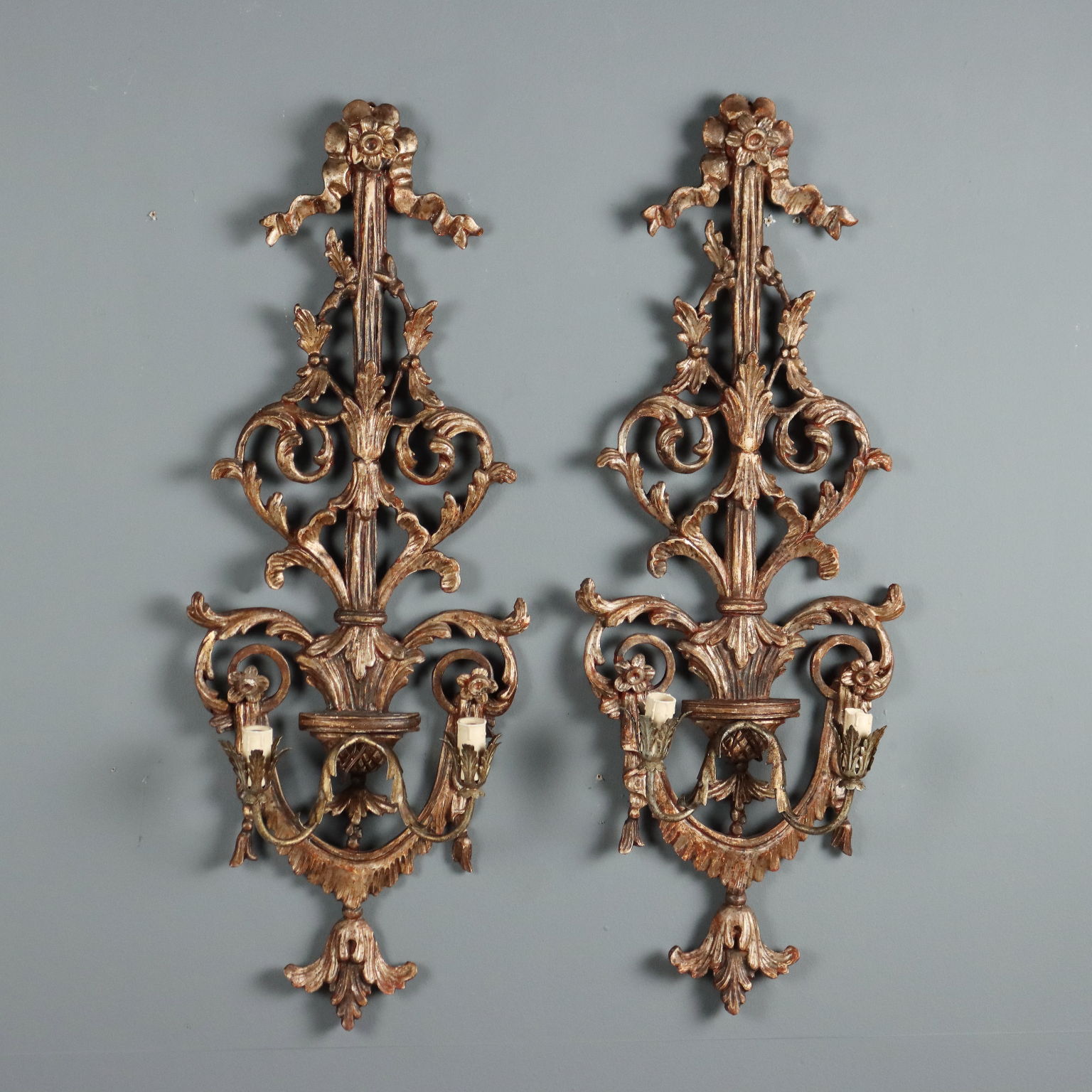 Coppia di applique a due luci in legno traforato e dorato a mecca. Intagli fogliacei, floreali, volute e nastri, braccia mosse in ferro e bobeches in lamierino lavorato. Italia, inizio XX Secolo.