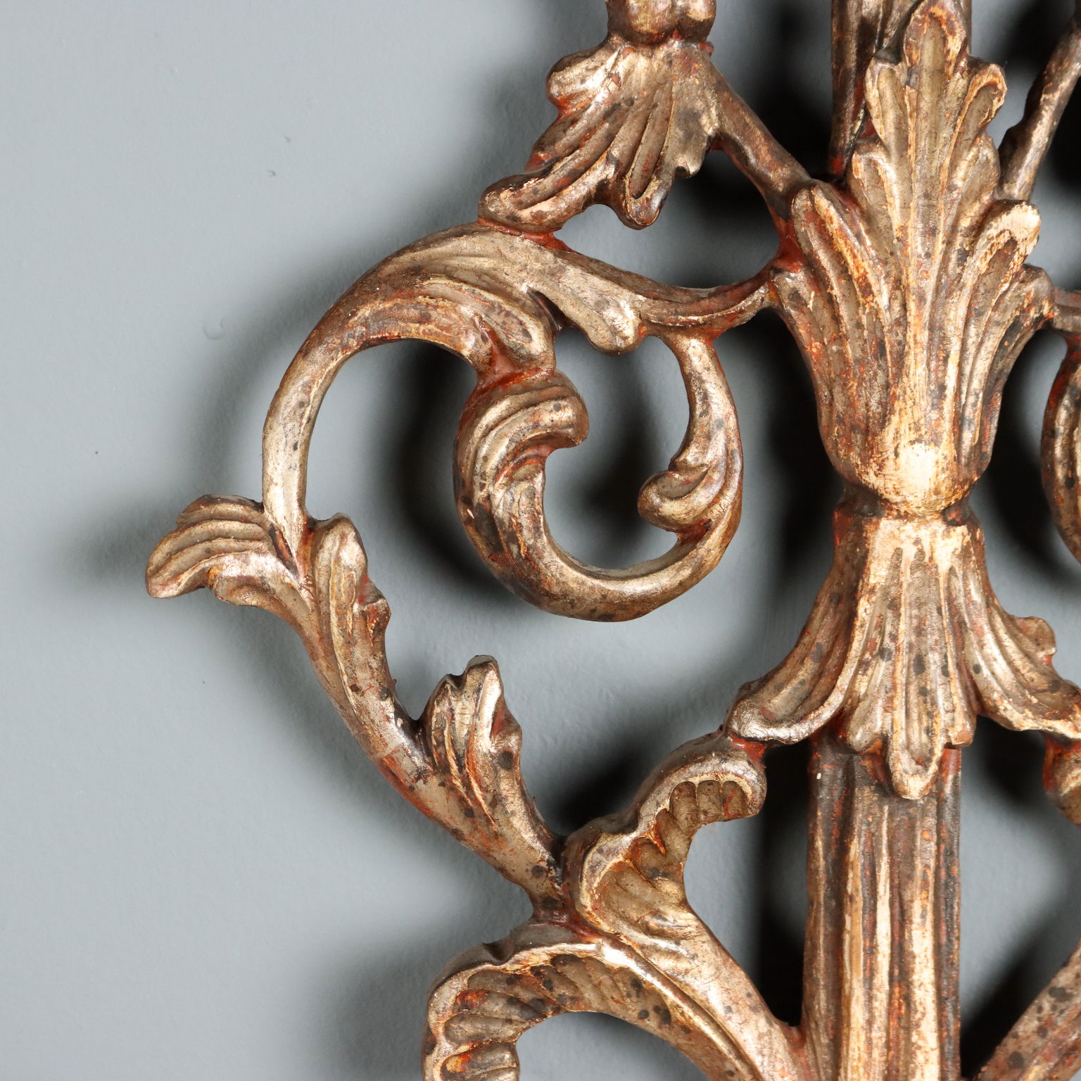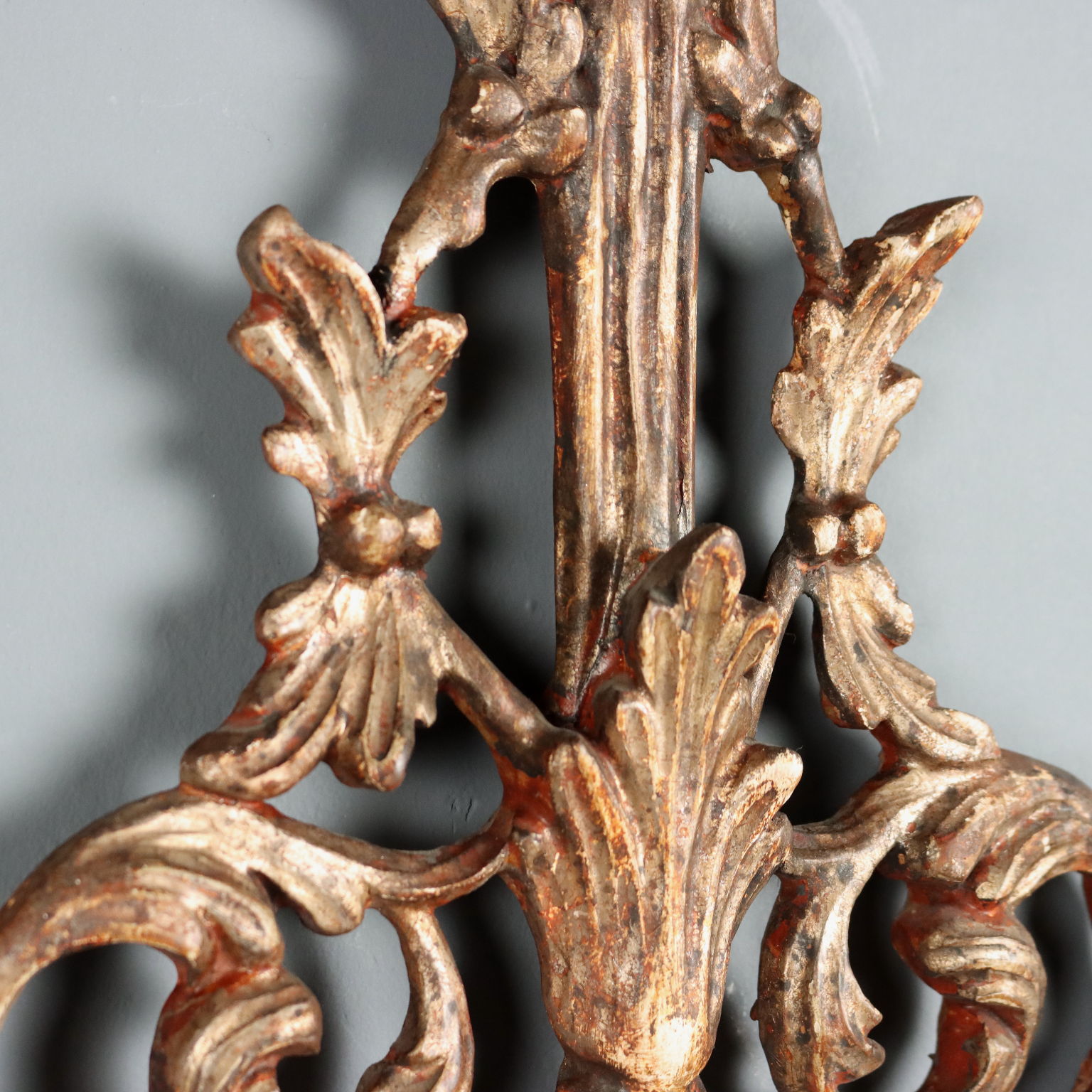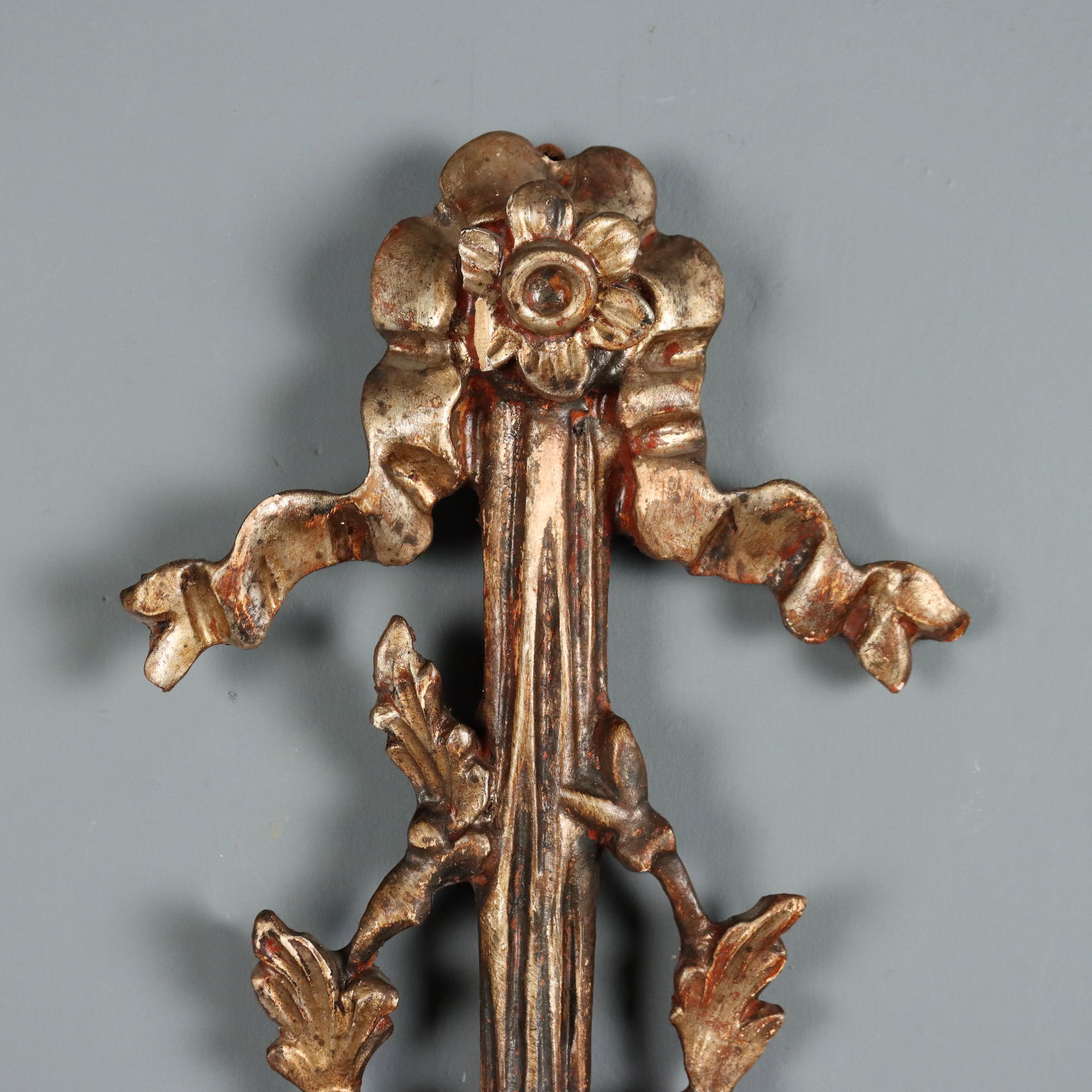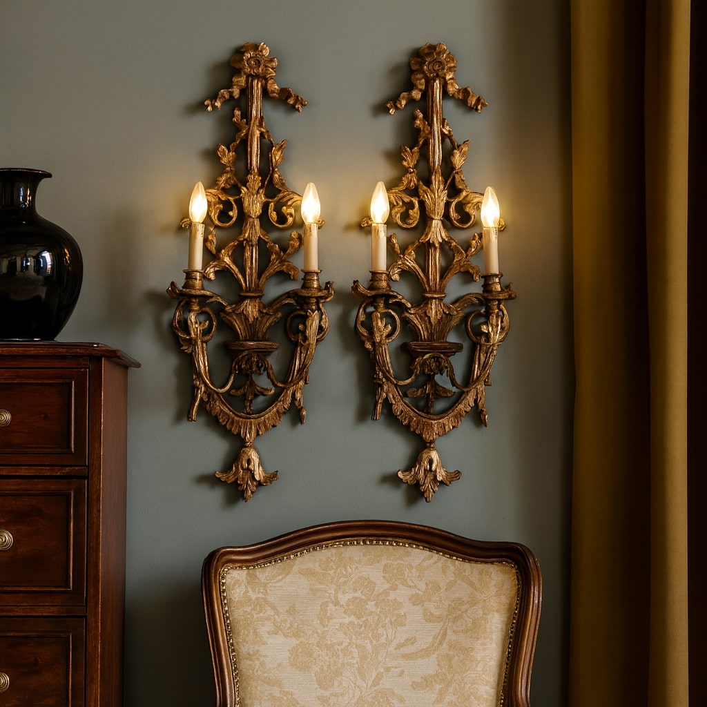 Coppia di applique a due luci in legno traforato e dorato a mecca. Intagli fogliacei, floreali, volute e nastri, braccia mosse in ferro e bobeches in lamierino lavorato. Italia, inizio XX Secolo.