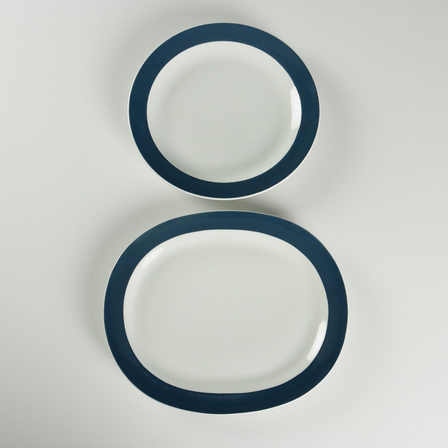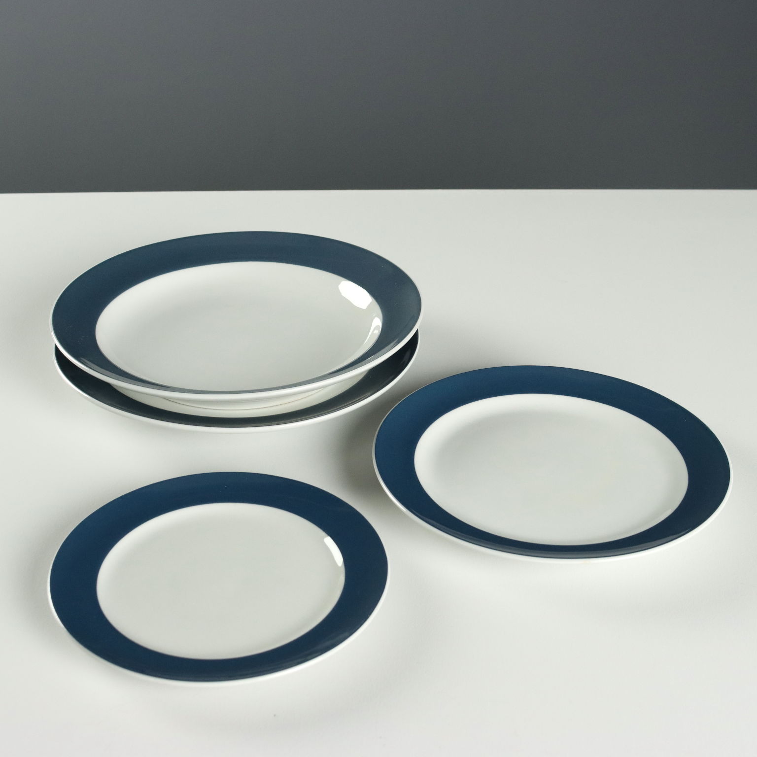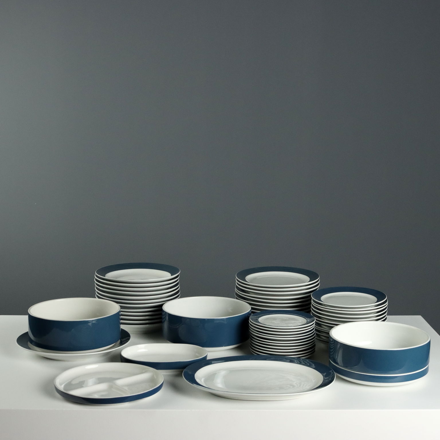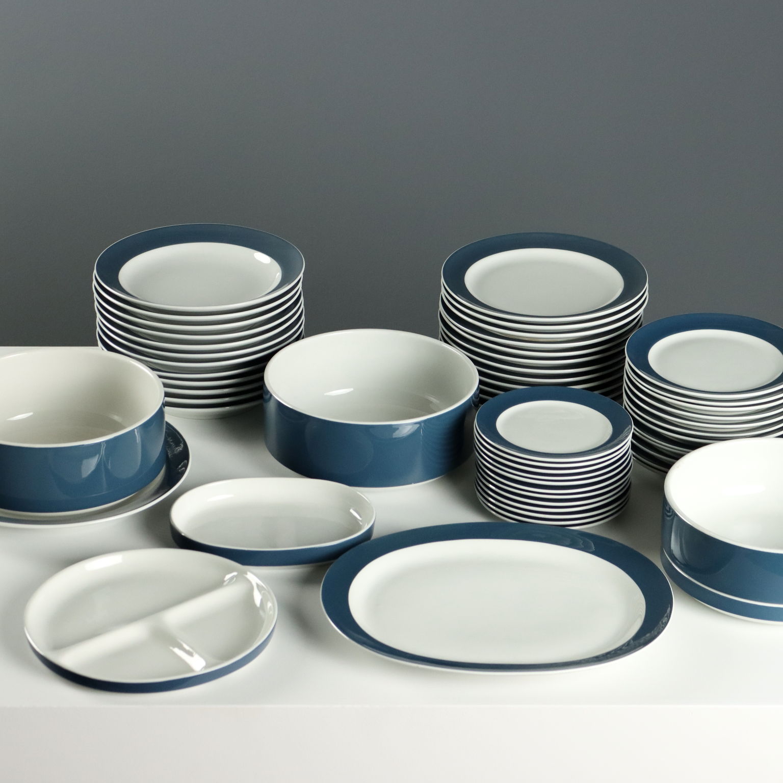 Servizio di piatti serie "Colonna" Giovanni Gariboldi per Richard Ginori. Il servizio in fine porcellana bianca e blu è composto da: 12 piatti piani, 12 piatti fondi, 12 piatti da dessert, 12 piattini da frutta, 3 ciotole e 5 piatti da portata.