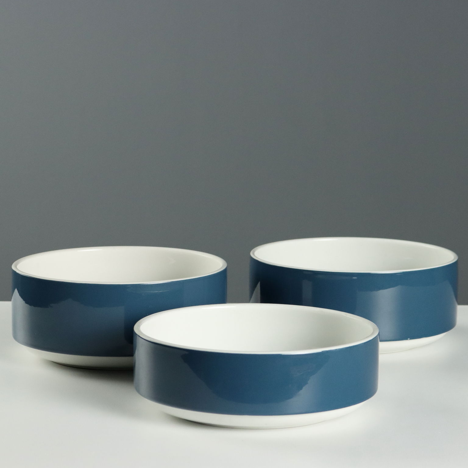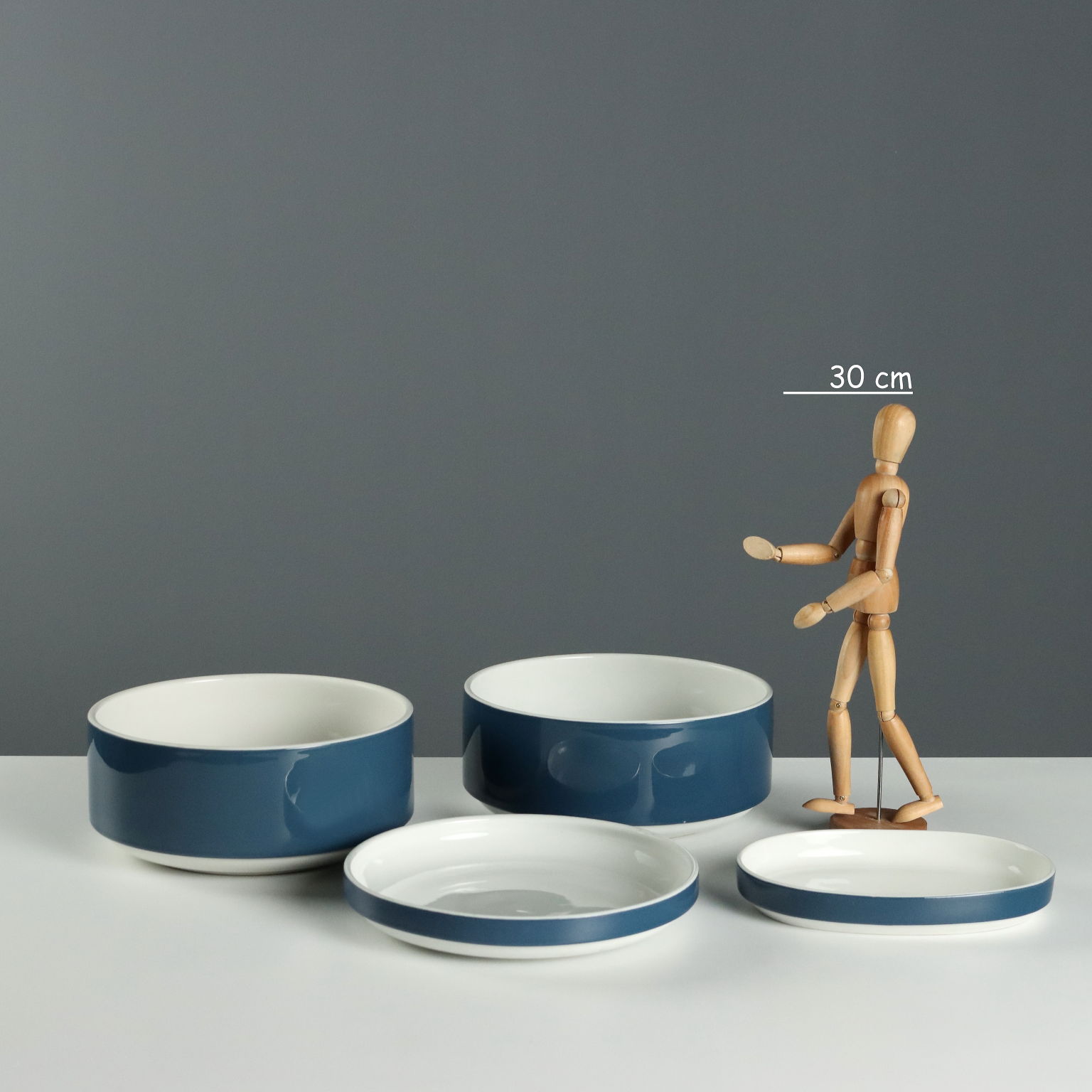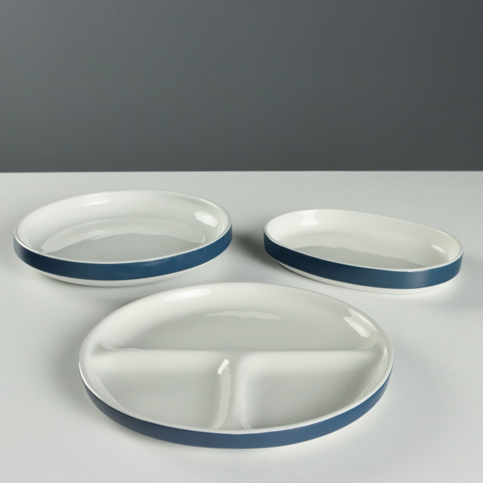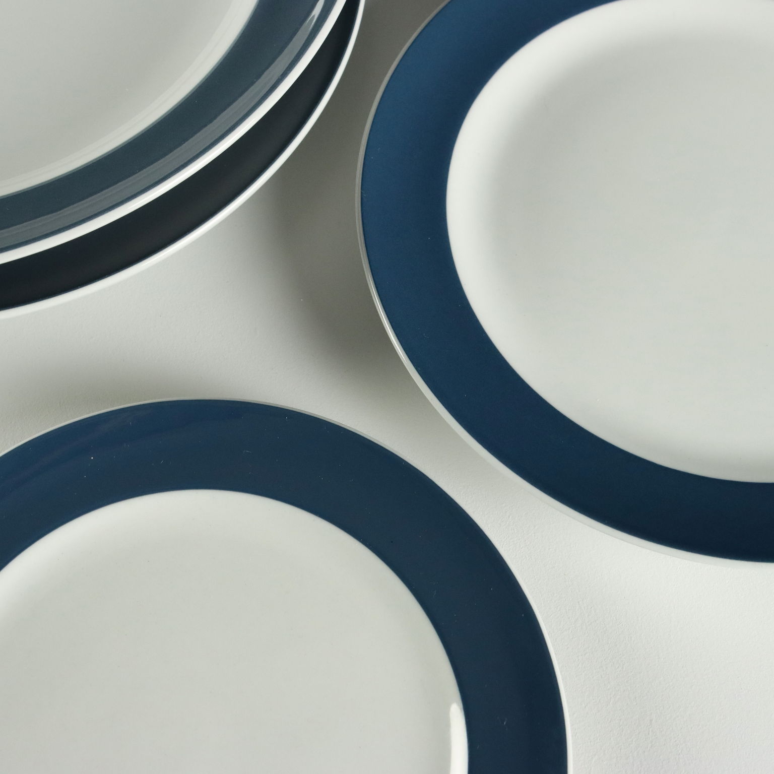 Servizio di piatti serie "Colonna" Giovanni Gariboldi per Richard Ginori. Il servizio in fine porcellana bianca e blu è composto da: 12 piatti piani, 12 piatti fondi, 12 piatti da dessert, 12 piattini da frutta, 3 ciotole e 5 piatti da portata.