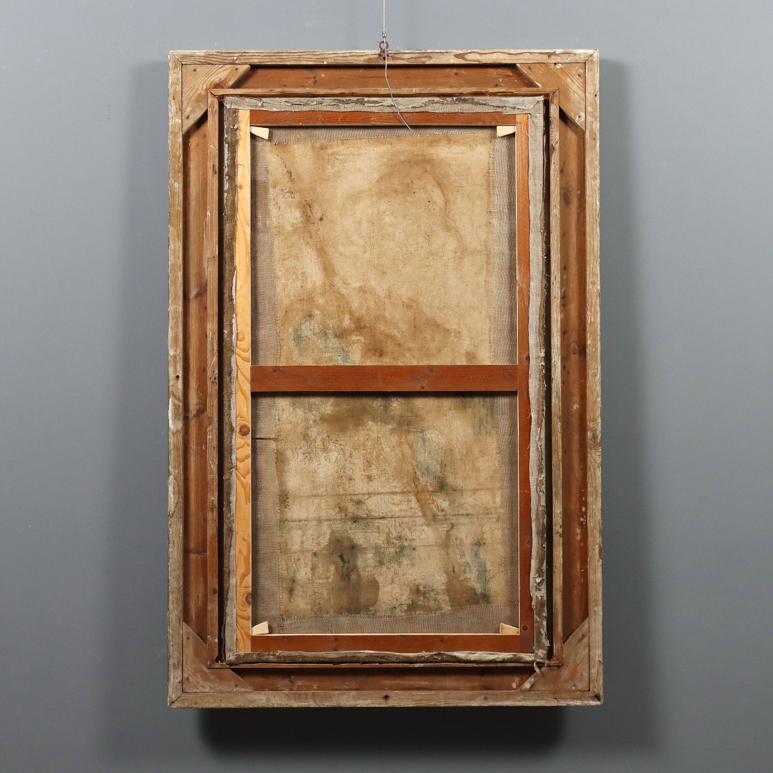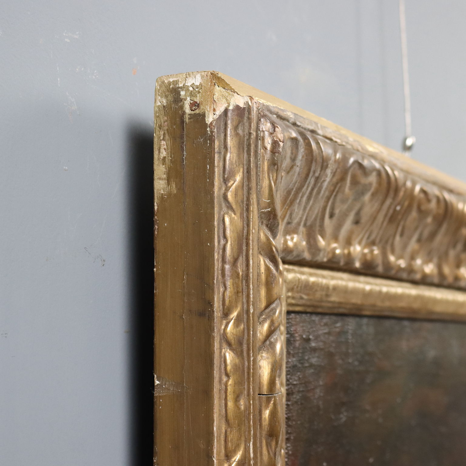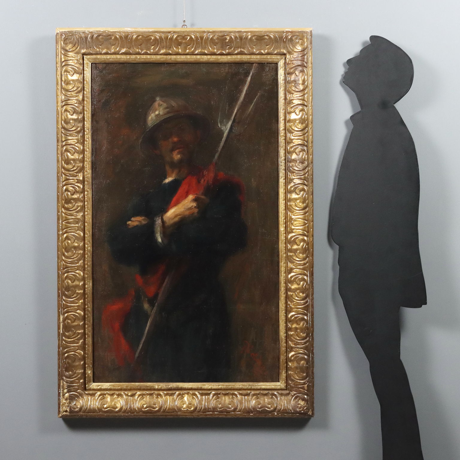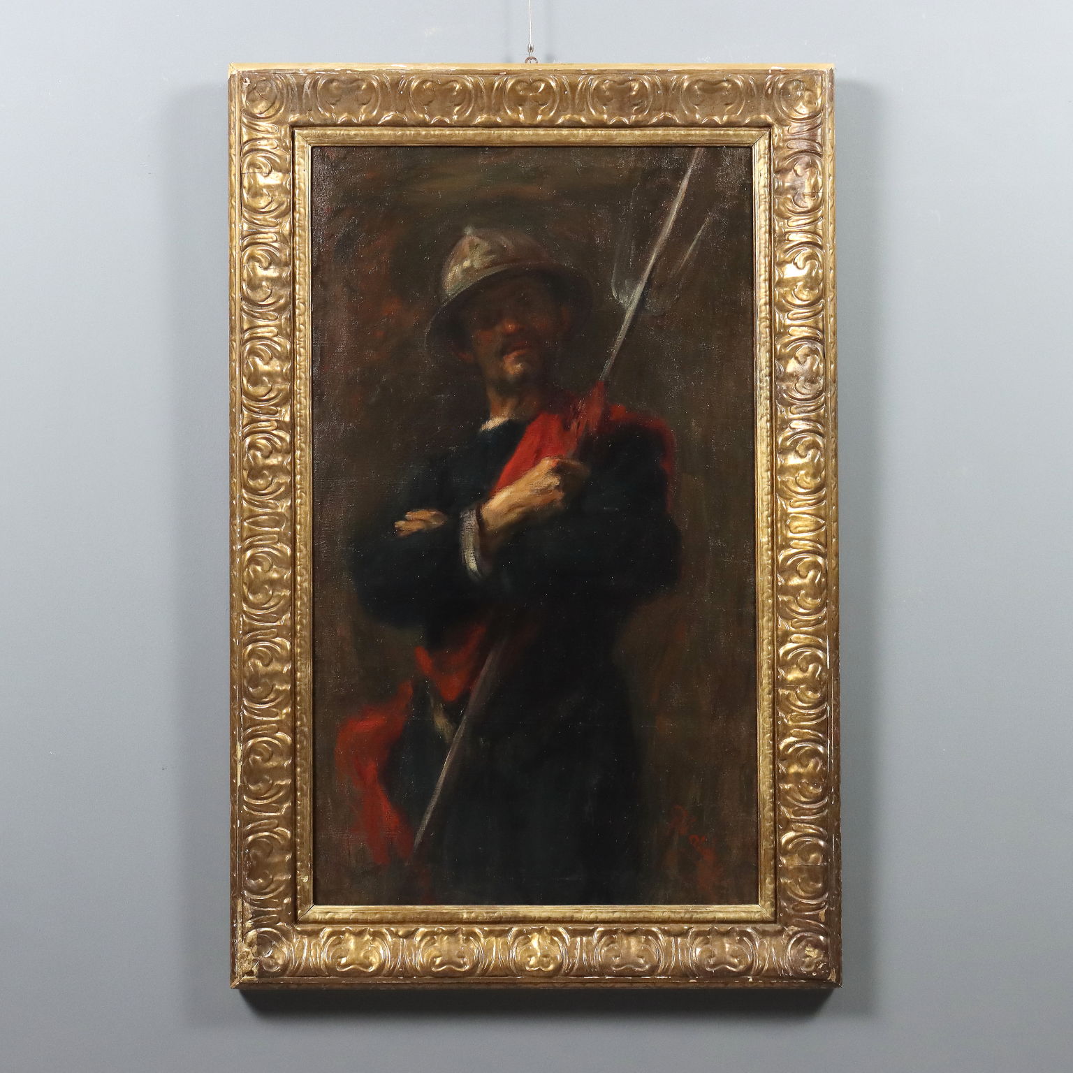 Olio su tela. Firmato in basso a destra. Antonio Valdoni, pittore triestino ma attivo a Milano, si affermò soprattutto come paesaggista. Propone invece in quest' opera una figura di armigero che impugna un tridente: il Valdoni che militò tra le fila garibaldine partecipando alle guerre di Indipendenza, esprime qui tutta la fierezza del soldato, seppur appartenente ad epoca precedente la sua. Il dipinto è stato in passato montato su un telaio nuovo, con rinforzi alla tela. È presentato in cornice costruita con elementi di cornici di fine '800.