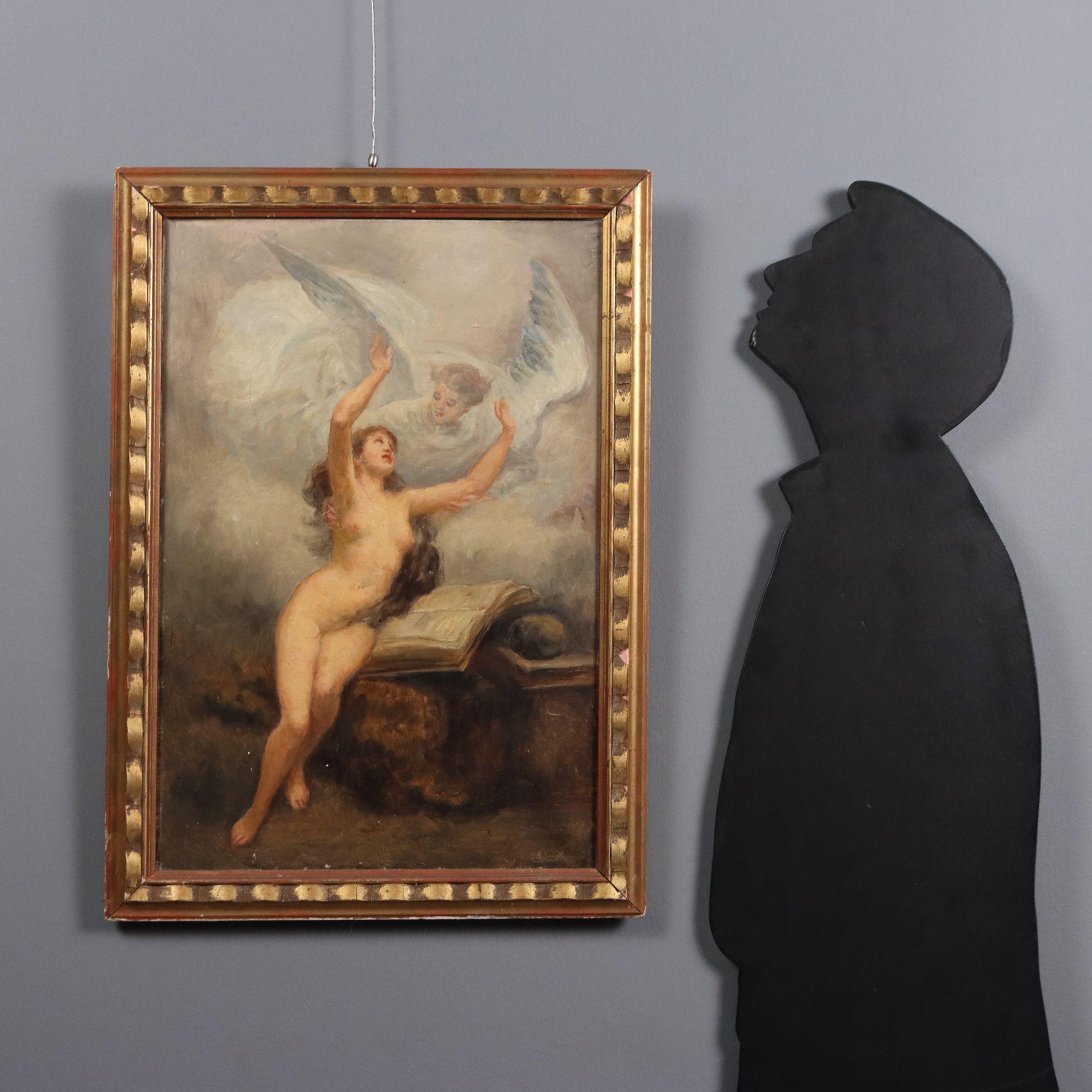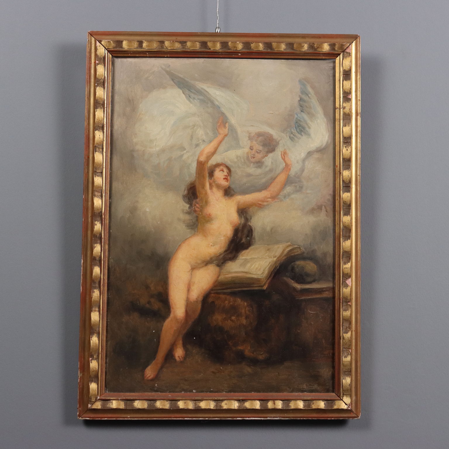 Olio su tela. Firmato in basso a destra. La Maddalena, raffigurata nuda e con i lunghi capelli disciolti, è ritratta in atteggiamento contemplativo: seduta nel deserto su una pietra, mentre legge la Bibbia con accanto il teschio (come da iconografia tradizionale) , riceve la visita di un angelo che la sorregge nel suo slancio estatico, nel suo protendersi verso il cielo. che sfuma nella nuvola. Il dipinto è presentato in cornice coeva.