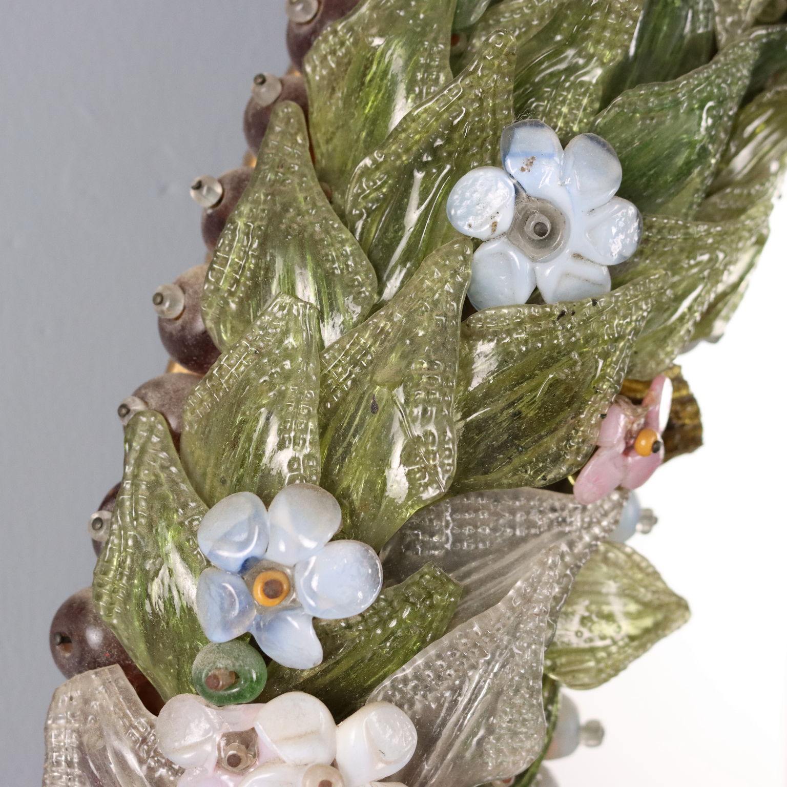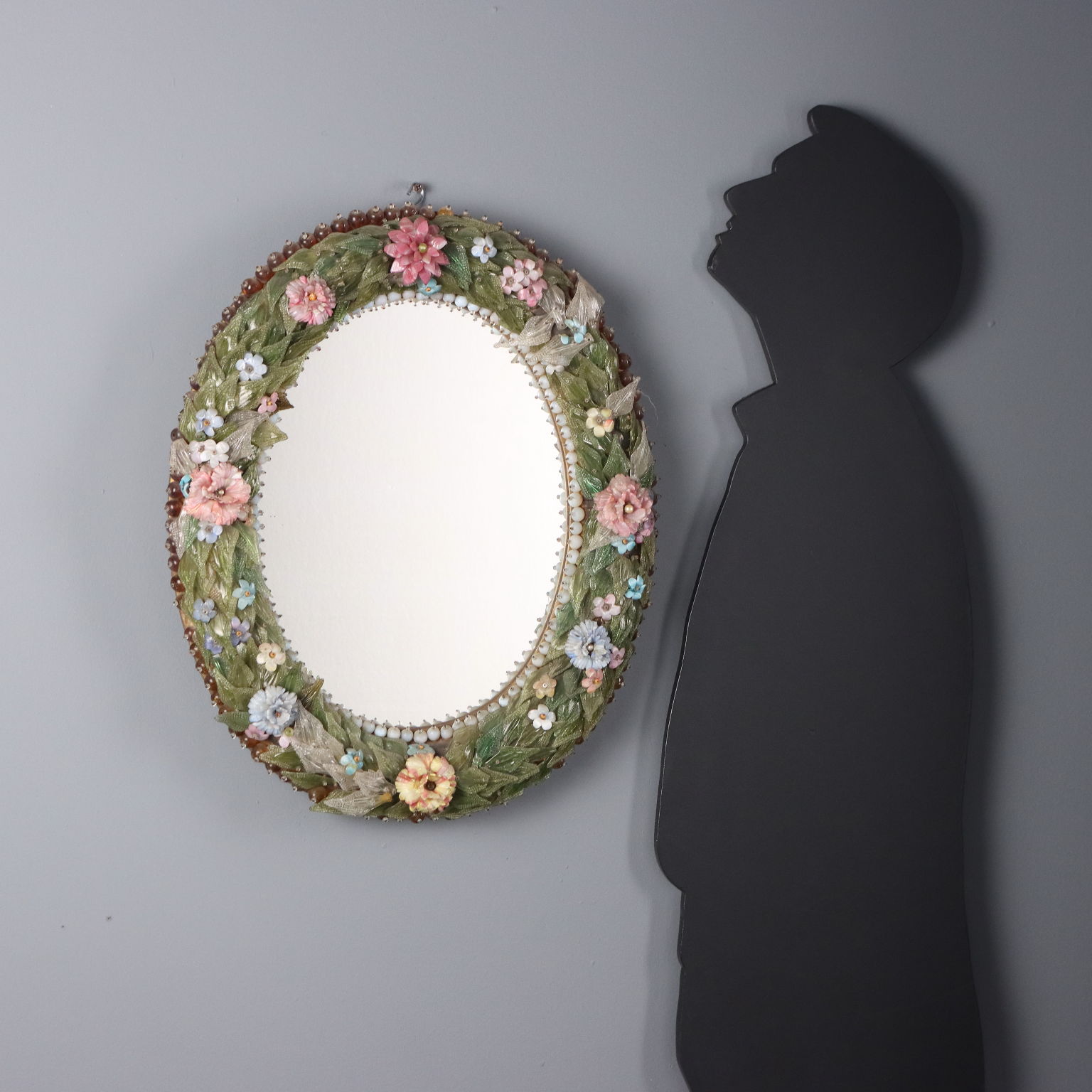 Specchiera Veneziana in vetri colorati. Cornice composta da foglie e fiori in vetro lavorato, circondata esternamente da perline colorate e internamente da perline bianche, il tutto chiodato su base in legno. Presenta mancanze. Murano, XIX Secolo.