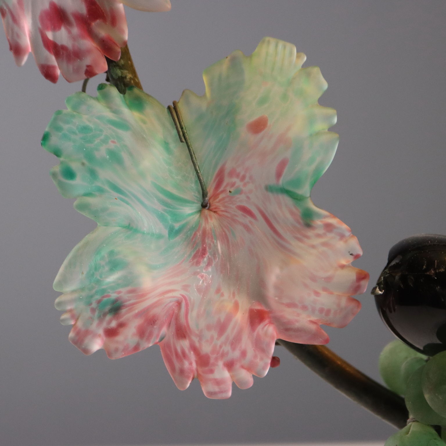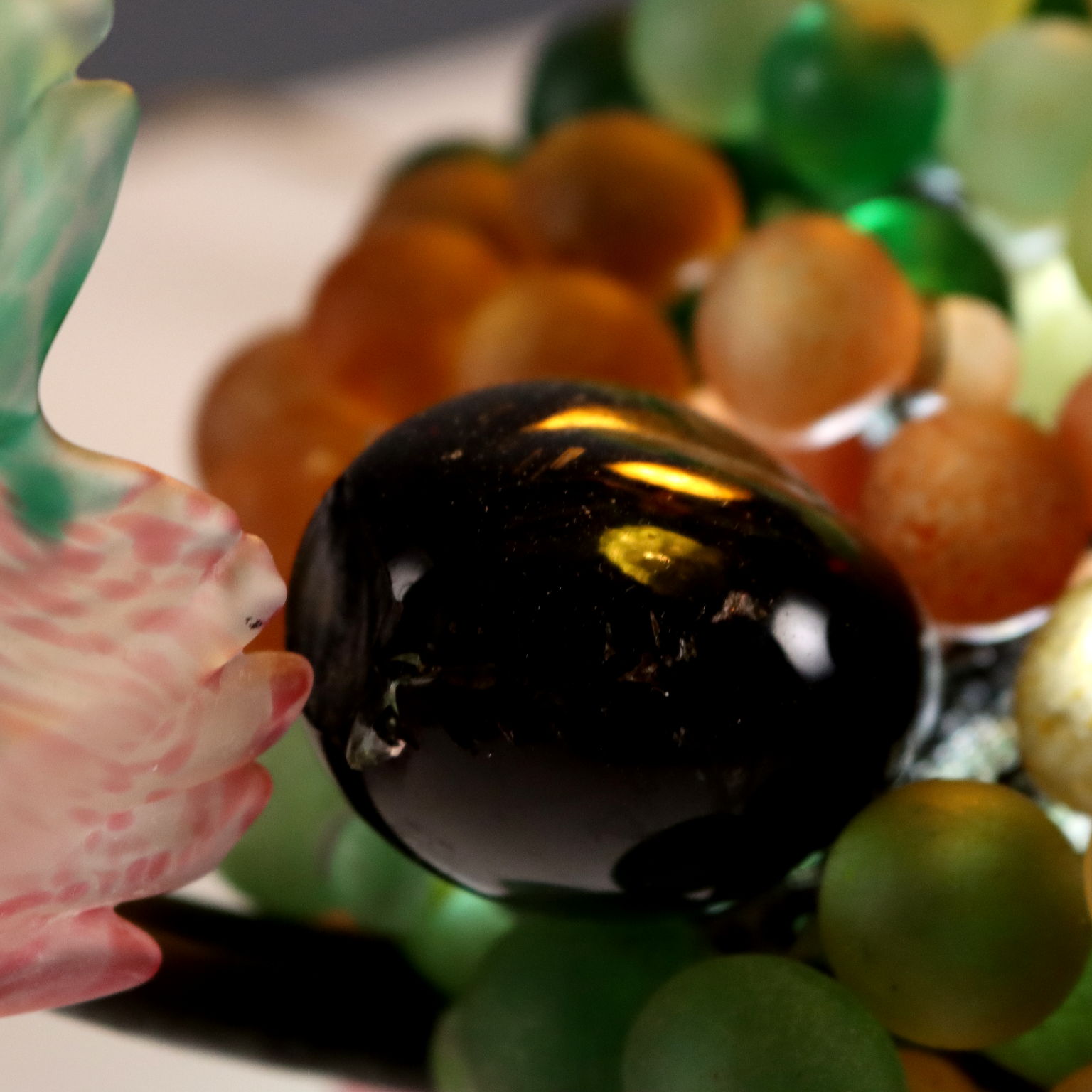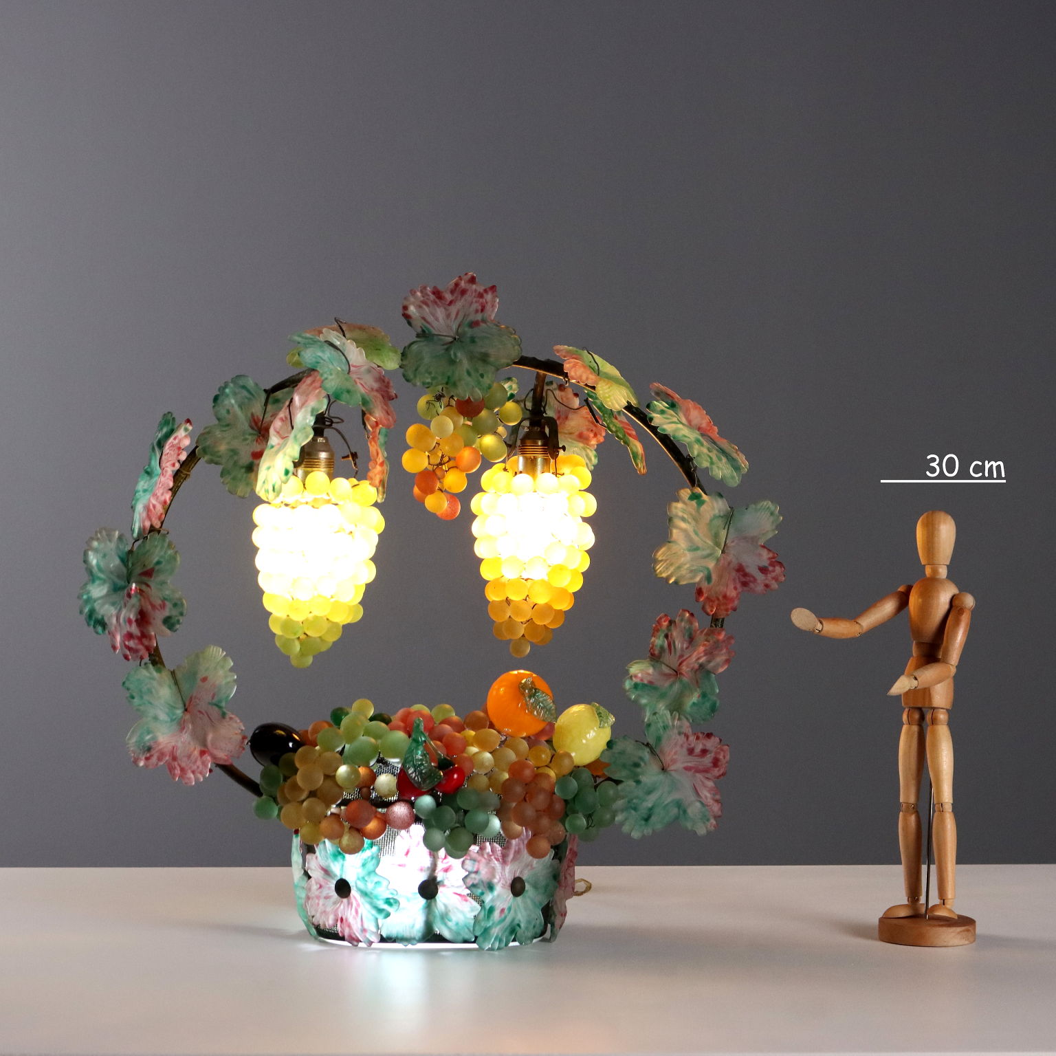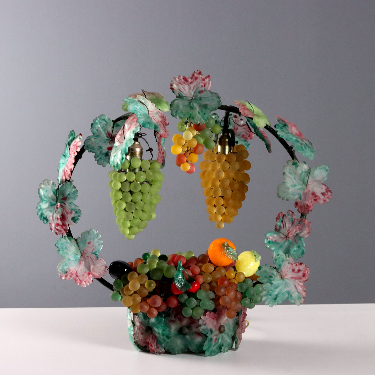 Lampada da tavolo rappresentante cesto di frutti. Struttura in metallo riccamente adornata da foglie e frutti in vetro colorato. 3 lampade attacco E14