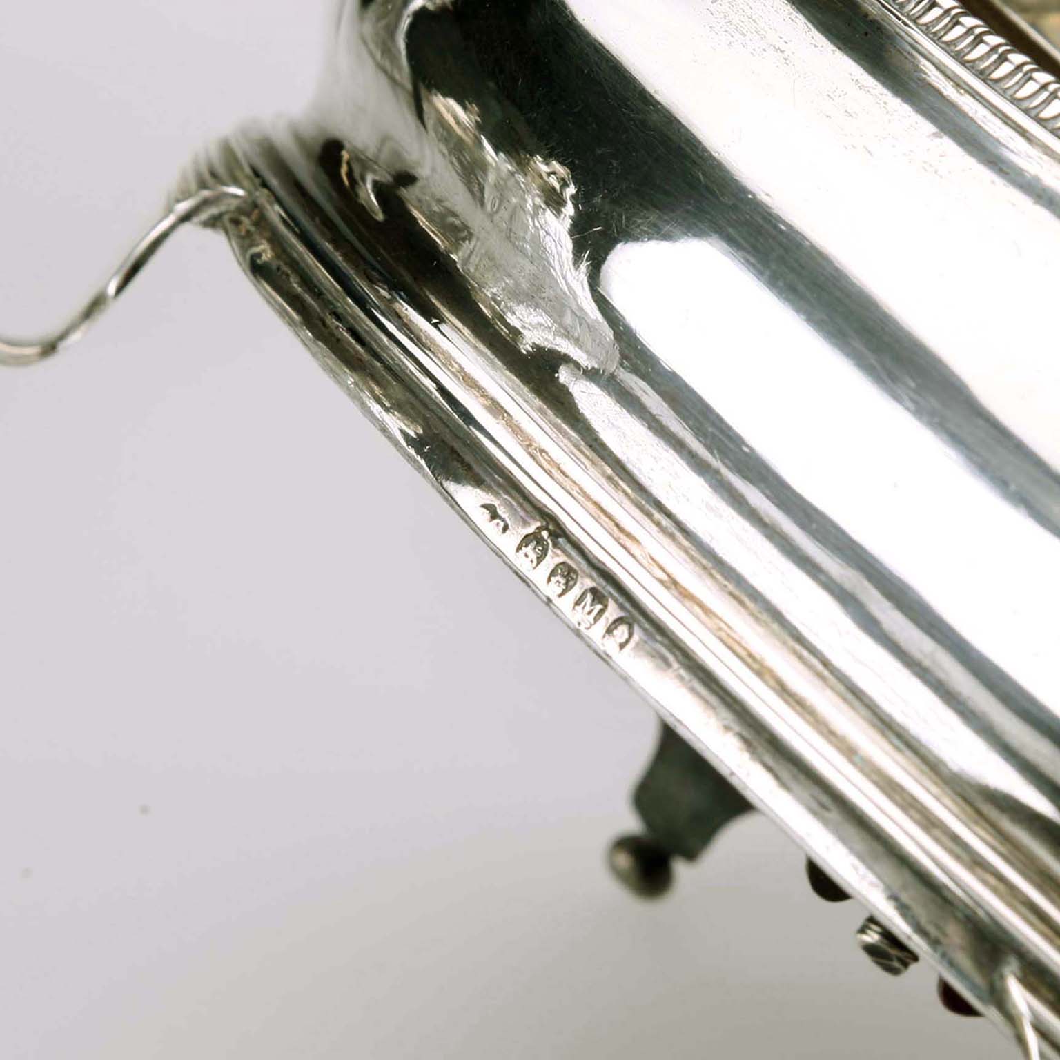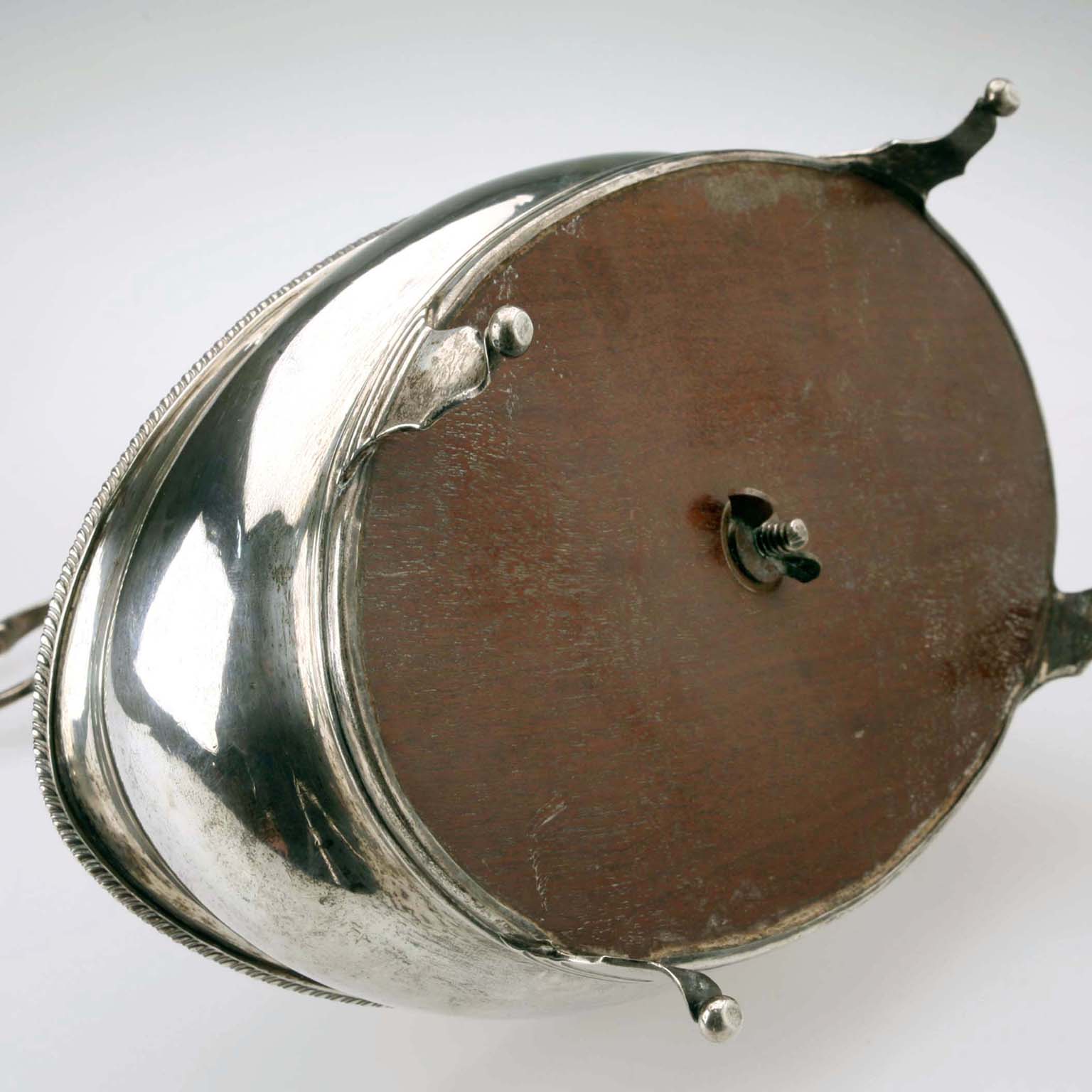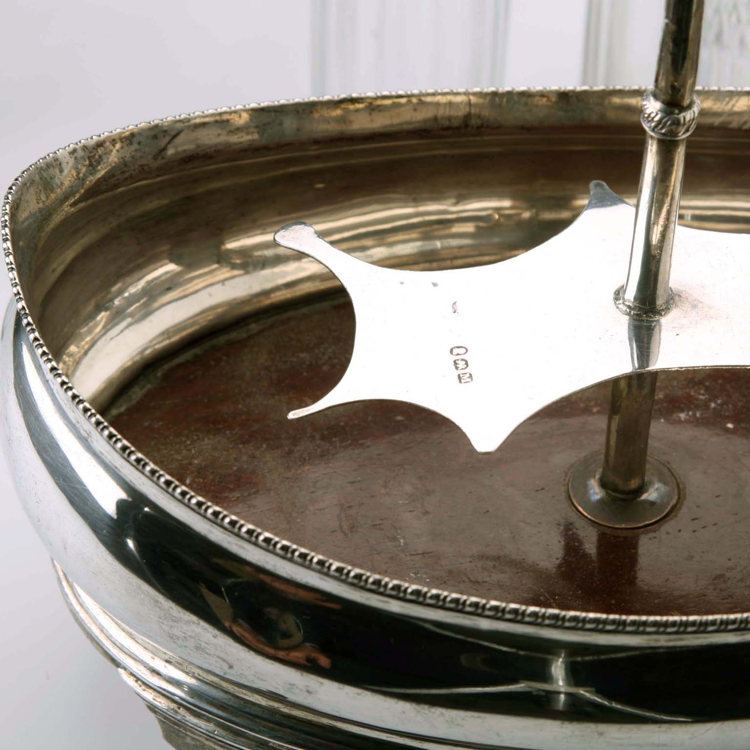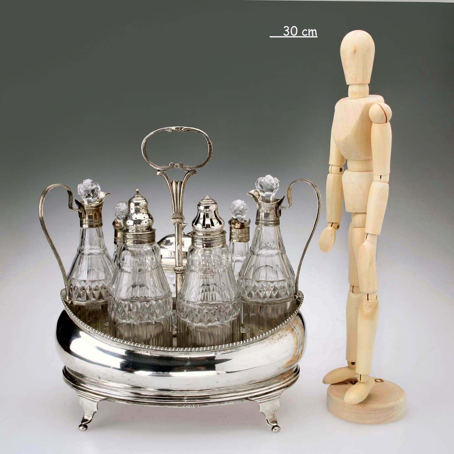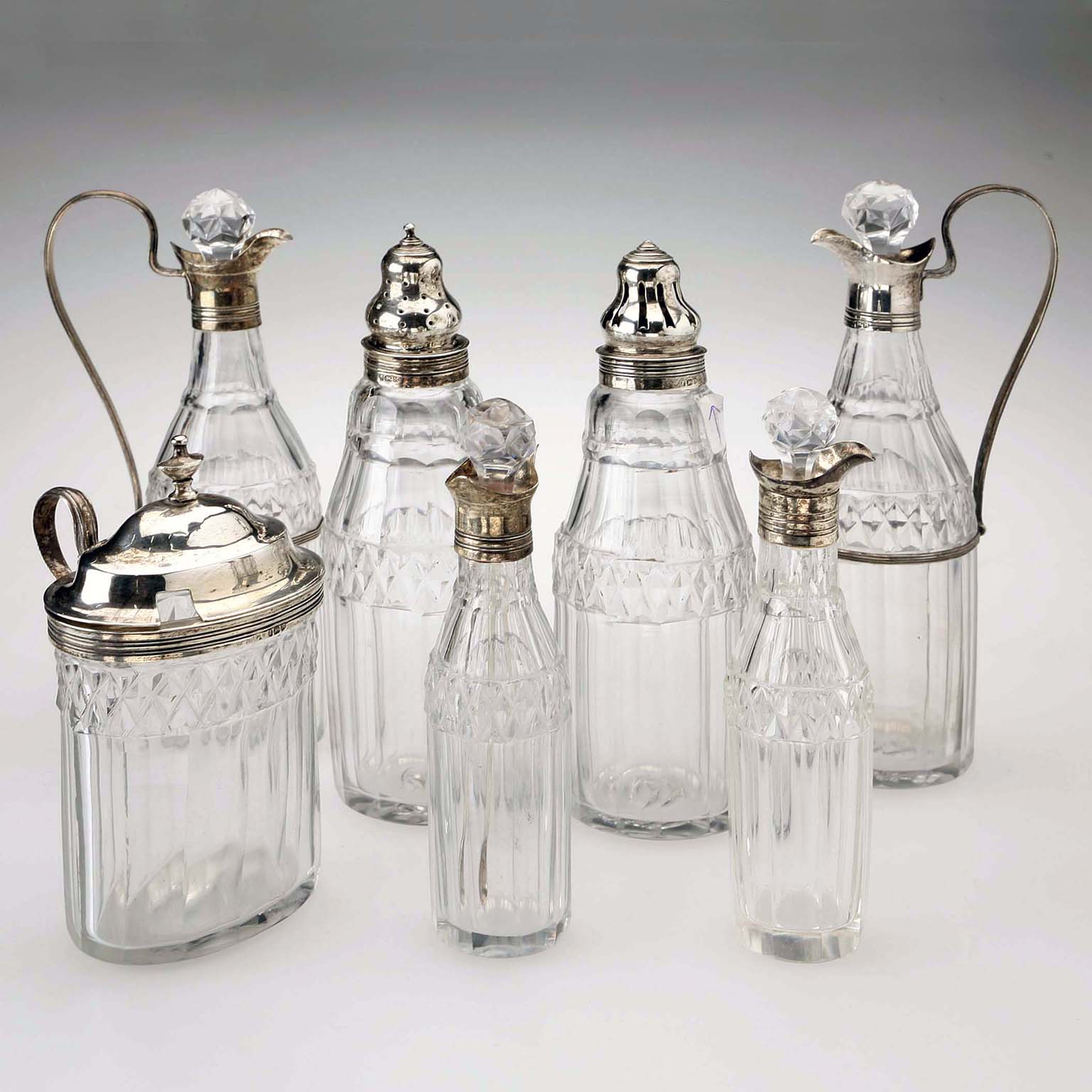 Set da tavola in argento cesellato e vetro molato. Marchi dell'argento incussi sul bordo della base, al centro del portabottiglie e sulle ghiere delle singole parti.