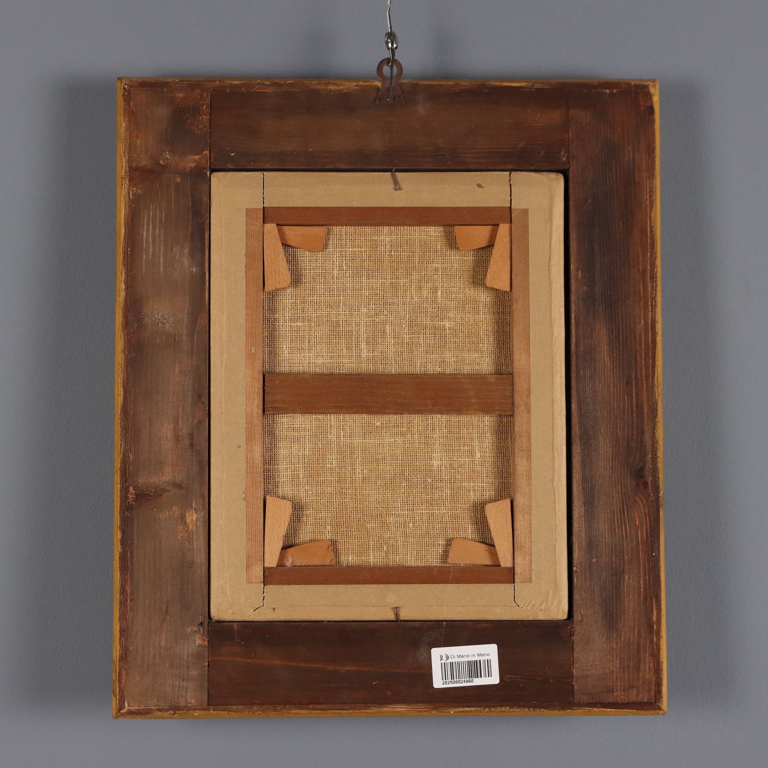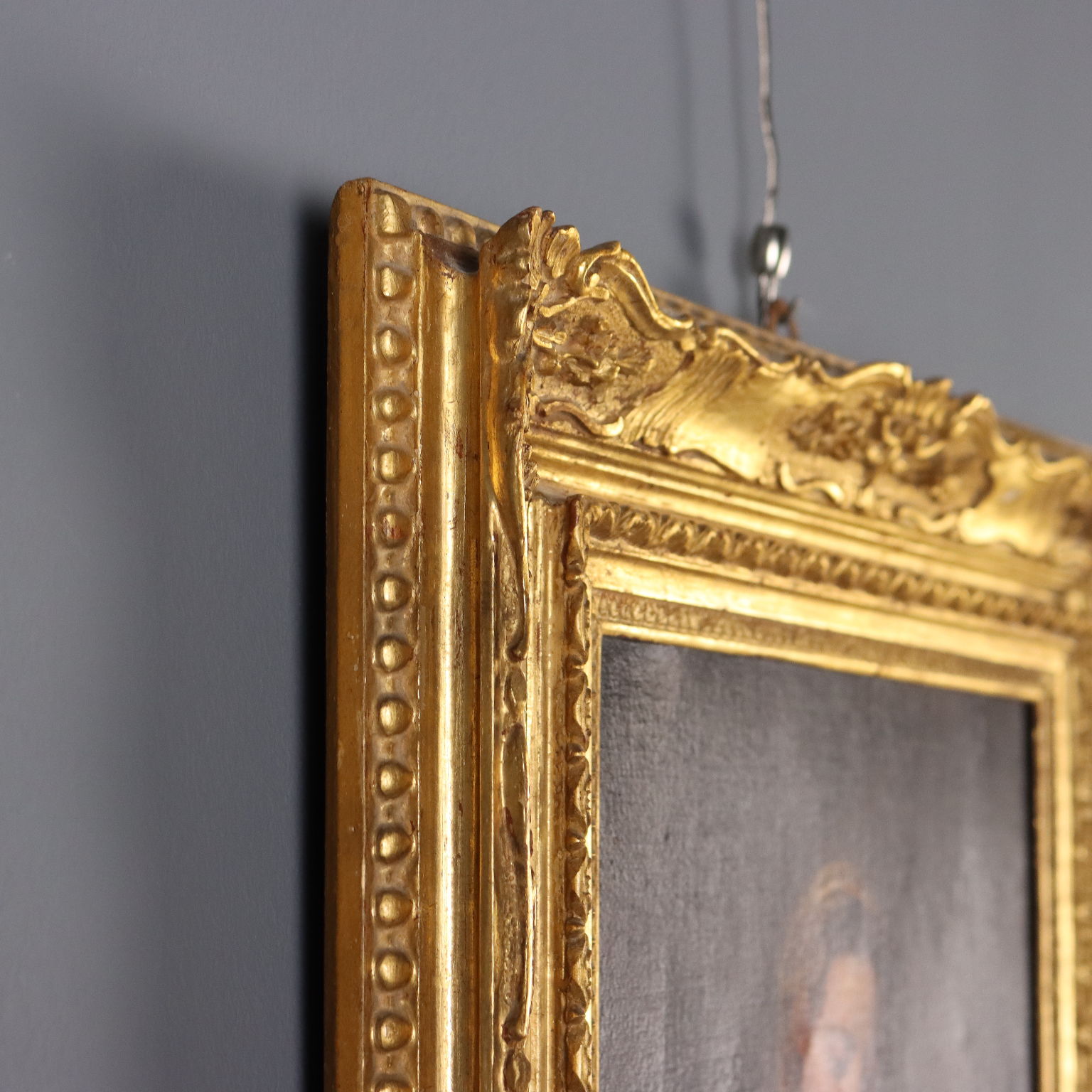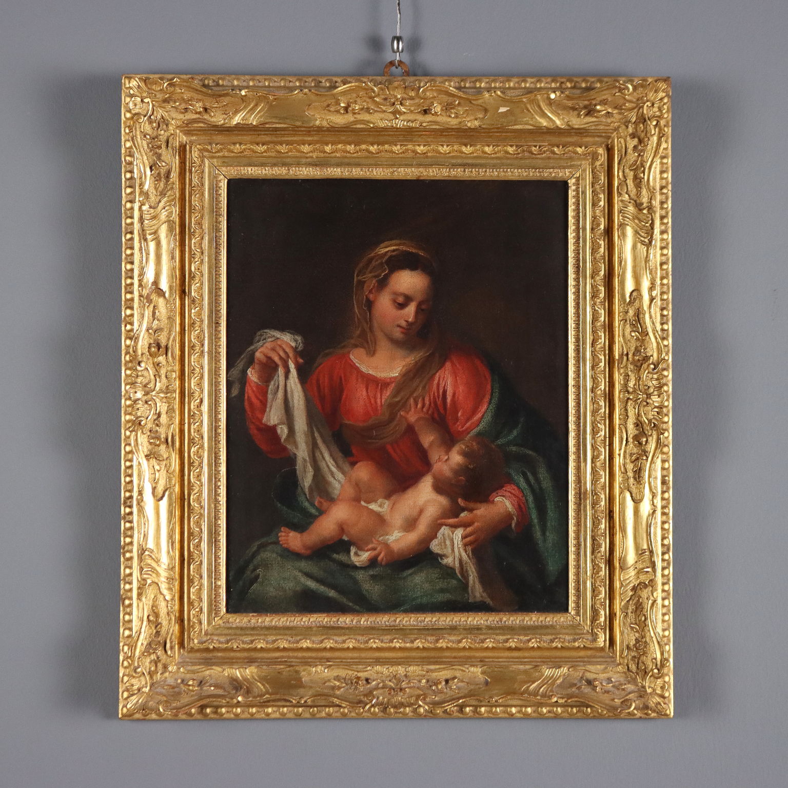 Olio su tela. Di raffinata qualità esecutiva questa Madonna con Bambino, che sottolinea la dimensione umana del piccolo Gesù, bimbo disteso sulle ginocchia della madre e che guarda a lei protendendo la manina, mentre la donna si accinge a coprirlo teneramente con il suo velo. L'opera, già ritelata, è presentata in cornice dorata di metà '900.