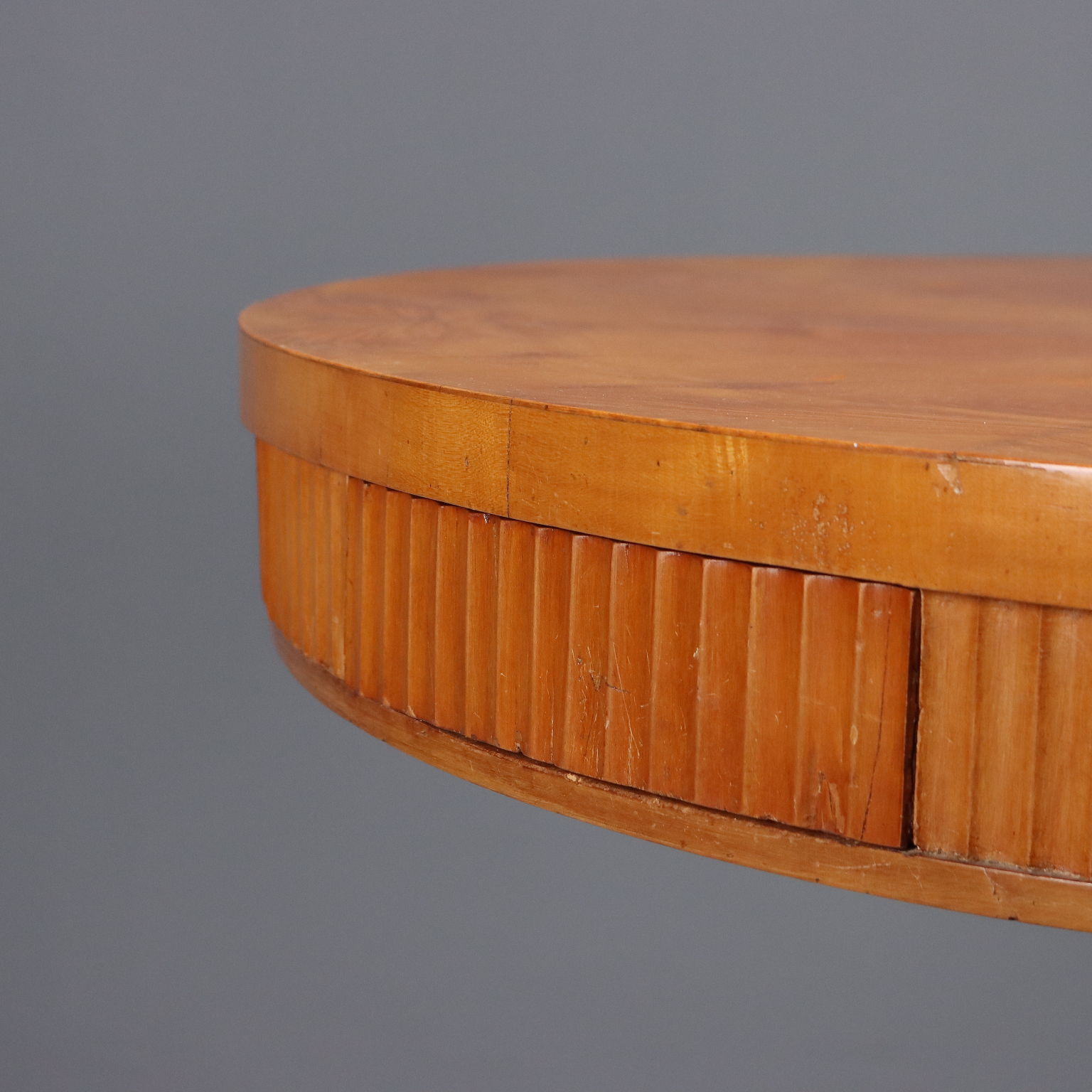 Tavolo Biedermeier a sezione circolare in ciliegio. Coppia di cassettini contrapposti alternati a vani a giorno nella fascia sotto piano. Gamba centrale tornita con sgorbiature, poggiante su piano tondo e tre piedi mossi culminanti a ricciolo. Impero Austroungarico, secondo quarto XIX Secolo.