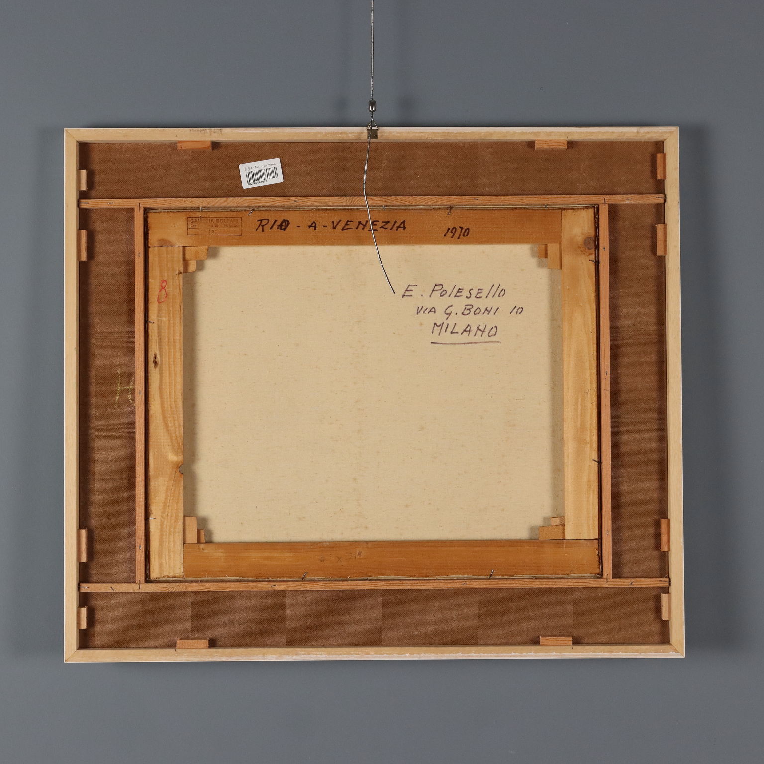 Olio su tela. Firmato in basso a destra. Al retro presente titolo, timbro della Galleria Bolzani di Milano e indirizzo dello studio dell'artista. Il pittore veneto Eugenio Polesello si dedicò soprattutto al paesaggio, che seppe realizzare in toni limpidi e scelte cromatiche semplici, memori sempre dell'originaria formazione veneta. Opera in cornice.