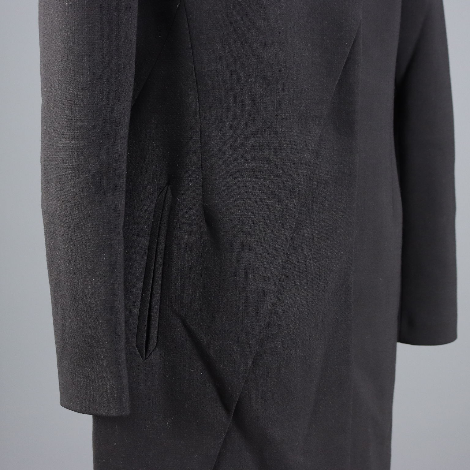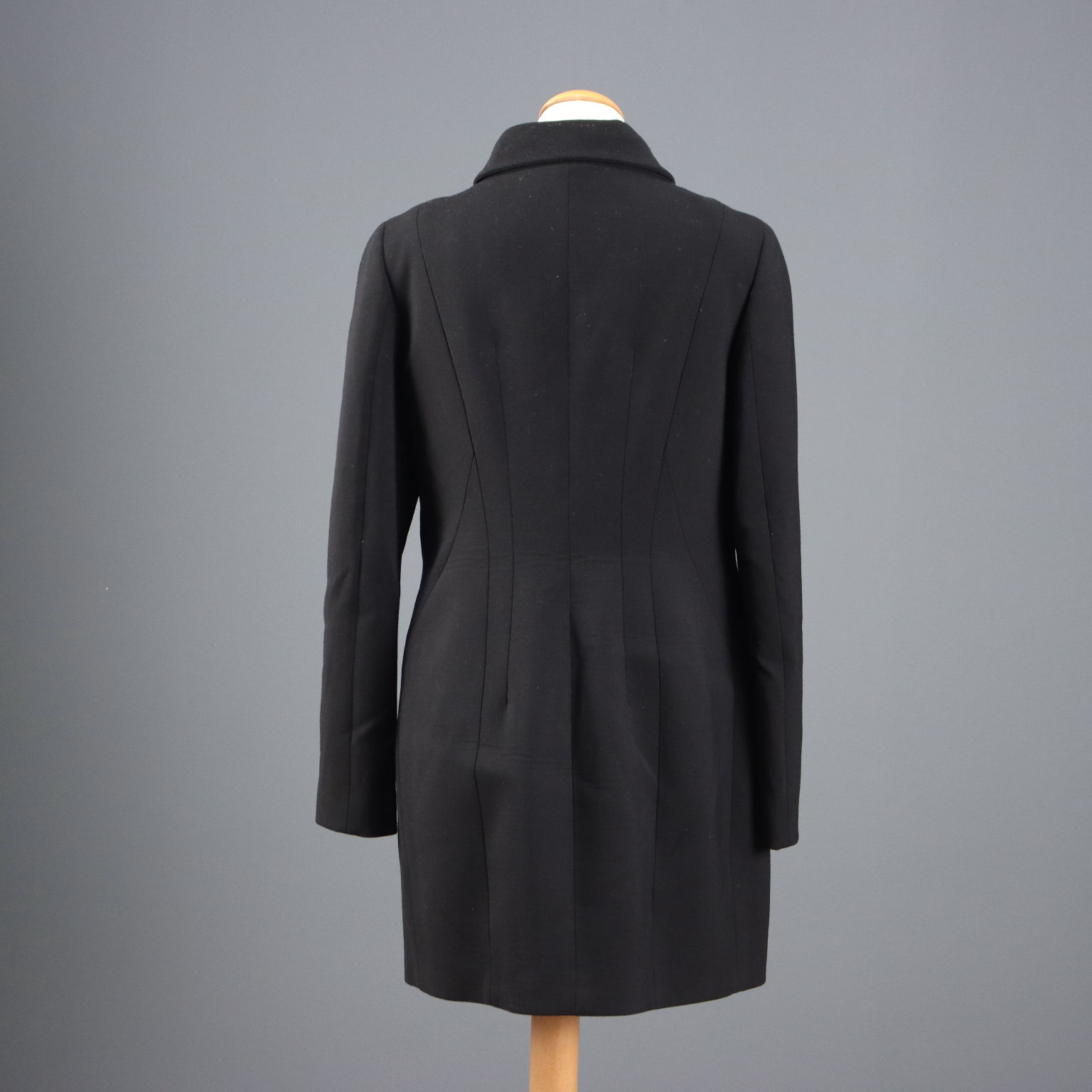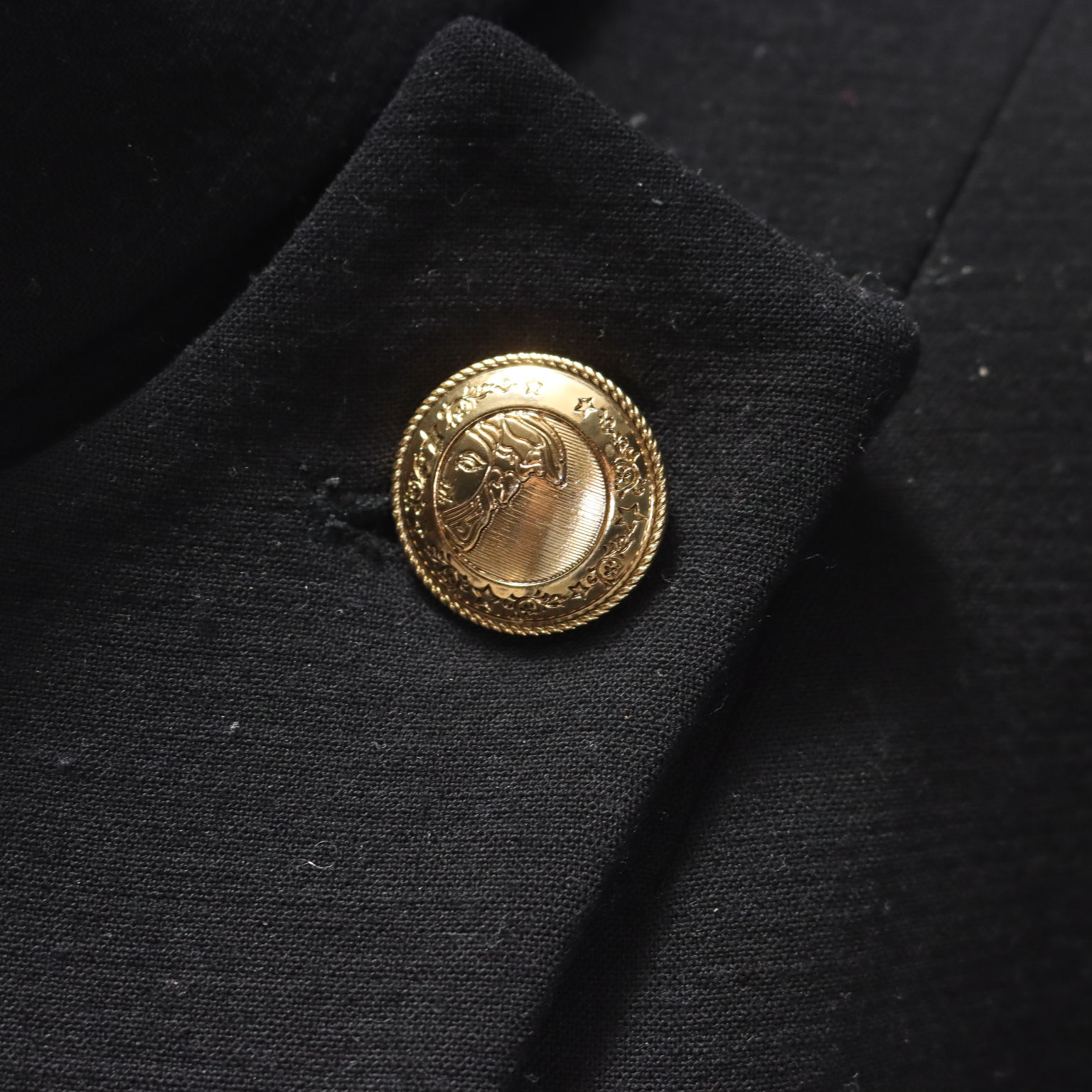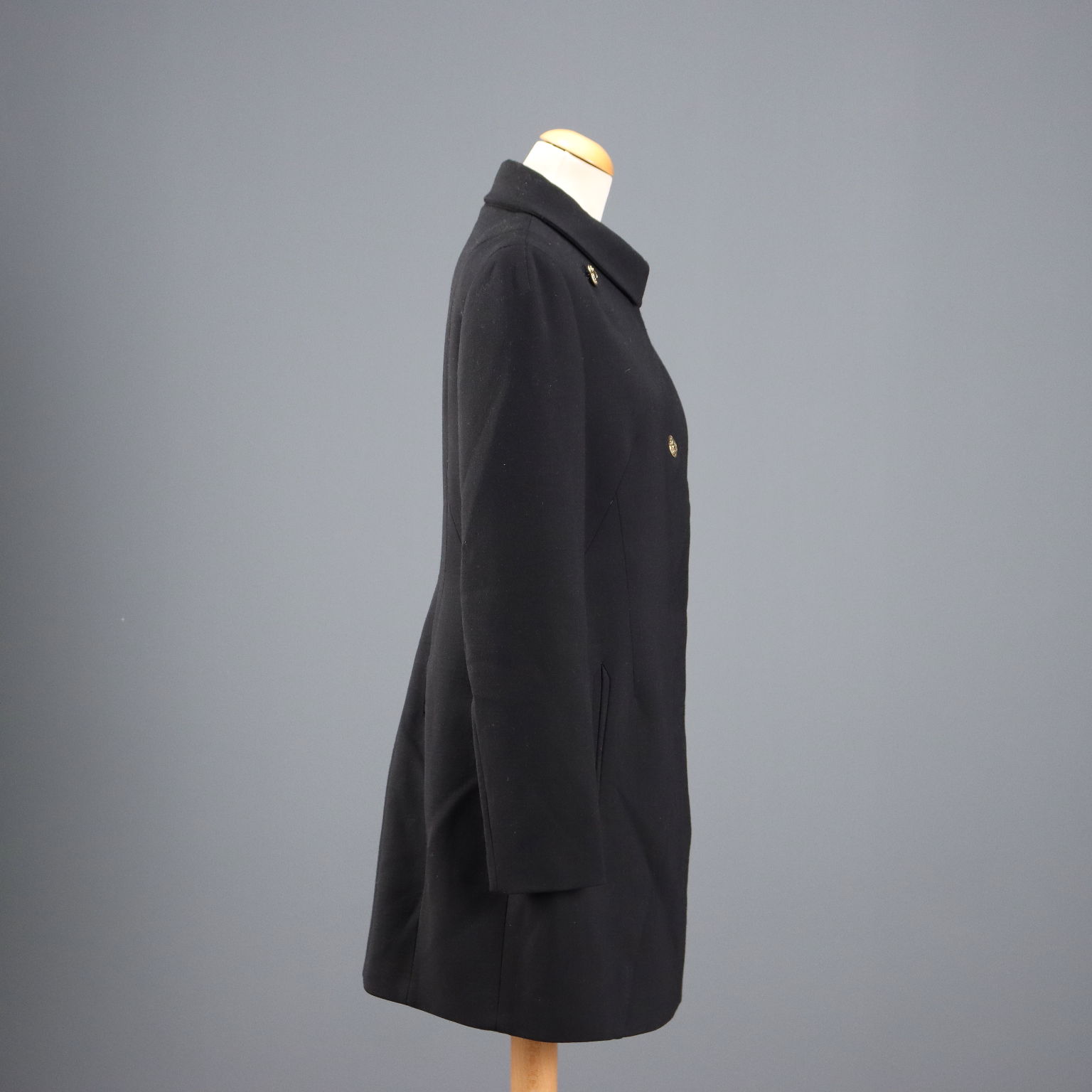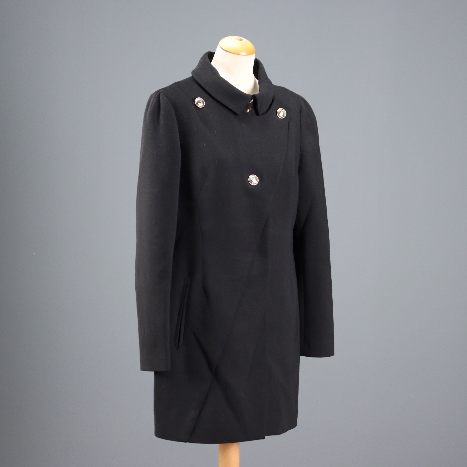 Cappotto foderato con due tasche e particolare abbottonatura con bottoni dorati, che raffigurano Medusa, simbolo della Maison, e bottoni automatici a scomparsa. Lunghezza: 86cm. Larghezza spalle: 42 cm. Lunghezza manica: 65 cm. Giromanica: 52 cm.