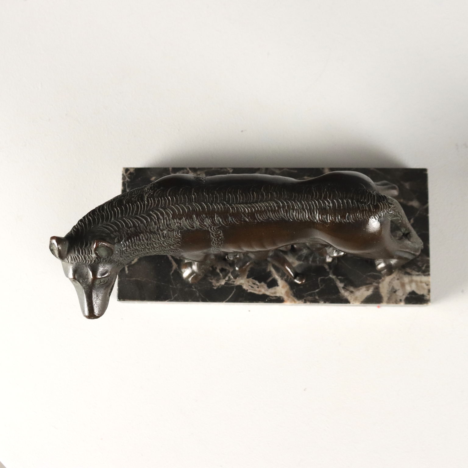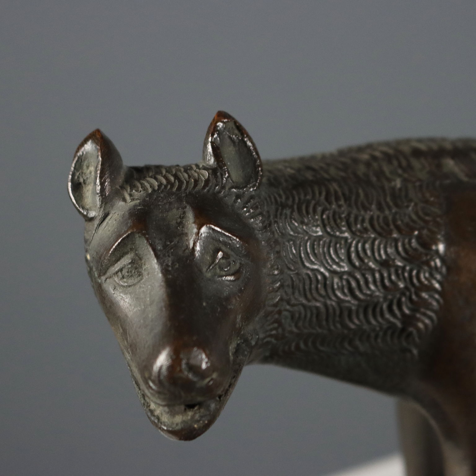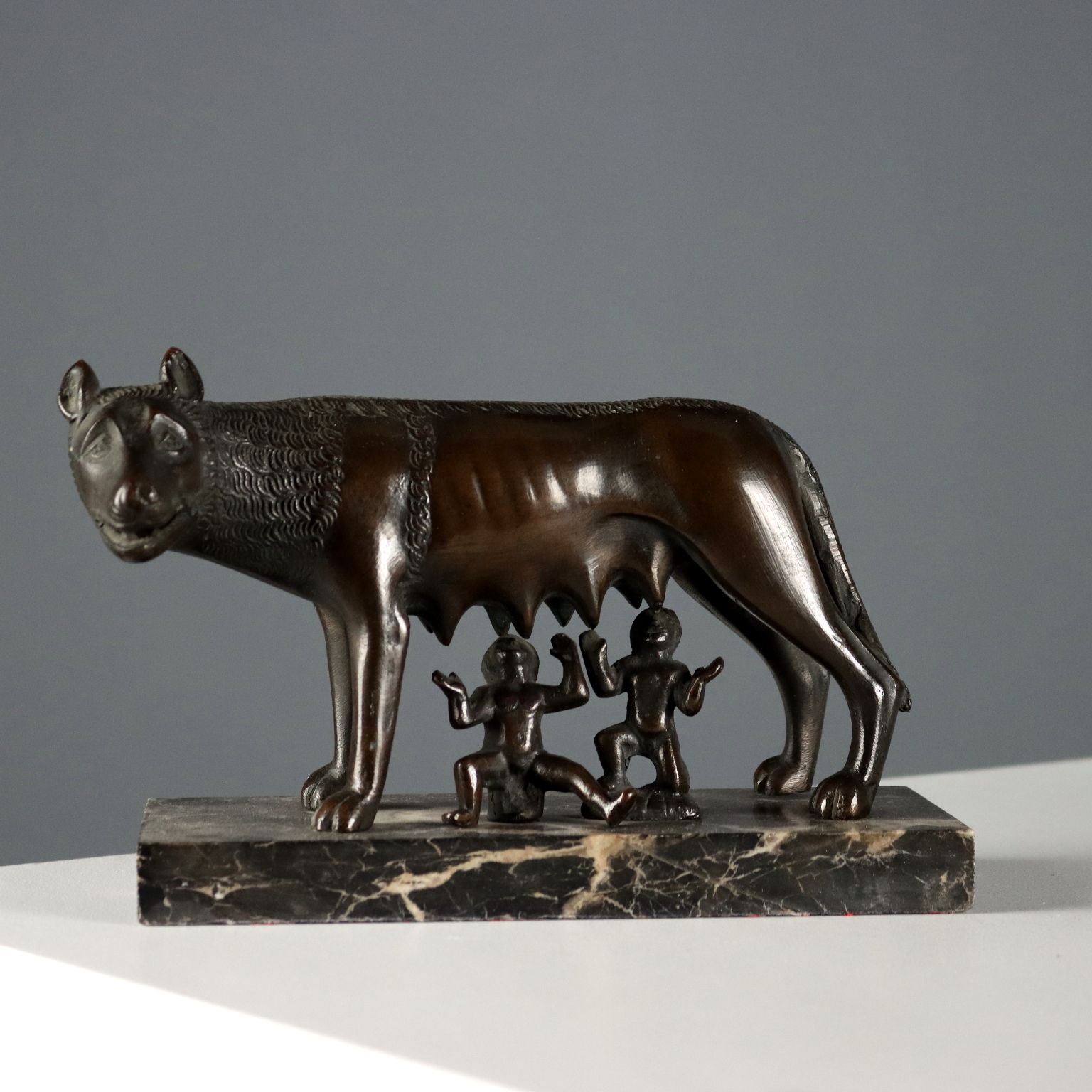Scultura in bronzo su base in marmo nero raffigurante Lupa di Roma con Romolo e Remo.