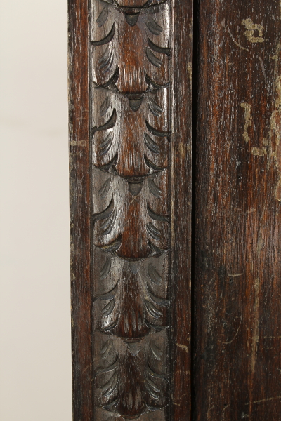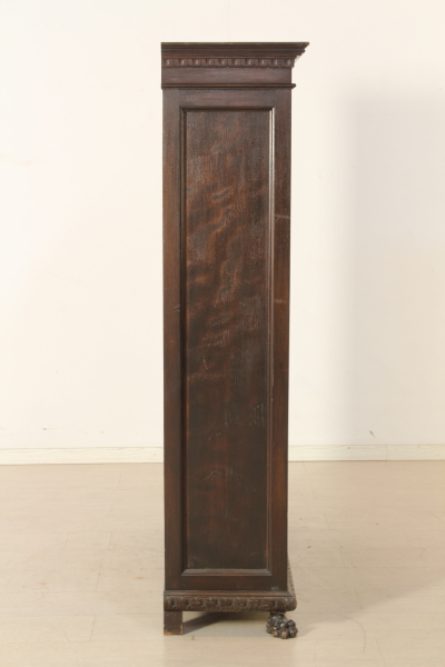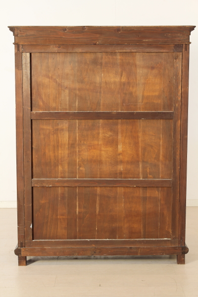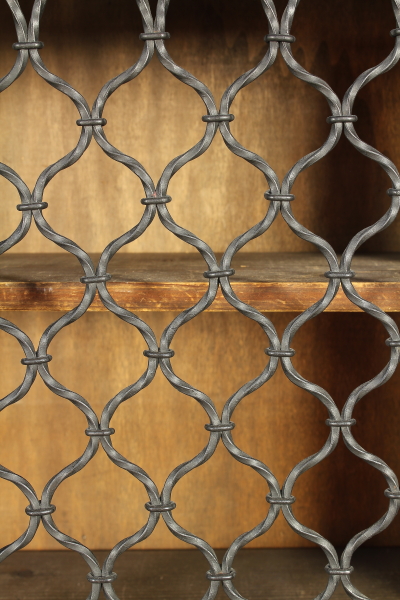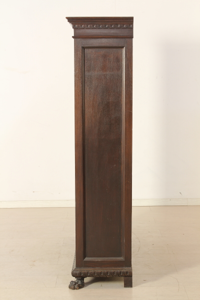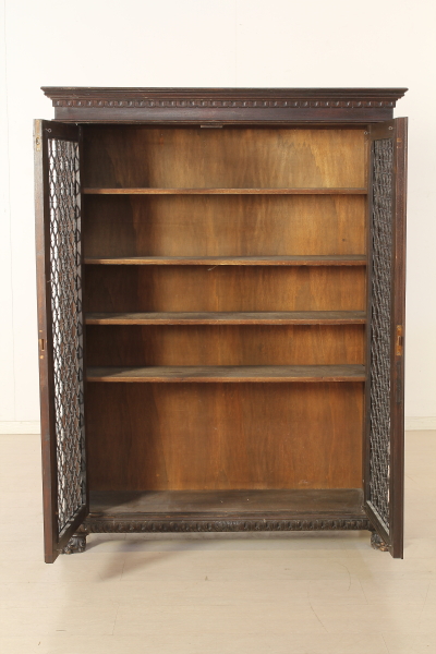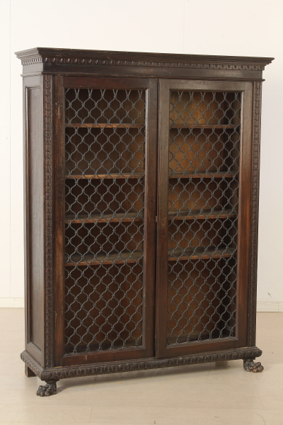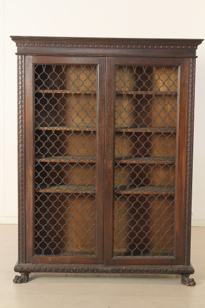 Piccola libreria a due ante impiallacciata noce con grata di ferro, zampe ferine.