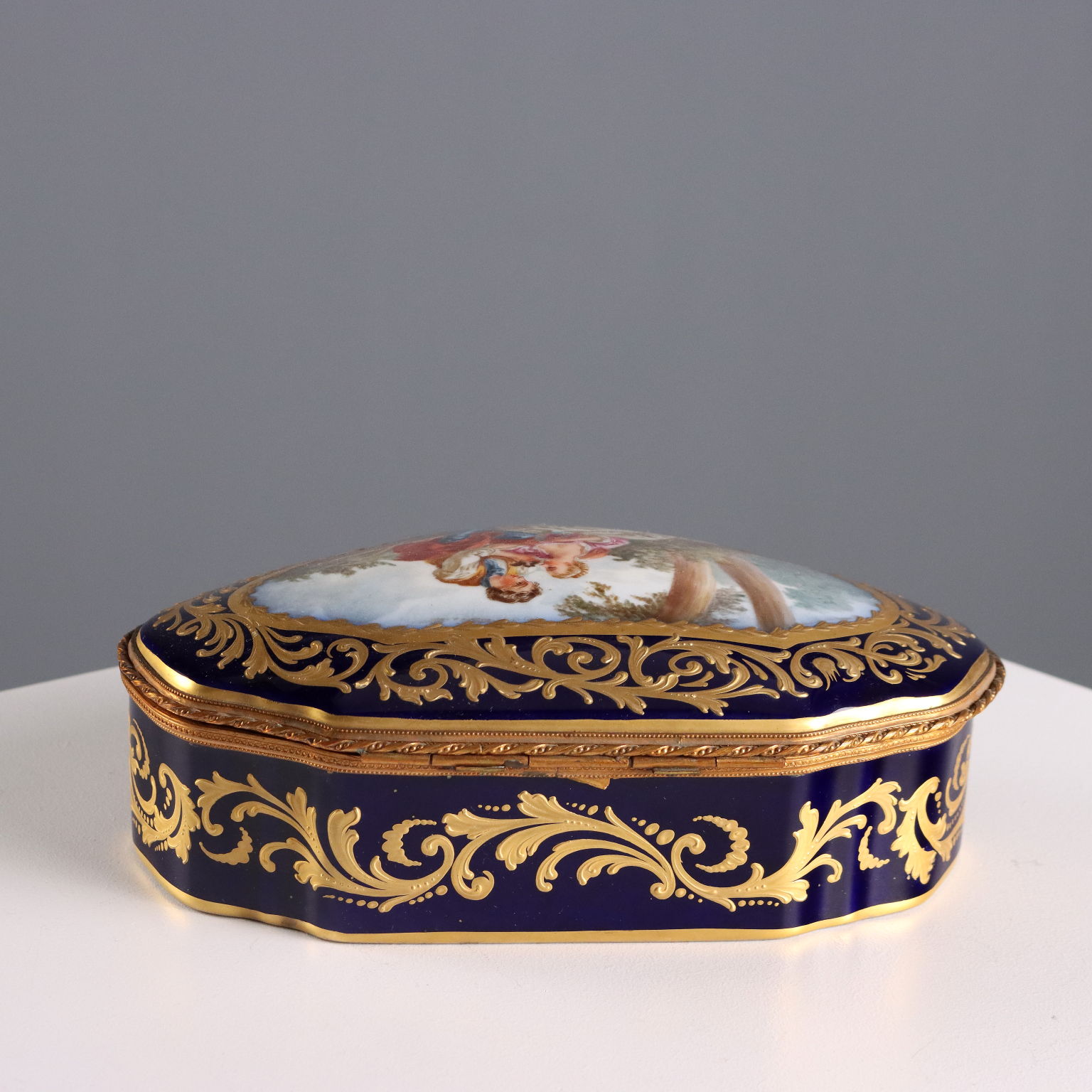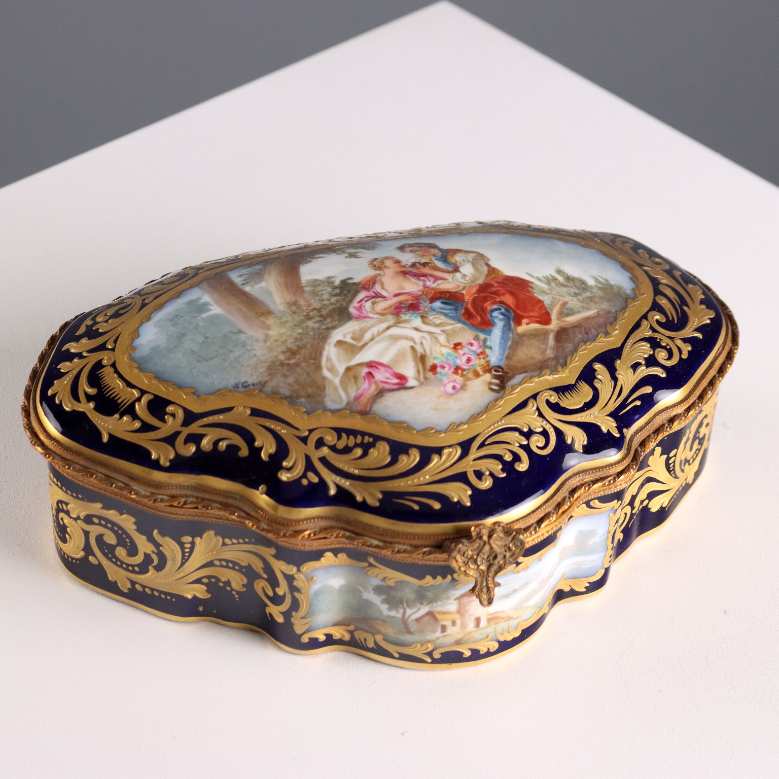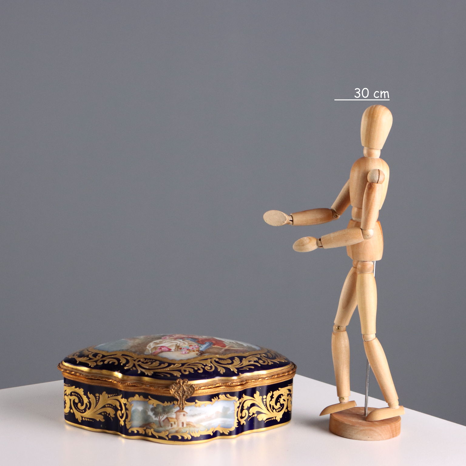 Scatola in porcellana in blu cobalto con ricchi decori in oro a volute fogliacee. Nelle riserve dipinti a paesaggio lacustre e sul coperchio scena galante. All'interno decori policromi a mazzetti di fiori. Sotto la base marchio della manifattura.