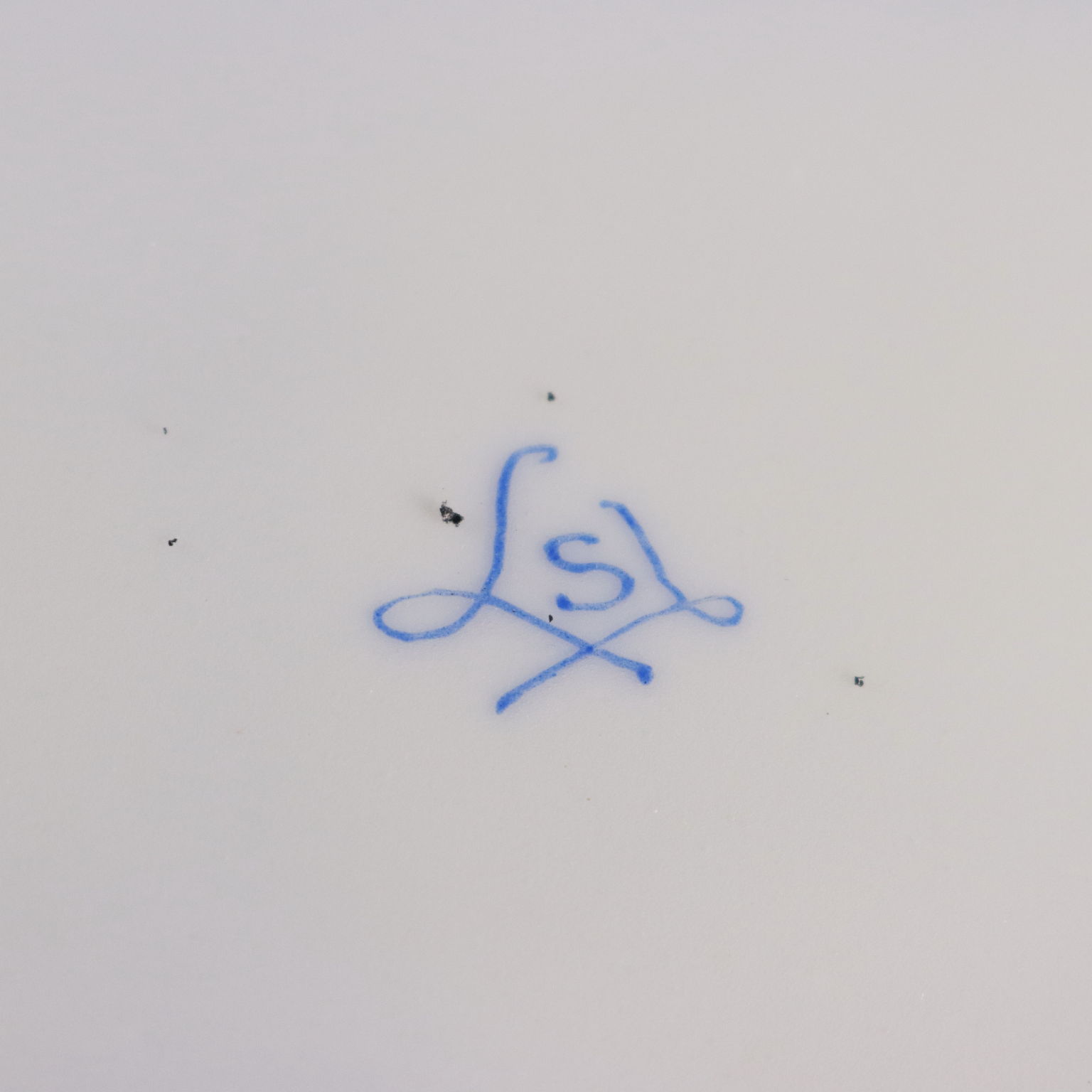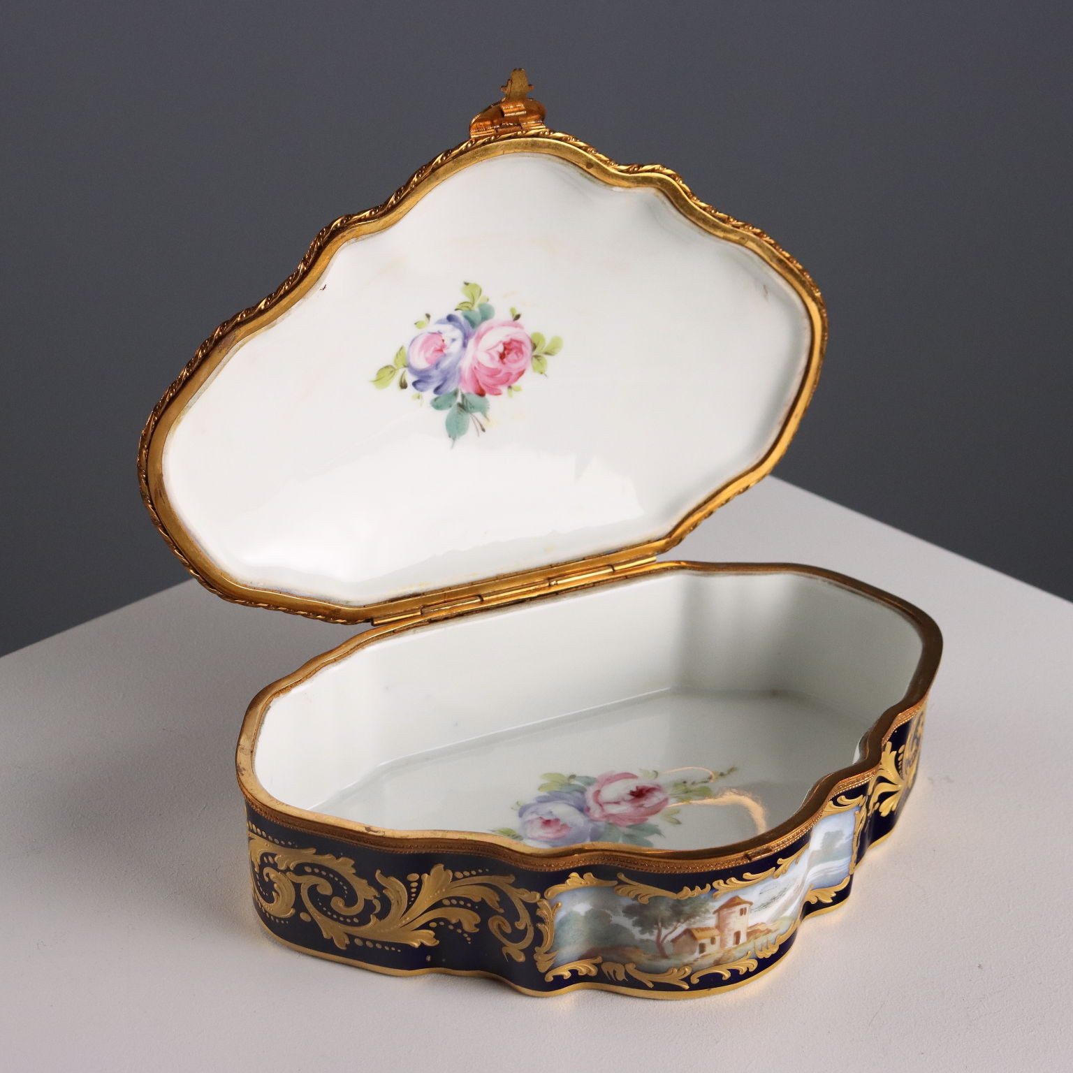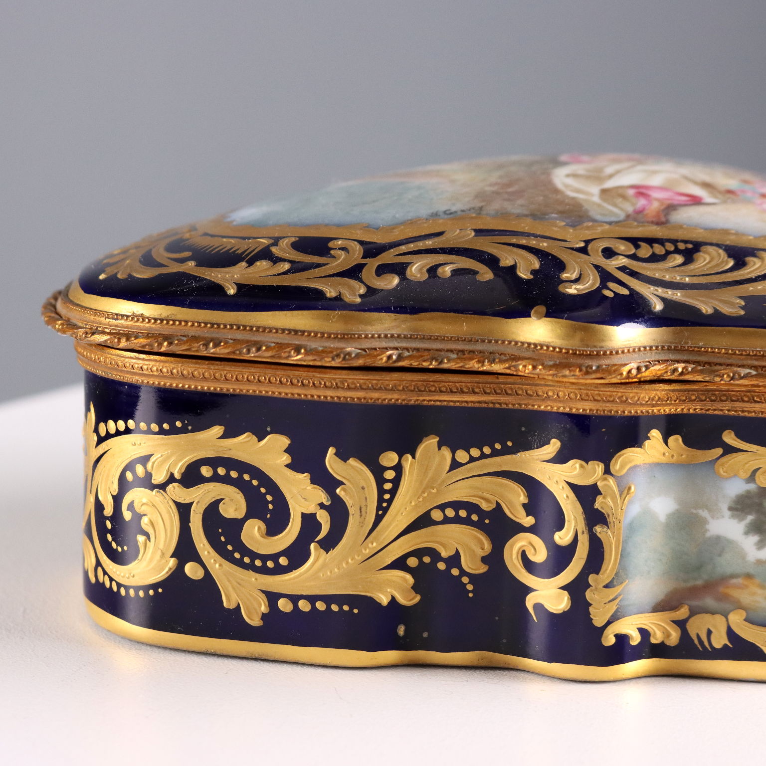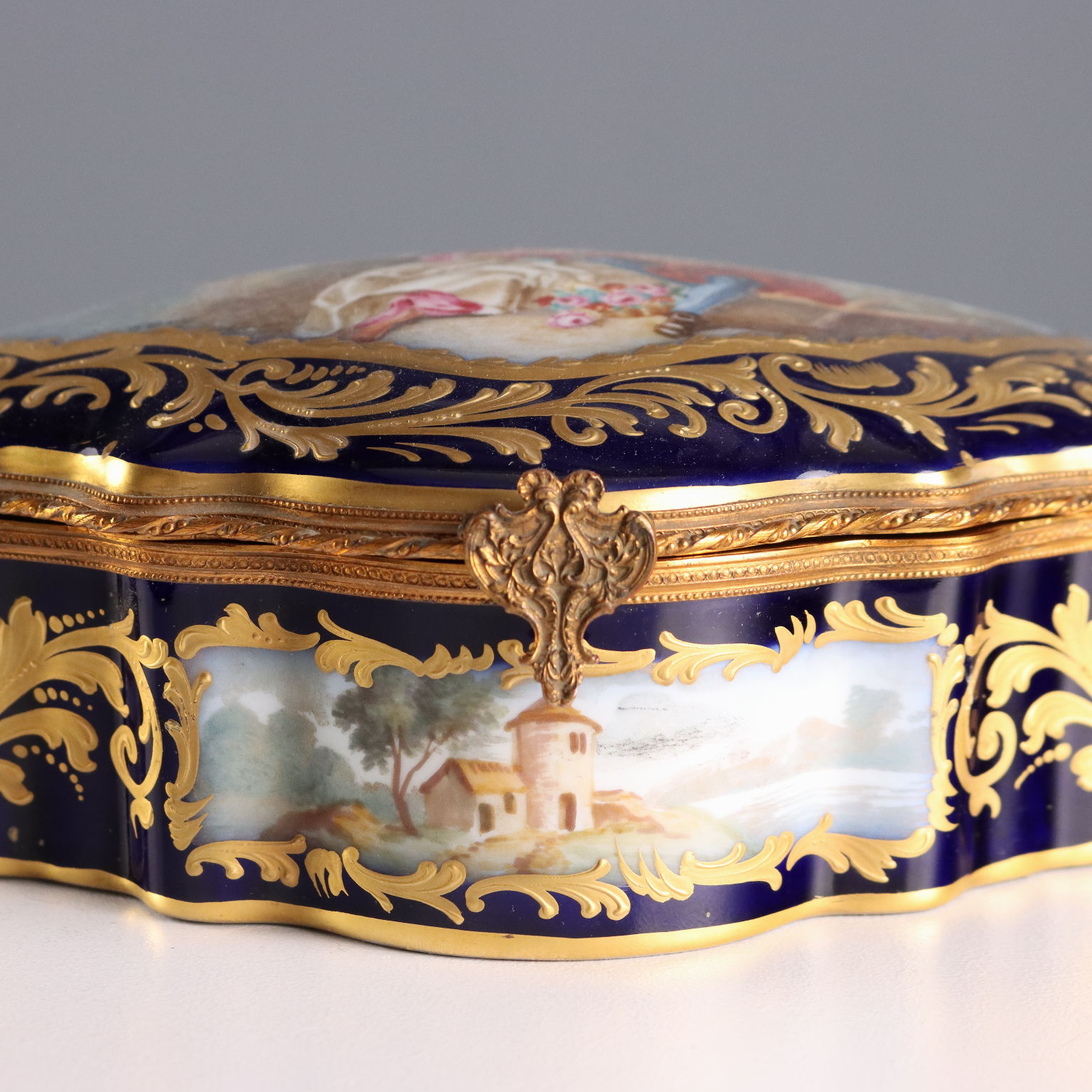 Scatola in porcellana in blu cobalto con ricchi decori in oro a volute fogliacee. Nelle riserve dipinti a paesaggio lacustre e sul coperchio scena galante. All'interno decori policromi a mazzetti di fiori. Sotto la base marchio della manifattura.