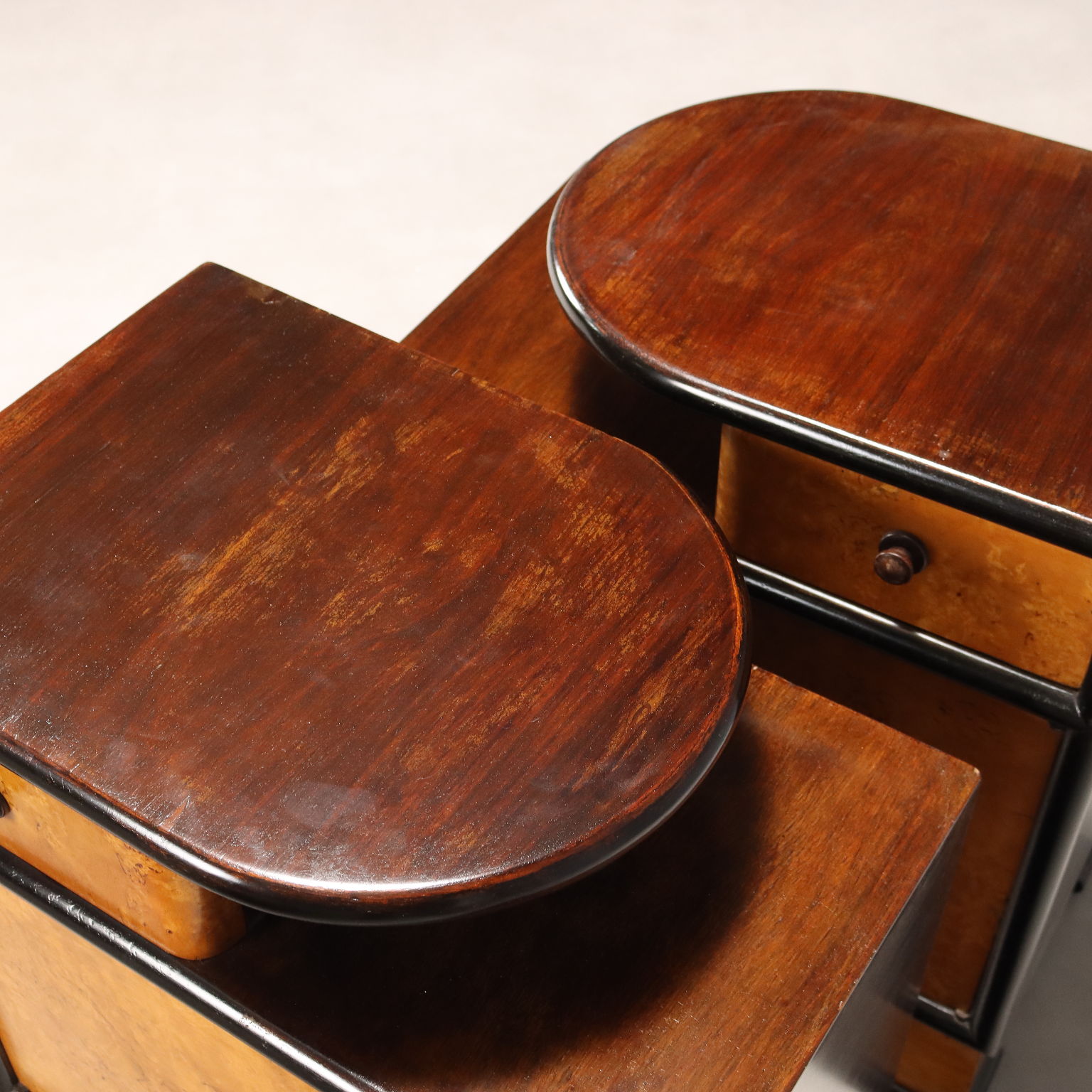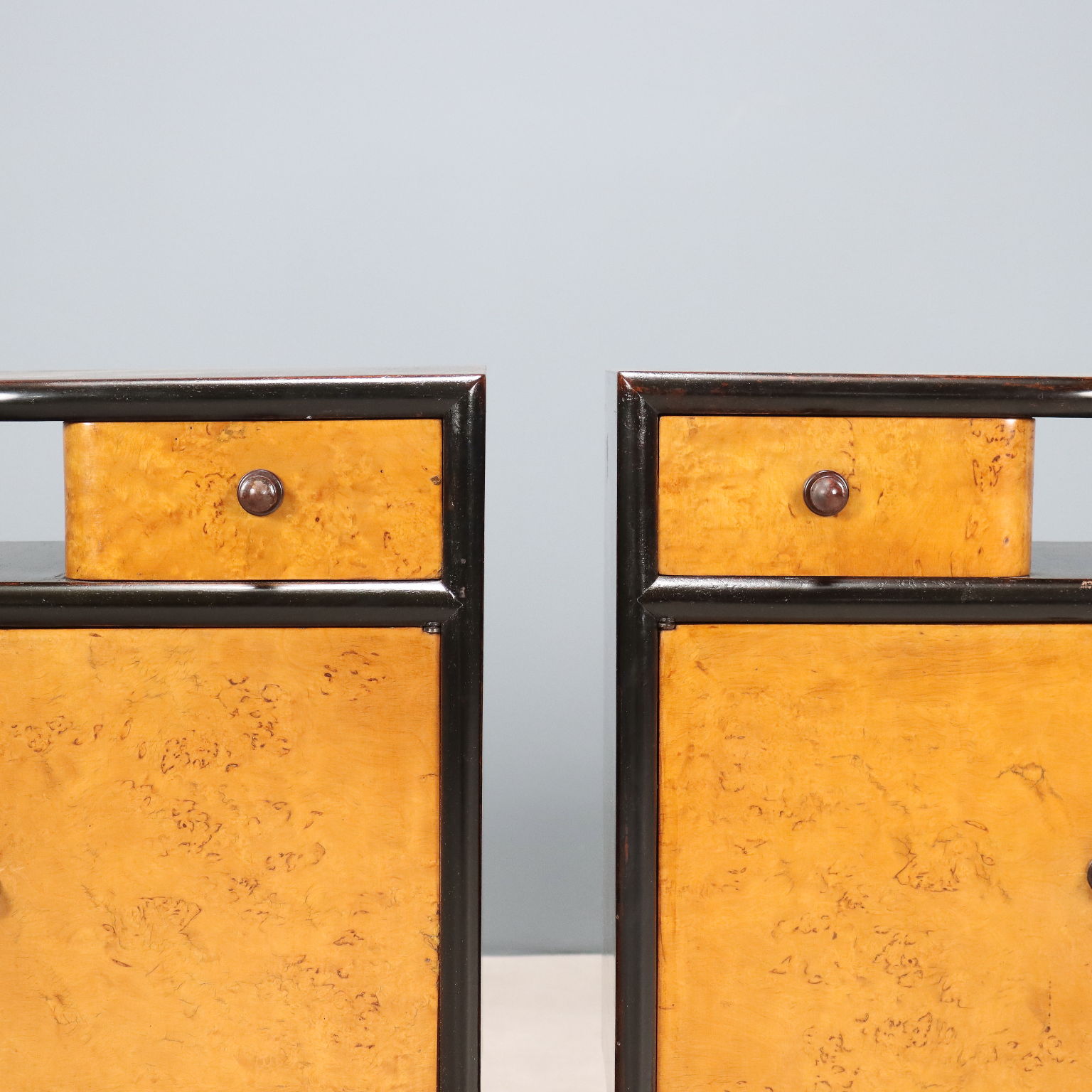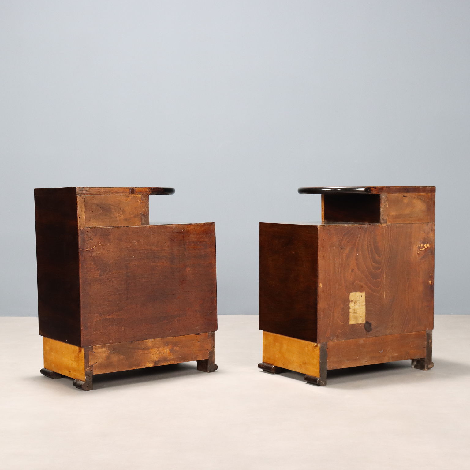 Coppia di comodini di gusto déco con impiallacciatura in legno esotico e radica.